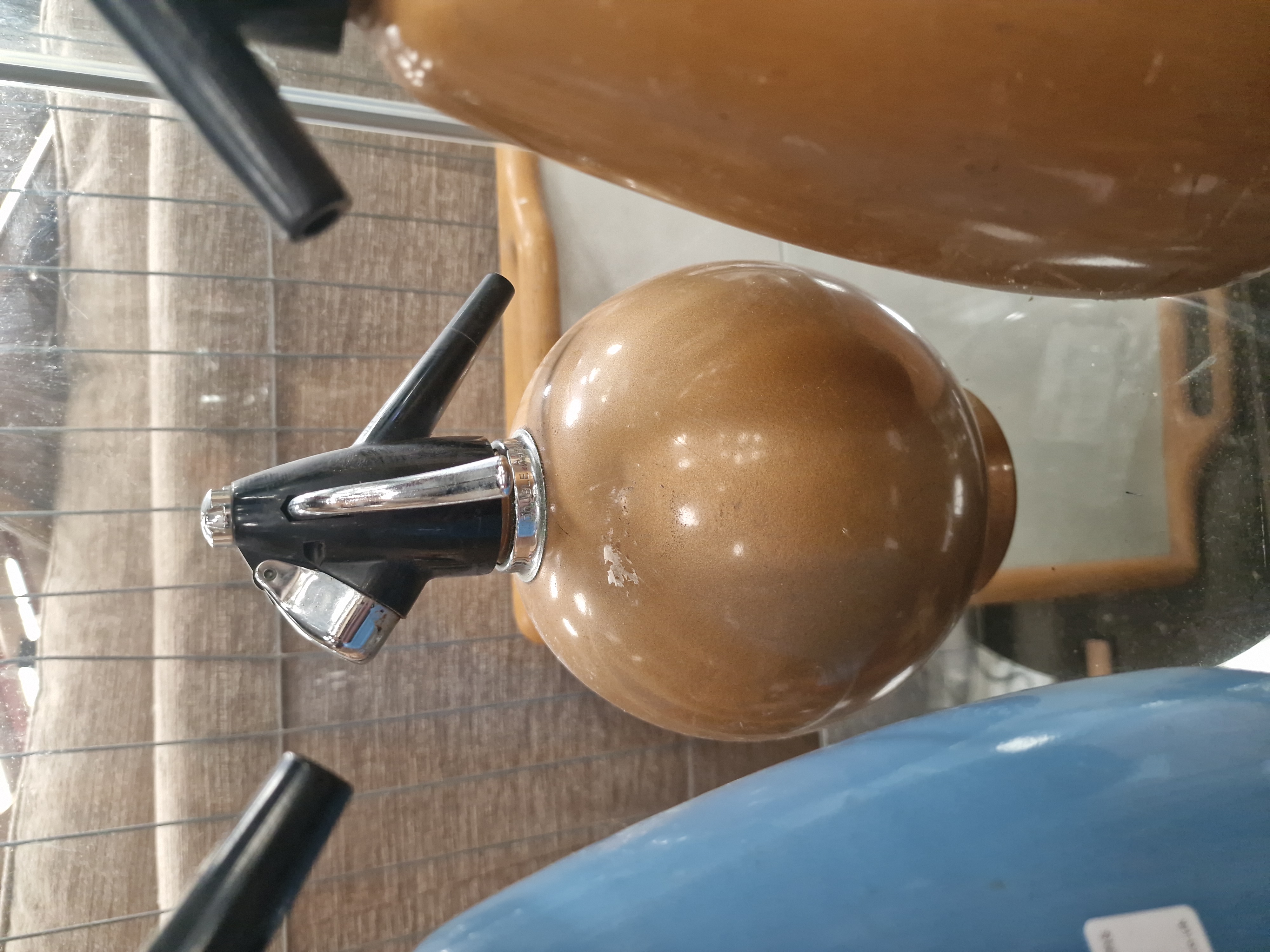 A trio of mid-20th century BOC Sparklets soda syphons manufactured in England. The collection comprises one sky blue ovoid-form syphon and two metallic gold-tone syphons, one of spherical form and one of ovoid form. The bodies are constructed from metal with coloured finishes, each fitted with a black composite and chrome-plated syphon head. The chrome collars are stamped with the marks SPARKLETS and MADE IN ENGLAND. These items are associated with the 1960s and 1970s production period.