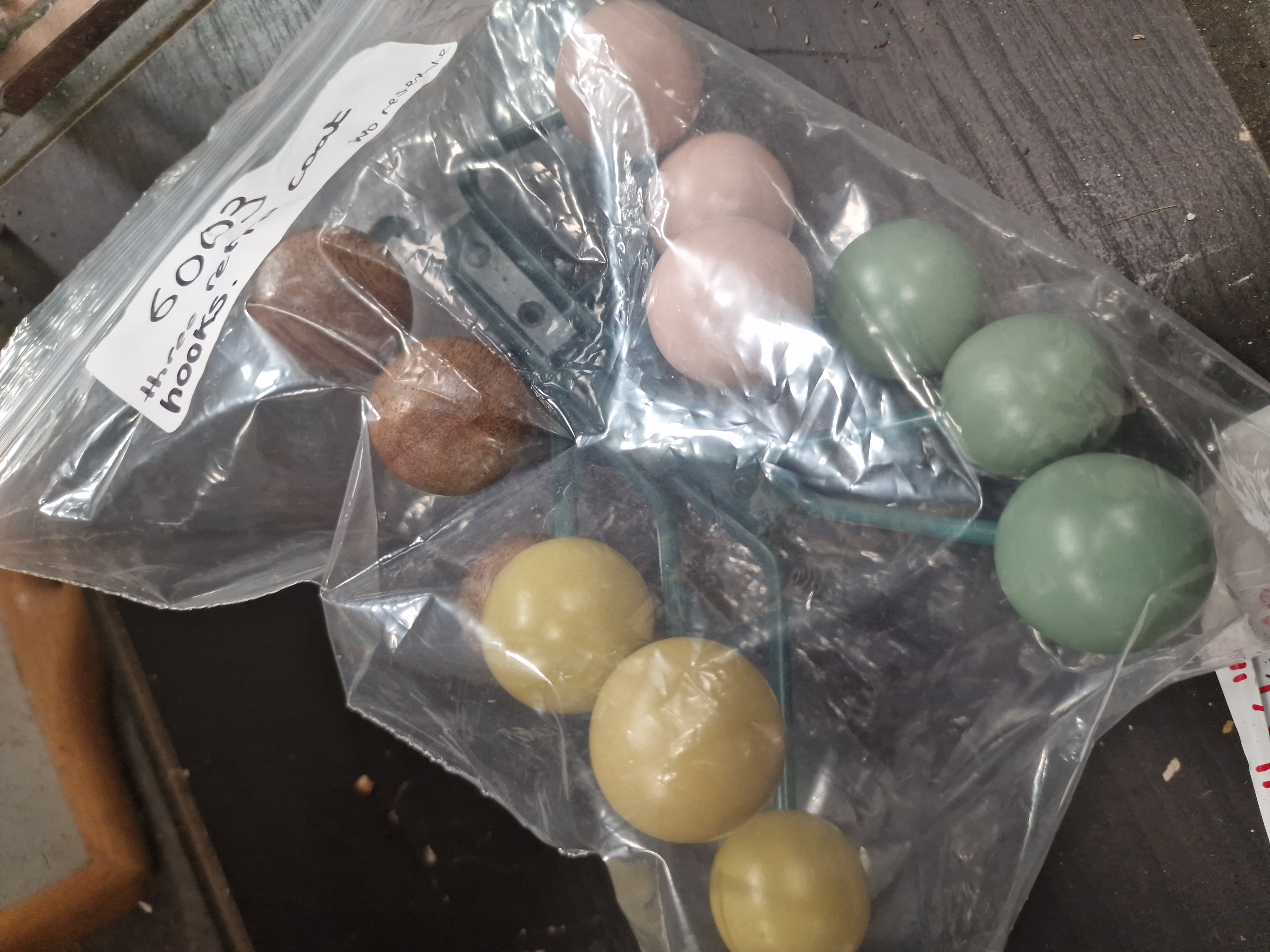 The items appear to be in good overall condition and are contained within a clear plastic bag. There is no visible damage, structural distortion, or significant wear to the frames or finials.