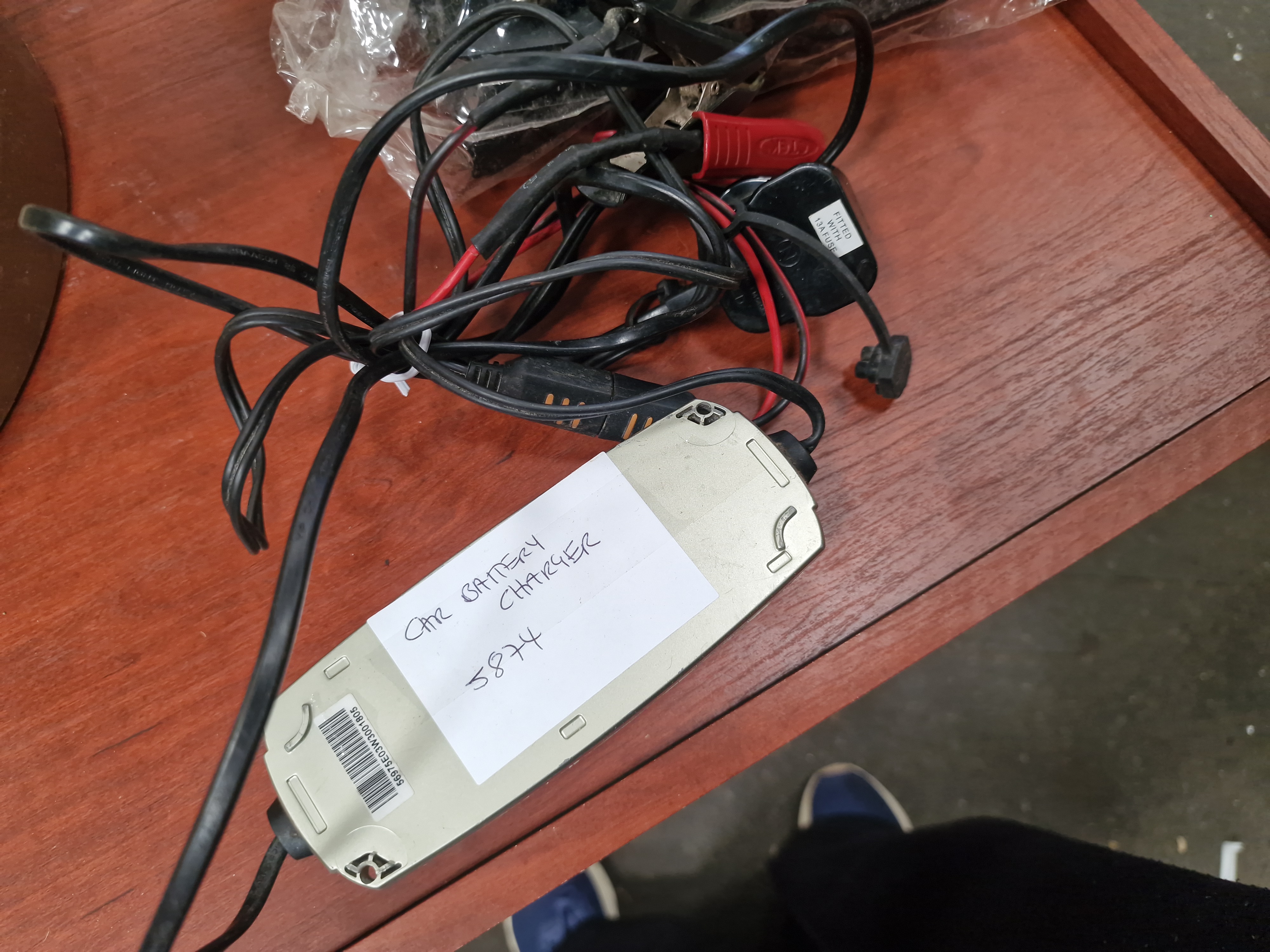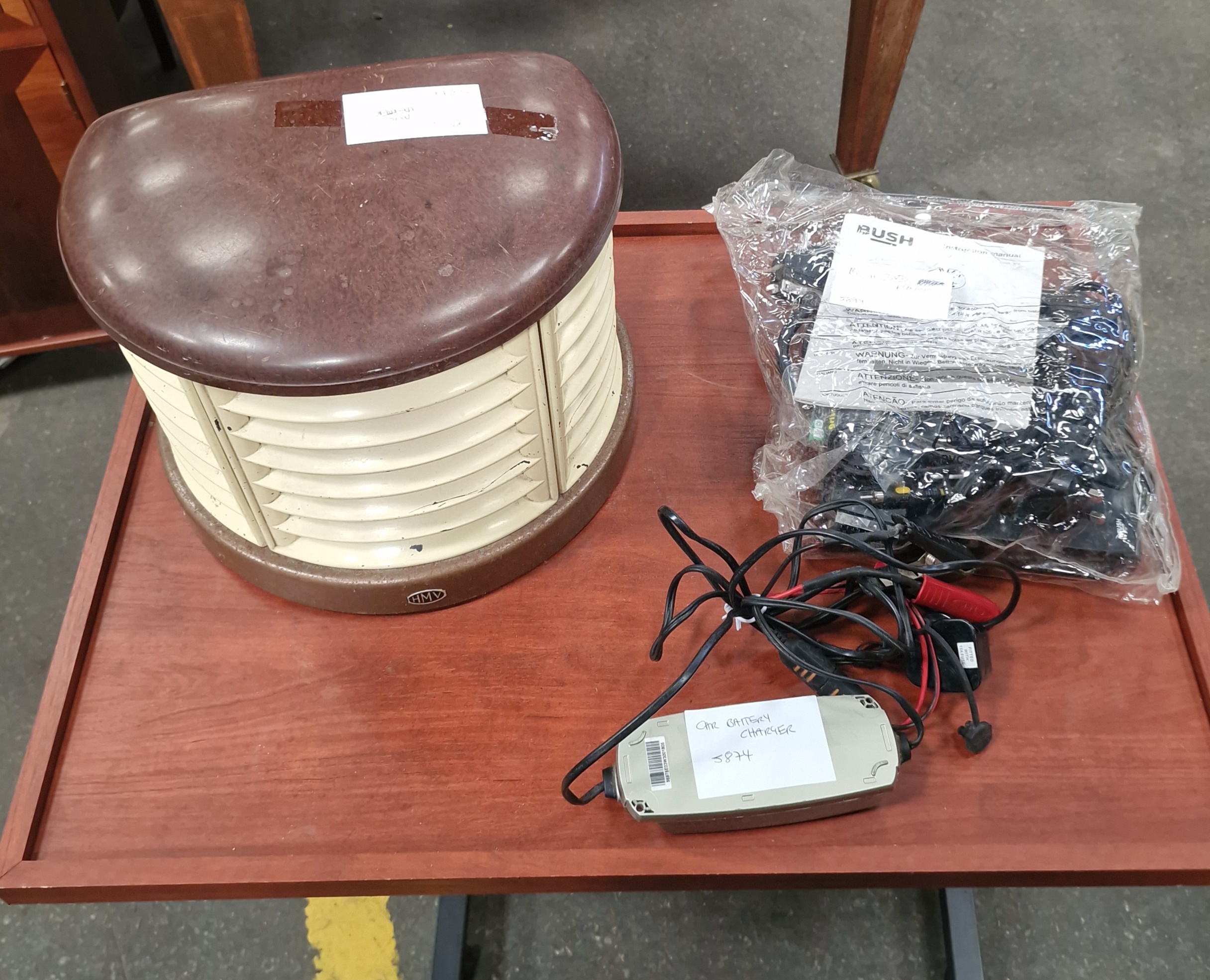 This lot comprises three electrical items. The first is a mid-century HMV (His Master’s Voice) electric space heater of semicircular design. The construction features a mottled brown Bakelite top and base with cream-painted metal horizontal louvres. The HMV manufacturer mark is visible within a small oval on the base of the unit. The second item is a Bush portable DVD player, presented in a plastic bag with an accompanying instruction manual and a set of assorted connection cables. The third item is a slimline car battery charger with a silver-toned plastic casing. This unit includes a power cable fitted with a 13A fused UK plug and two charging leads terminated with red and black alligator clips. A barcode sticker on the charger reads 56975E03W3001805.