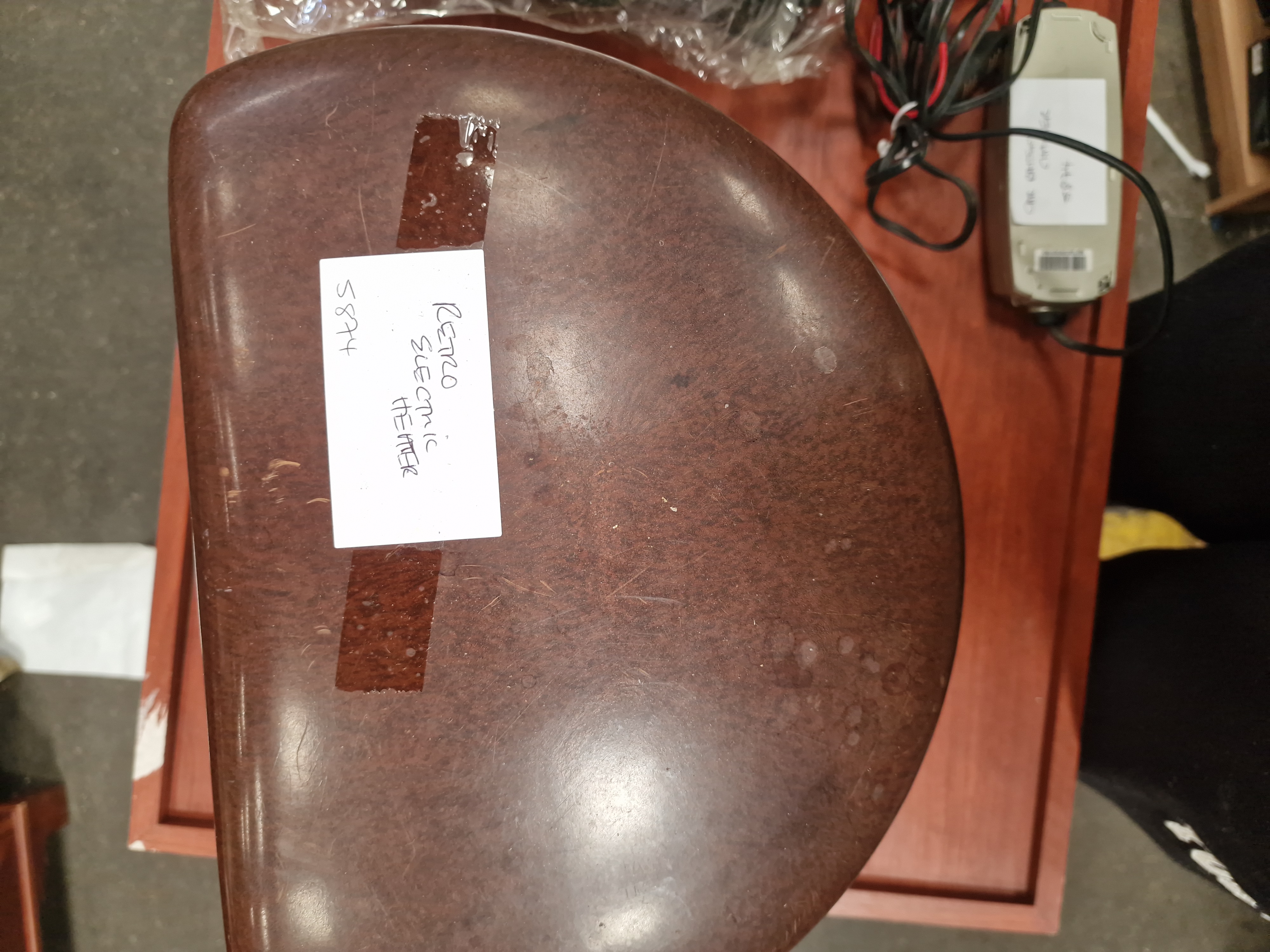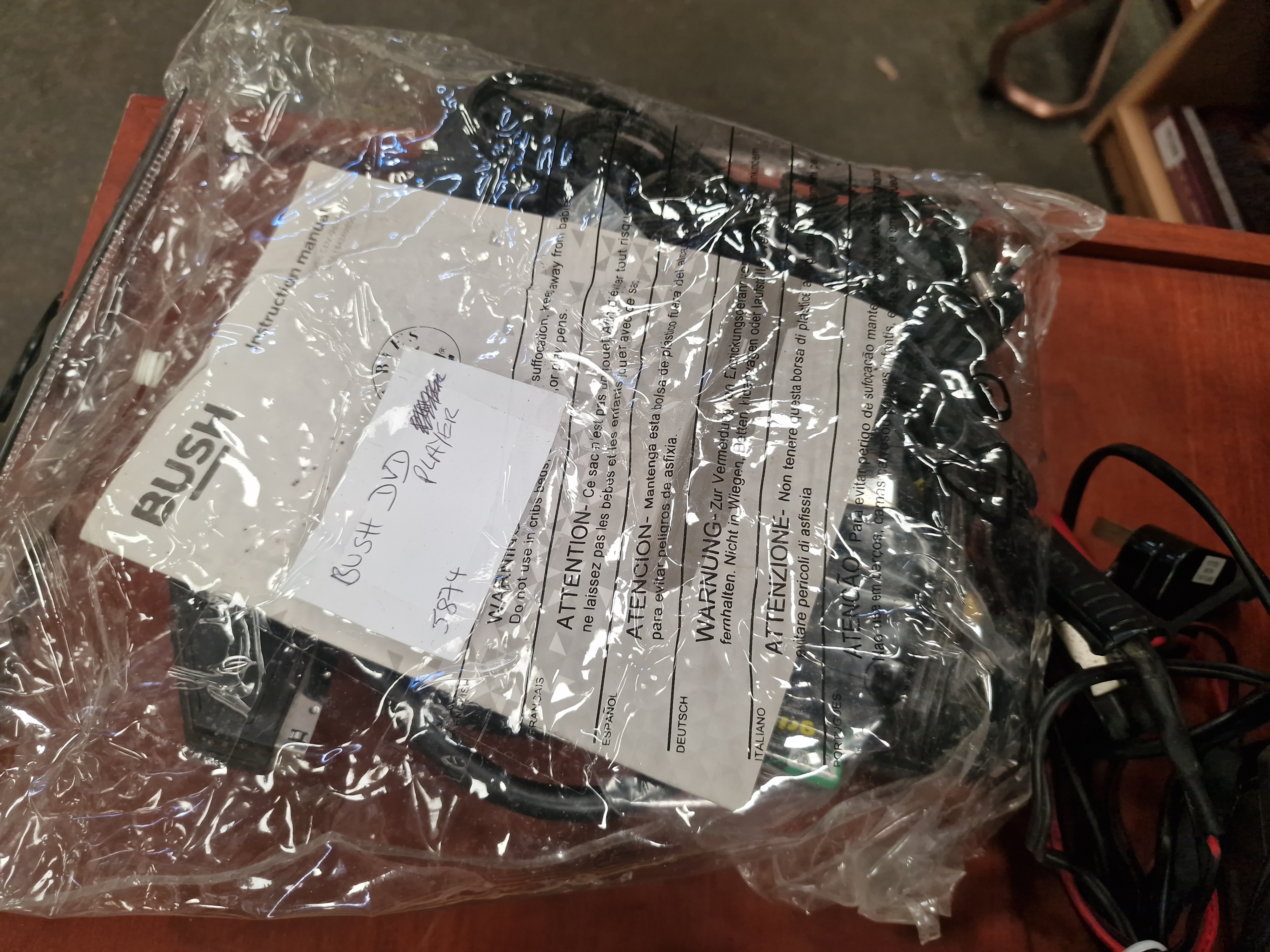 The HMV heater is in fair condition, showing visible surface scratches and marks to the Bakelite top surface; no power cable is attached. The Bush DVD player and the car battery charger are in used condition. All electrical items in this lot are sold as decorative or for parts and restoration only. They have not been PAT tested or checked for working order. Professional electrical testing is recommended prior to any use.