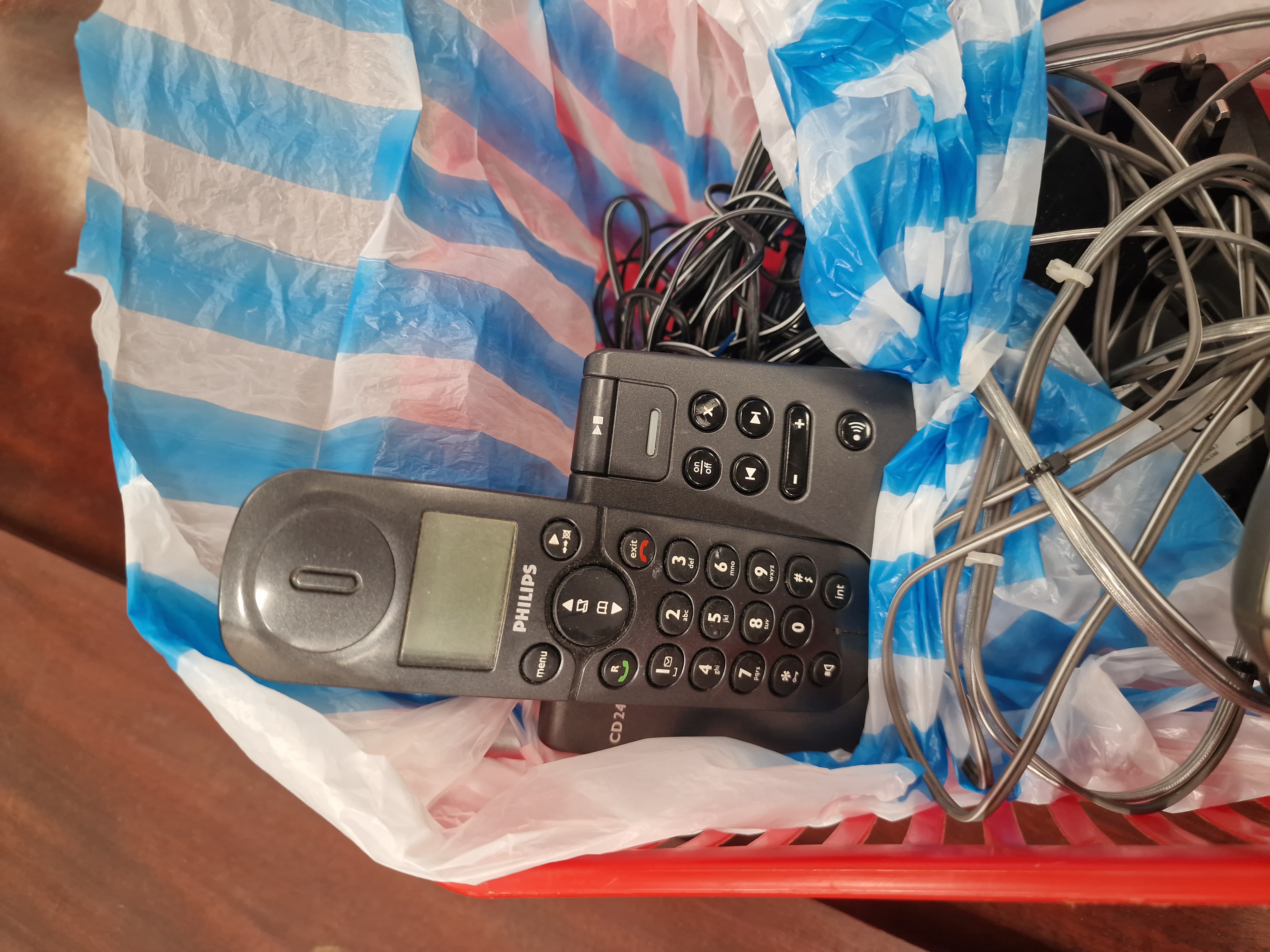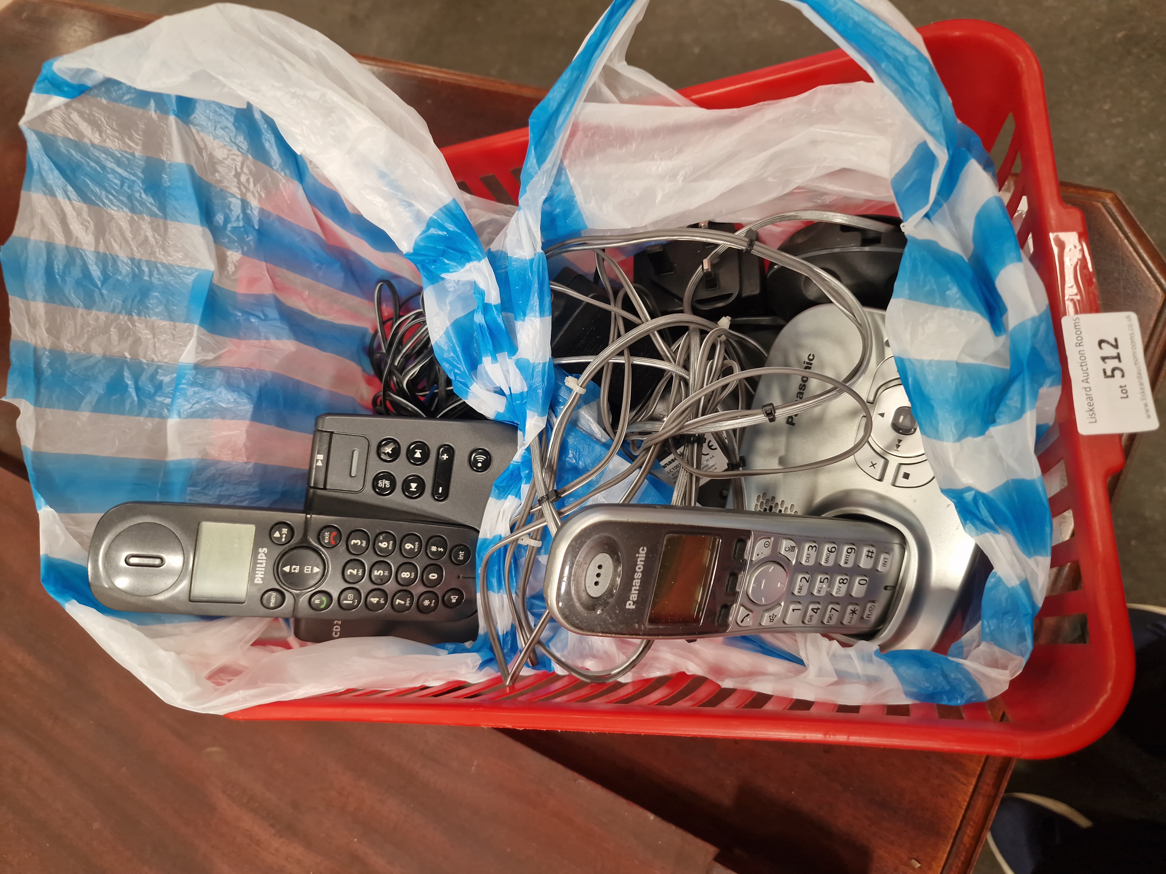 A lot comprising two digital cordless telephone systems with associated accessories. The first system is a Panasonic silver-toned handset with a matching base station featuring integrated digital answering machine controls, including play, stop, skip, and volume buttons. Both components bear the Panasonic mark. The second system is a Philips CD24 series black handset and base station, with the handset marked Philips and the base station marked CD24. The lot includes various UK three-pin power adapters and telephone line cables. The components are constructed from plastic and are contained within a blue and white striped carrier bag inside a red plastic basket.