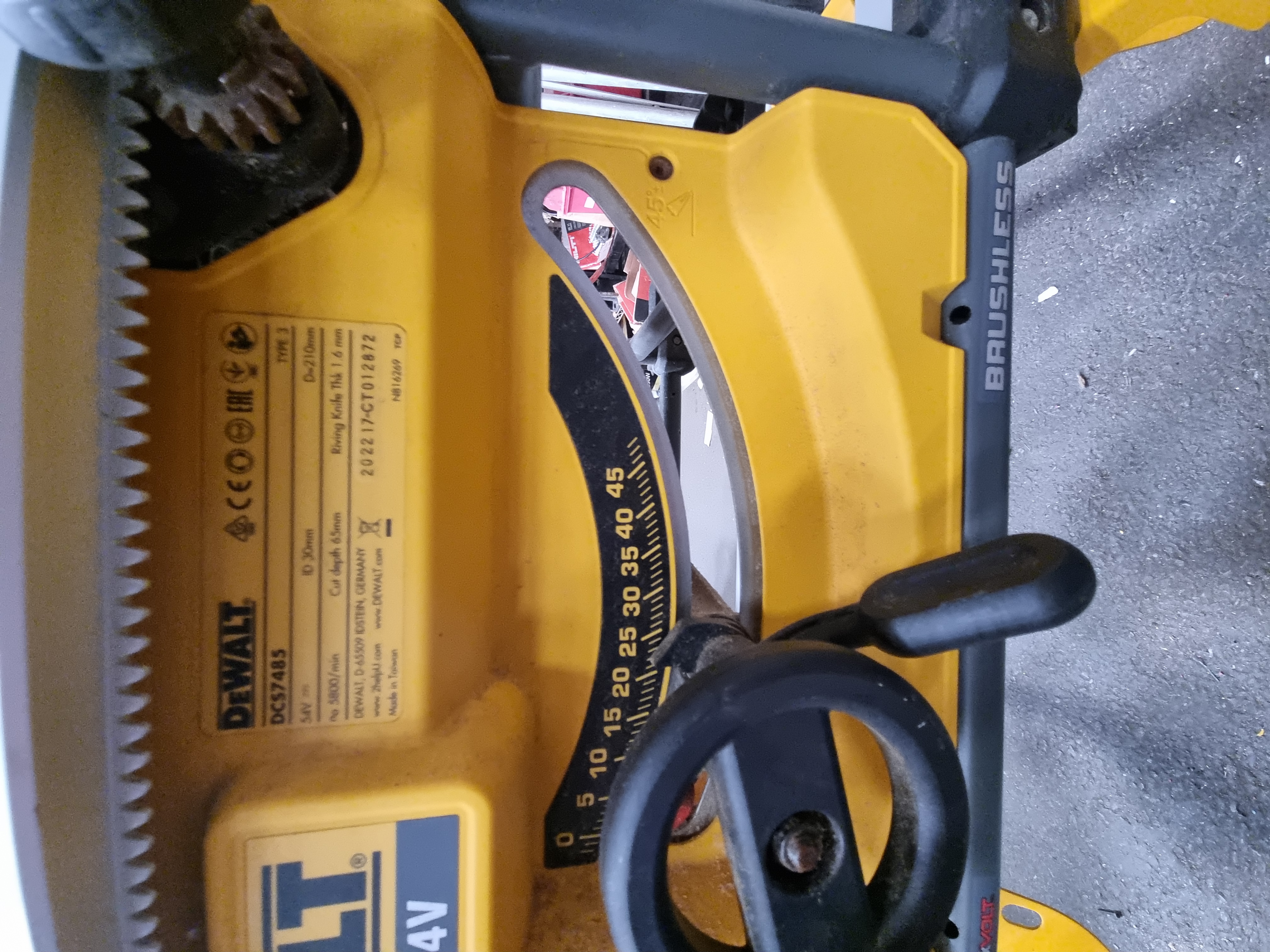 A DeWalt 8.25-inch portable table saw and aluminium rolling stand. The saw is identified by the manufacturer label as model DCS7485 Type 3, part of the 54V XR Flexvolt cordless range featuring a brushless motor. The unit is mounted on a DeWalt DE7400 heavy-duty mobile stand with folding legs and integrated wheels. Construction comprises a cast aluminium table top and a heavy-duty plastic housing. The tool is fitted with a 210mm blade and includes the transparent blade guard assembly, rip fence, and a black plastic push stick. Technical specifications on the label include a no-load speed of 5800/min and a riving knife thickness of 1.6mm. The tool was used for one job which was a campervan conversion.