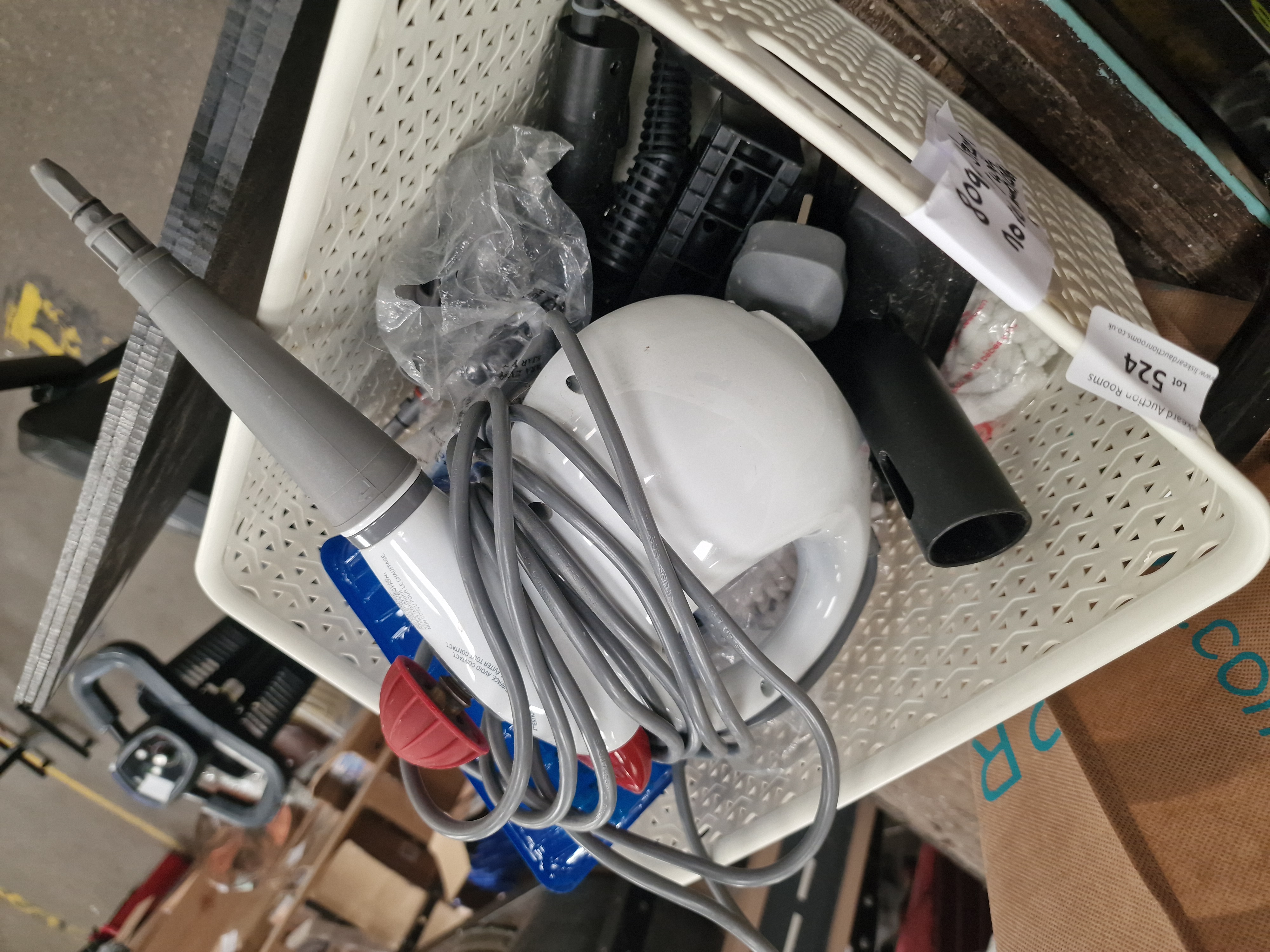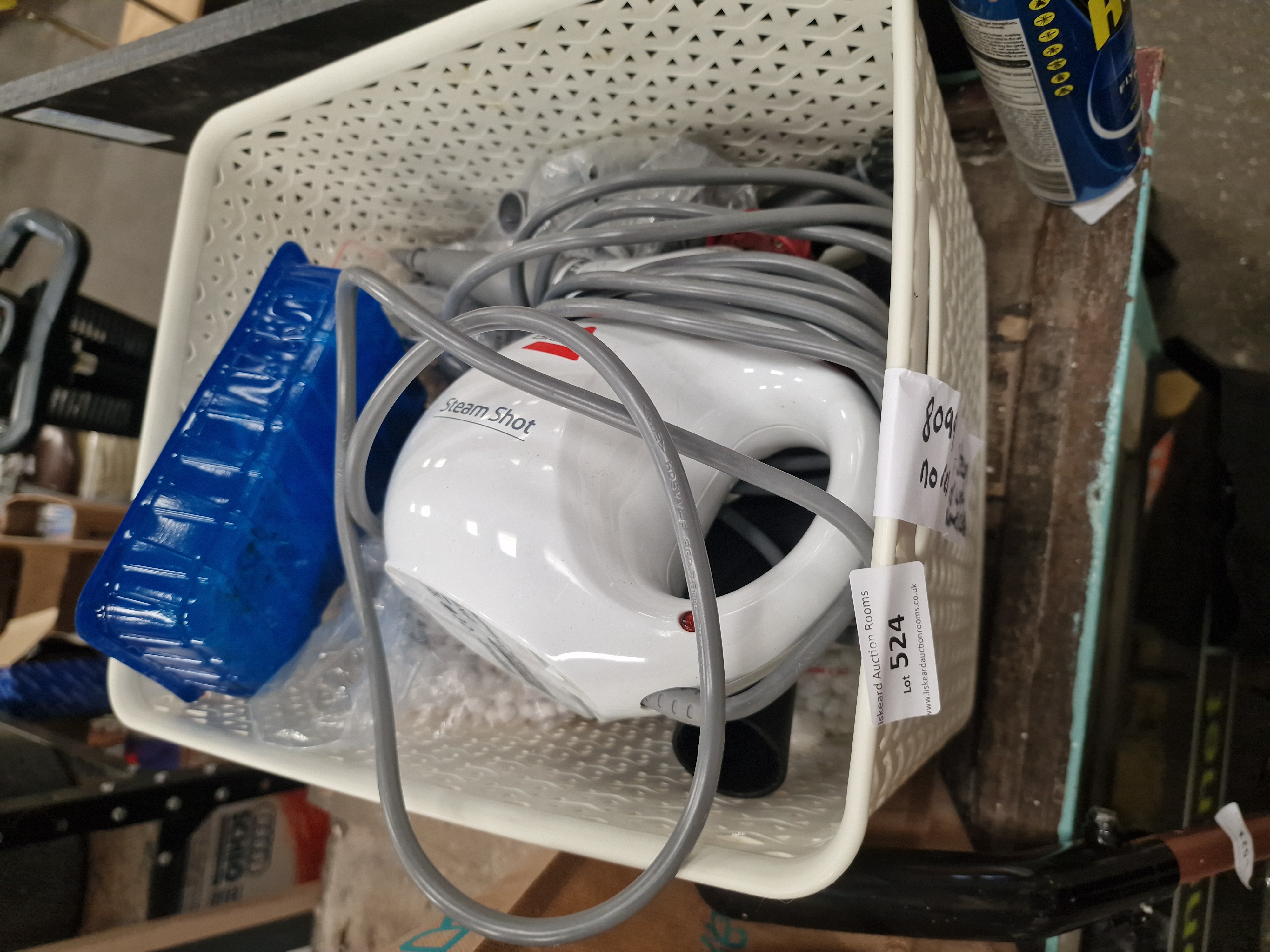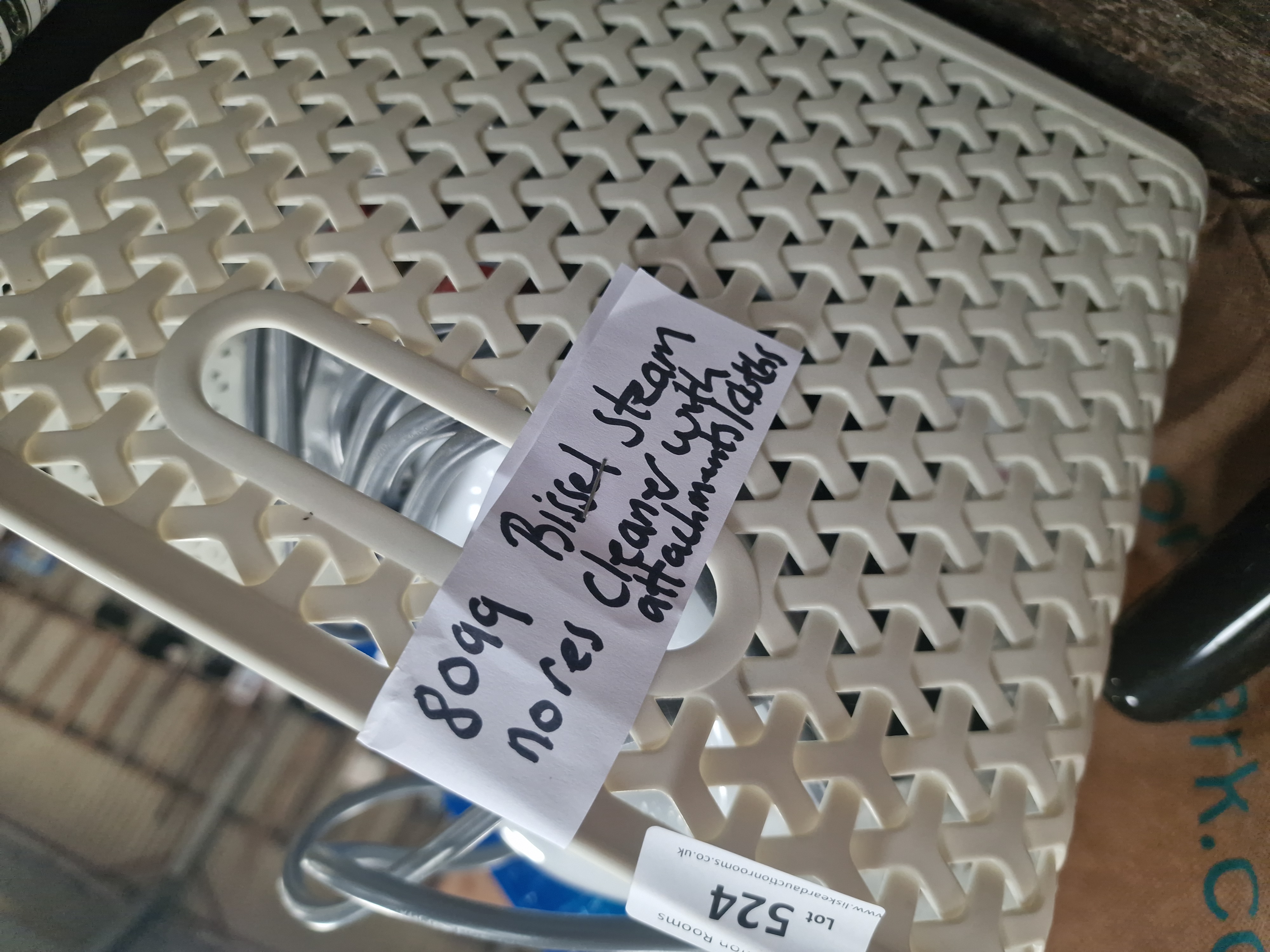 A Bissell Steam Shot handheld steam cleaner, presented in a cream plastic lattice-work storage basket. The handheld unit is constructed from white plastic and bears the manufacturer name BISSELL and the model designation Steam Shot. The lot includes a collection of accessories, featuring various nozzles and brushes, a flexible hose, a blue plastic measuring cup, and cleaning cloths. The appliance is fitted with a grey power cable and a standard UK three-pin plug. A handwritten note identifying the contents is included.