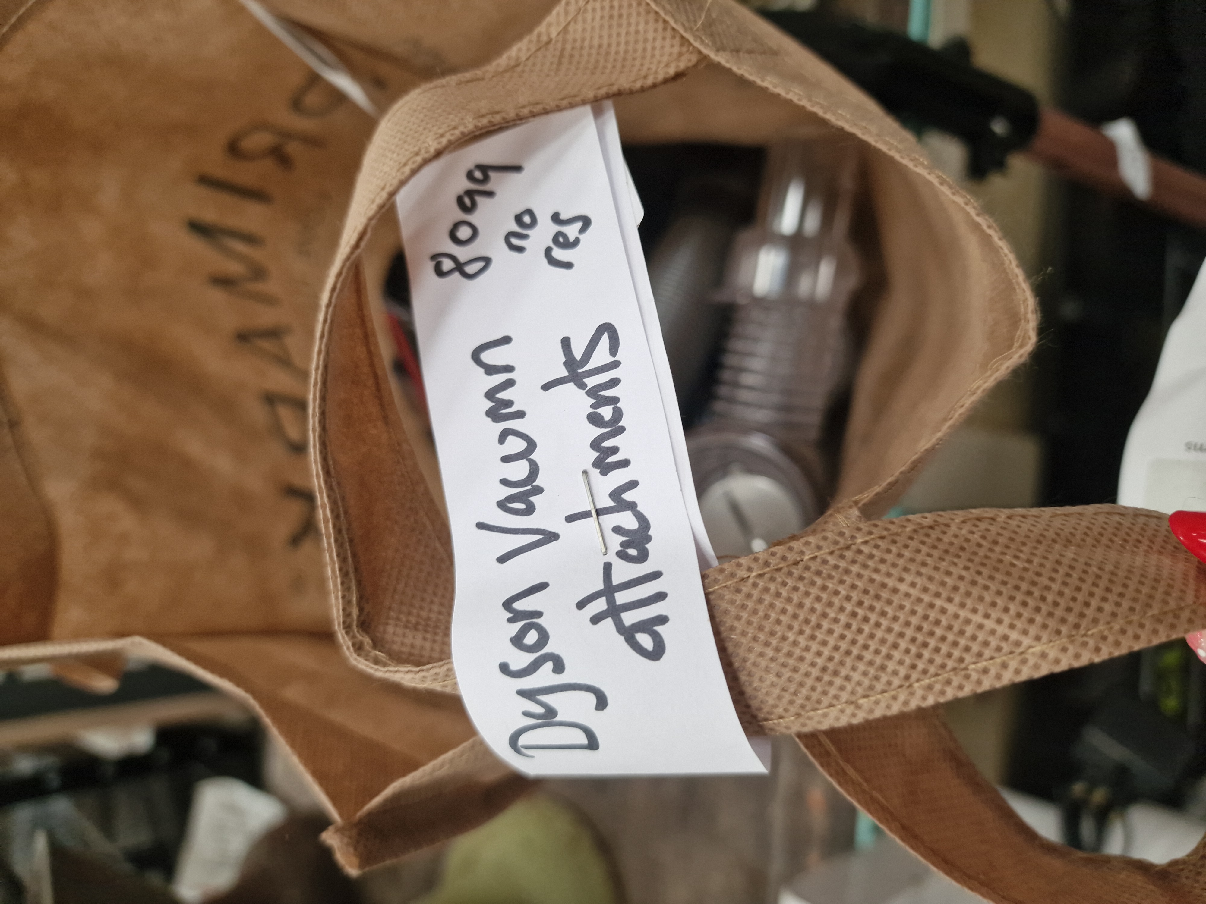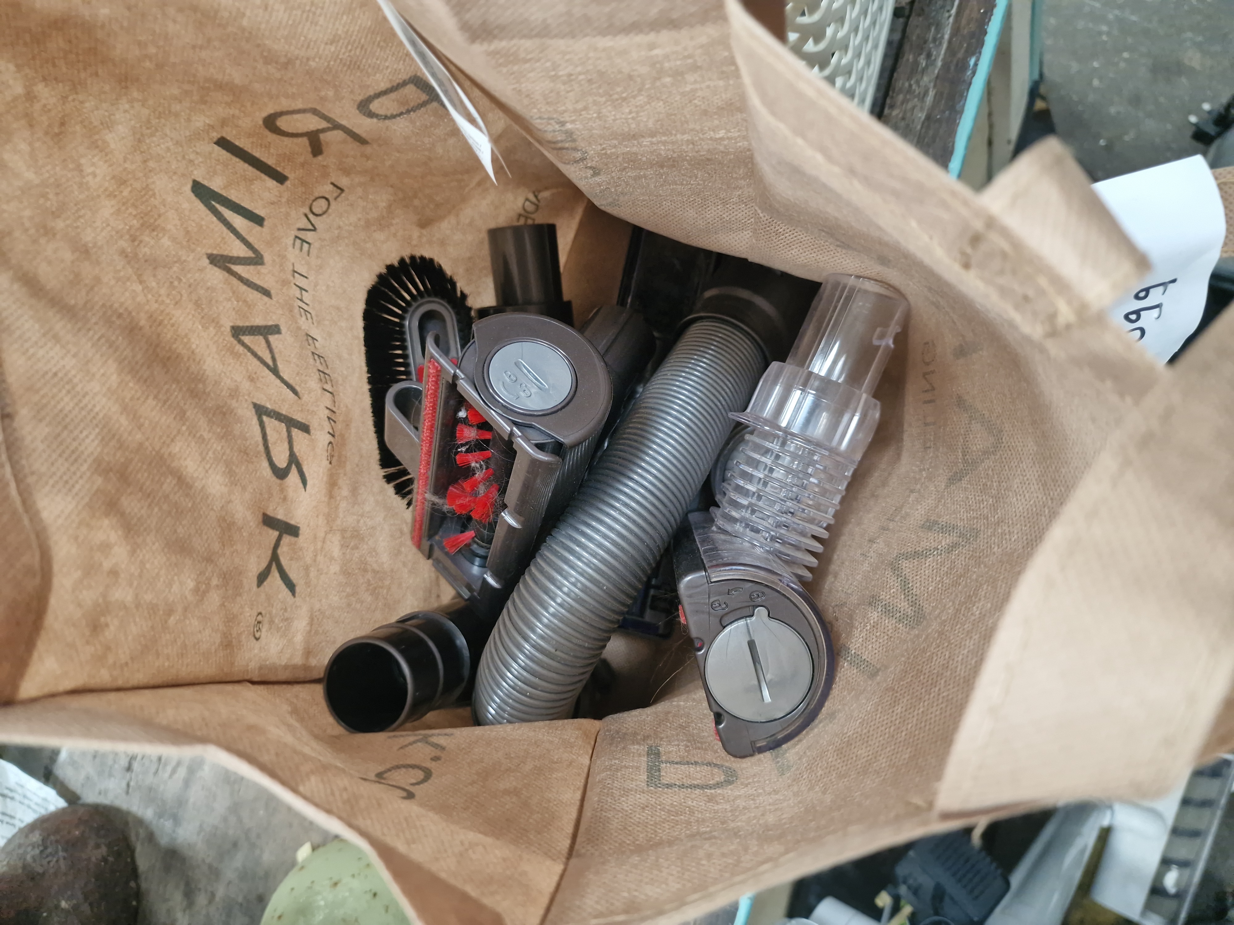 A collection of vacuum cleaner attachments and accessories, attributed to Dyson. The assortment includes a flexible grey stretch hose, a mini motorised tool featuring red bristles, a soft dusting brush, and several clear and grey plastic nozzles and crevice tools. The components are primarily constructed from moulded plastic and synthetic materials. The items are presented loose within a brown Primark-branded paper carrier bag which has a handwritten note attached reading Dyson Vacuum attachments 8099 no res. No manufacturer marks, specific model numbers, or serial numbers are visible on the individual components.