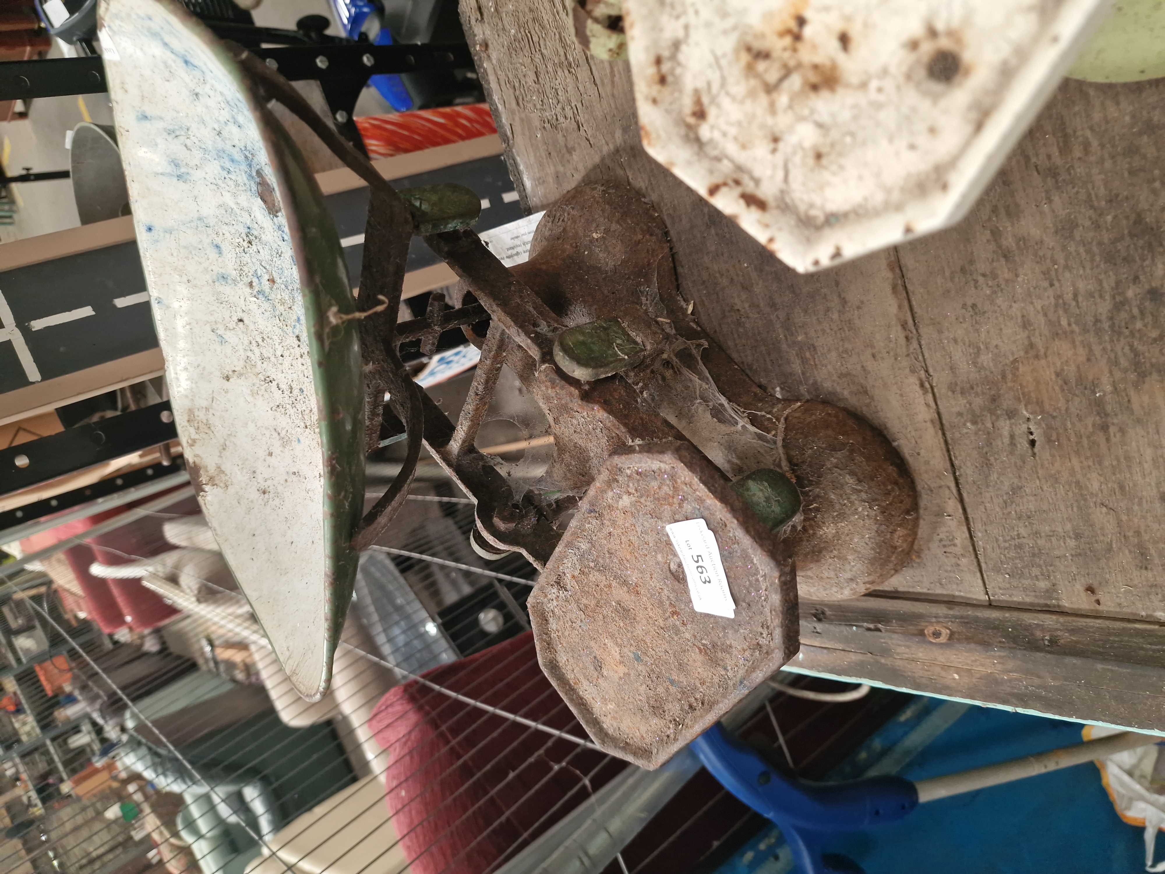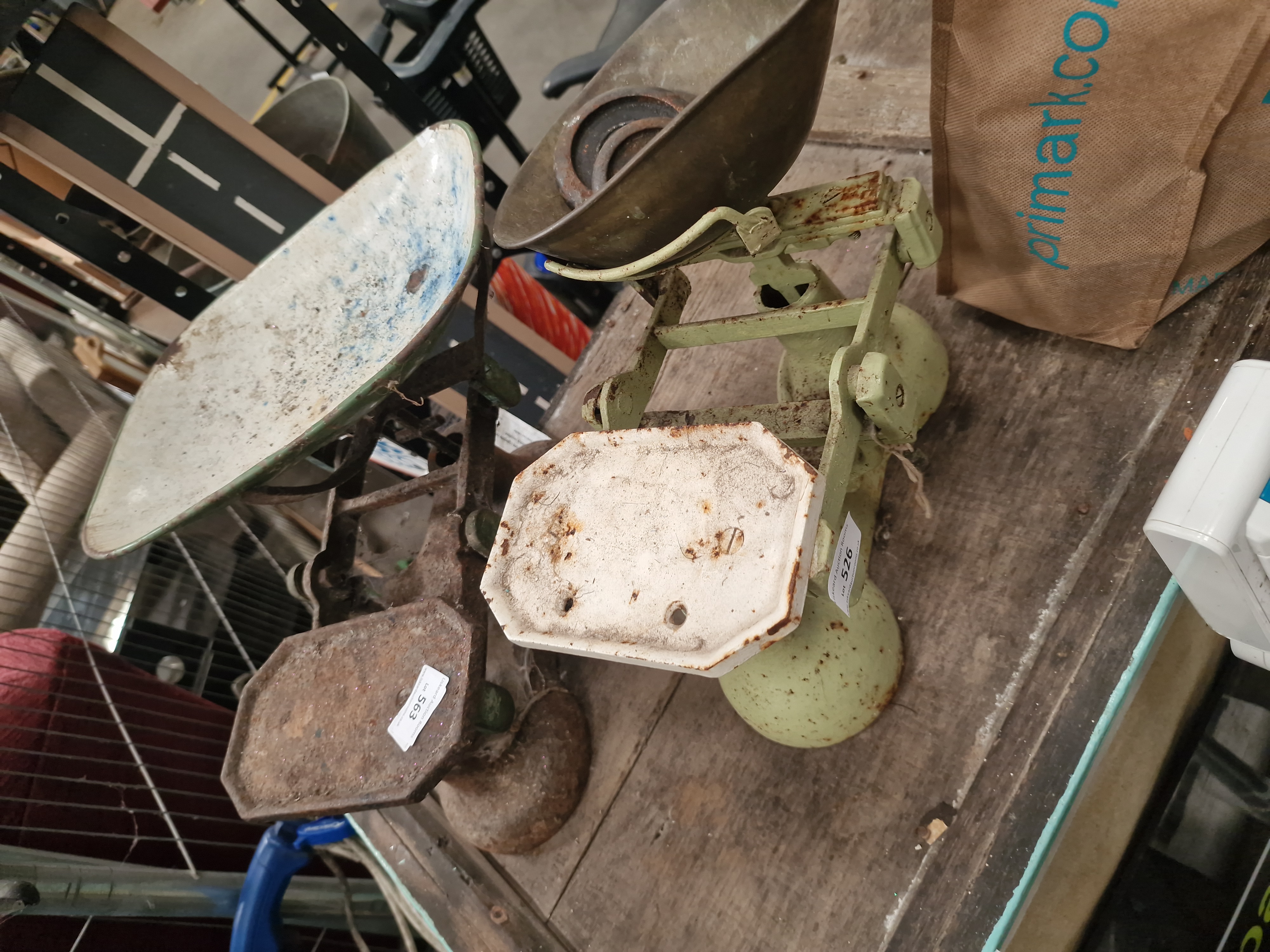 A lot comprising two individual sets of counter-balance kitchen scales of typical British domestic form. The first set, indicated by lot sticker 526, features a cast iron frame with a pale green painted finish, a scoop-form brass pan, and an octagonal white ceramic weight plate. The second set, indicated by lot sticker 563, is constructed of cast iron with significant surface oxidation, featuring a mottled blue and white enamelled metal scoop-form pan and an octagonal iron weight plate. The lot includes four circular cast iron weights. The weights bear the following cast inscriptions: 2 LB, 1 LB, 4 OZ, and 2 OZ. No manufacturer marks are visible on the frames or pans of either scale.
