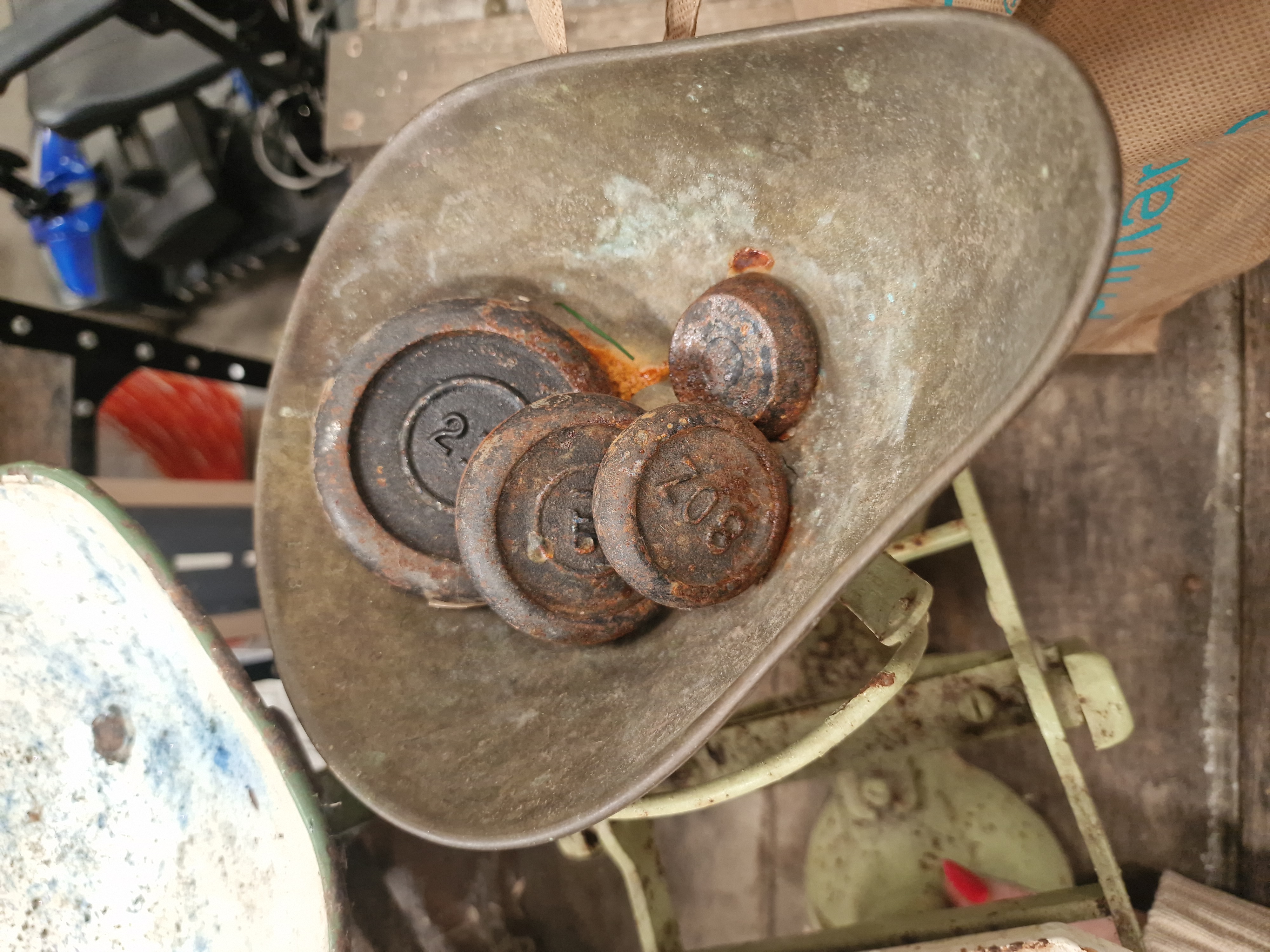 Both scales are in worn, antique condition consistent with age and domestic use. Significant surface oxidation, pitting, and paint loss are present across the cast iron frames and weights. The enamelled pan exhibits surface wear and minor chipping. Mechanical function and accuracy have not been verified. The items are sold as found.