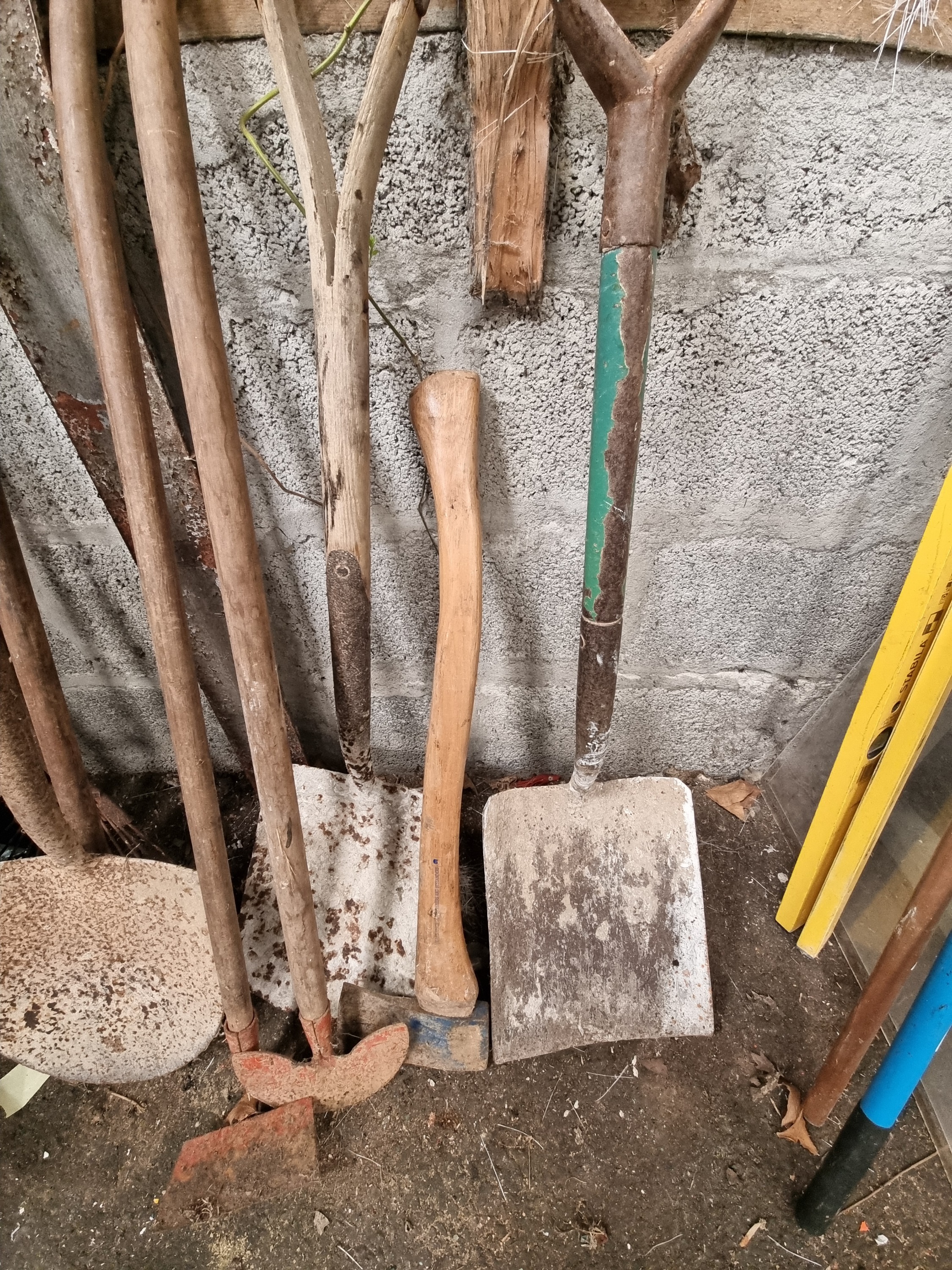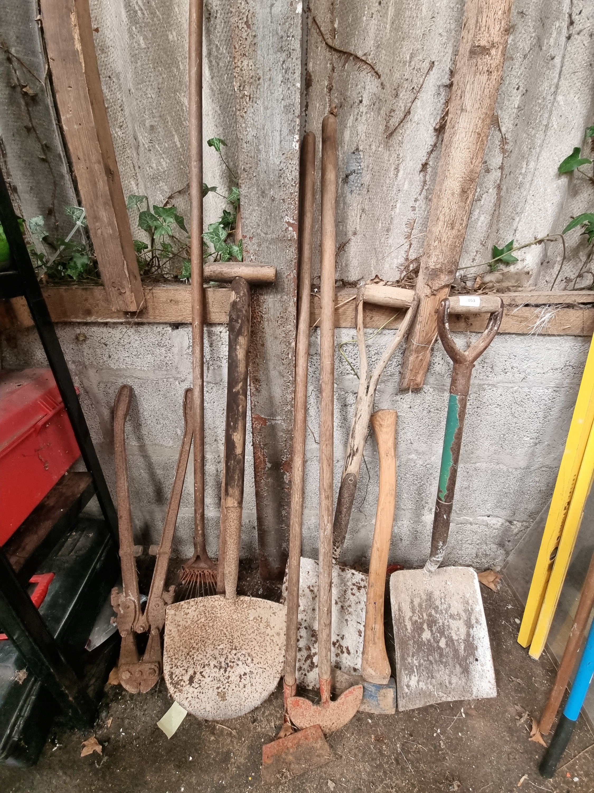 A collection of miscellaneous manual outdoor and agricultural hand tools. The lot includes a pair of heavy-duty bolt cutters with long handles and a pivot-jointed cutting head. Shovels and spades within the group comprise a T-handled pointed shovel, a long-handled square-mouth shovel, and a D-handled square-mouth shovel with a partially green-painted metal shaft. Garden and edging tools include a half-moon edging iron, a square-bladed hoe, a crescent-shaped Dutch-style hoe, and a garden rake. Also present is a felling axe featuring a wooden haft and a metal head with remnants of blue paint. A yellow-bodied spirit level is included, marked with the manufacturer name Stabila. The tools are manufactured from forged or pressed steel with turned wooden handles. A white rectangular inventory sticker with the characters 053 is present on one shovel handle.