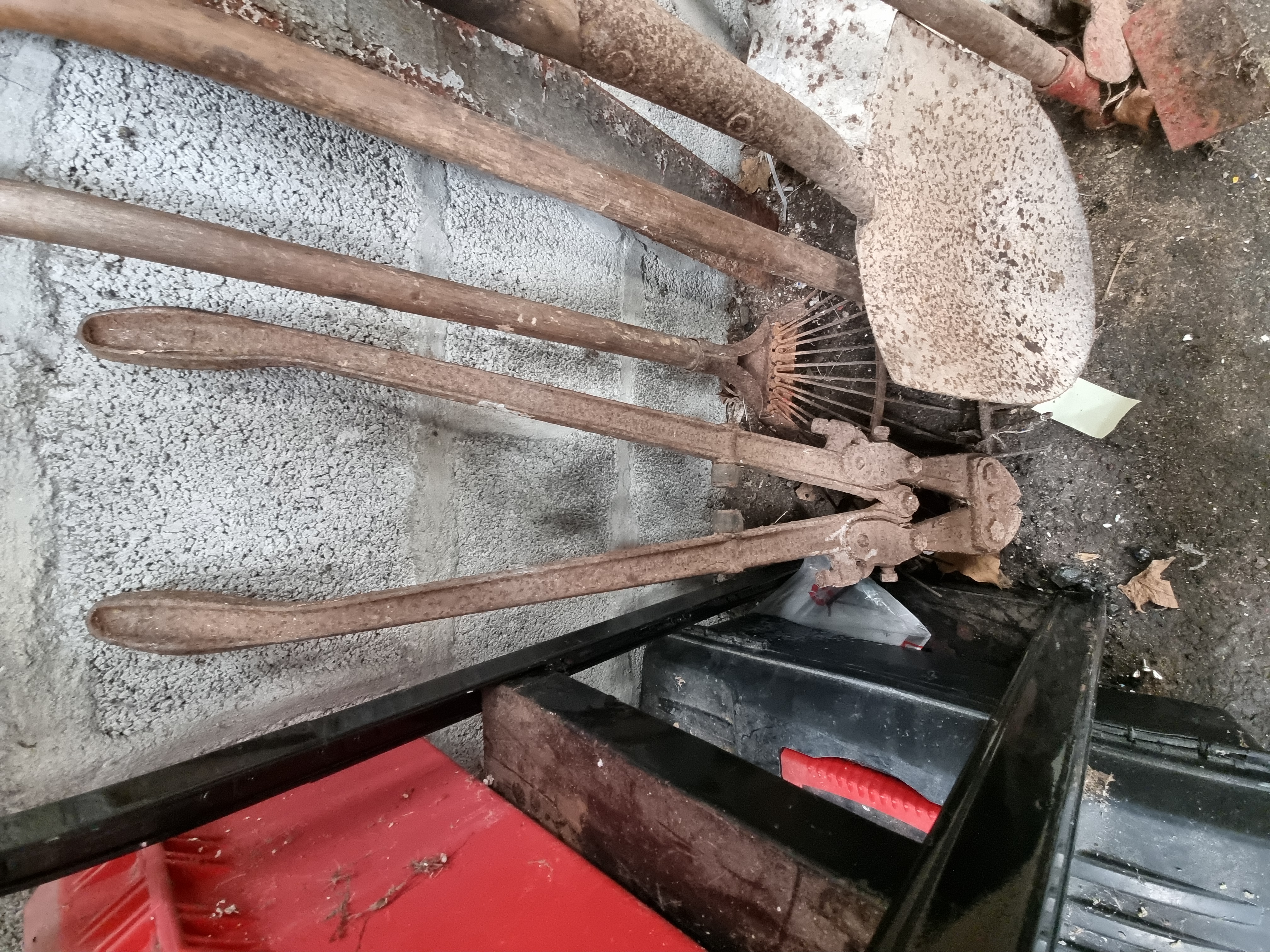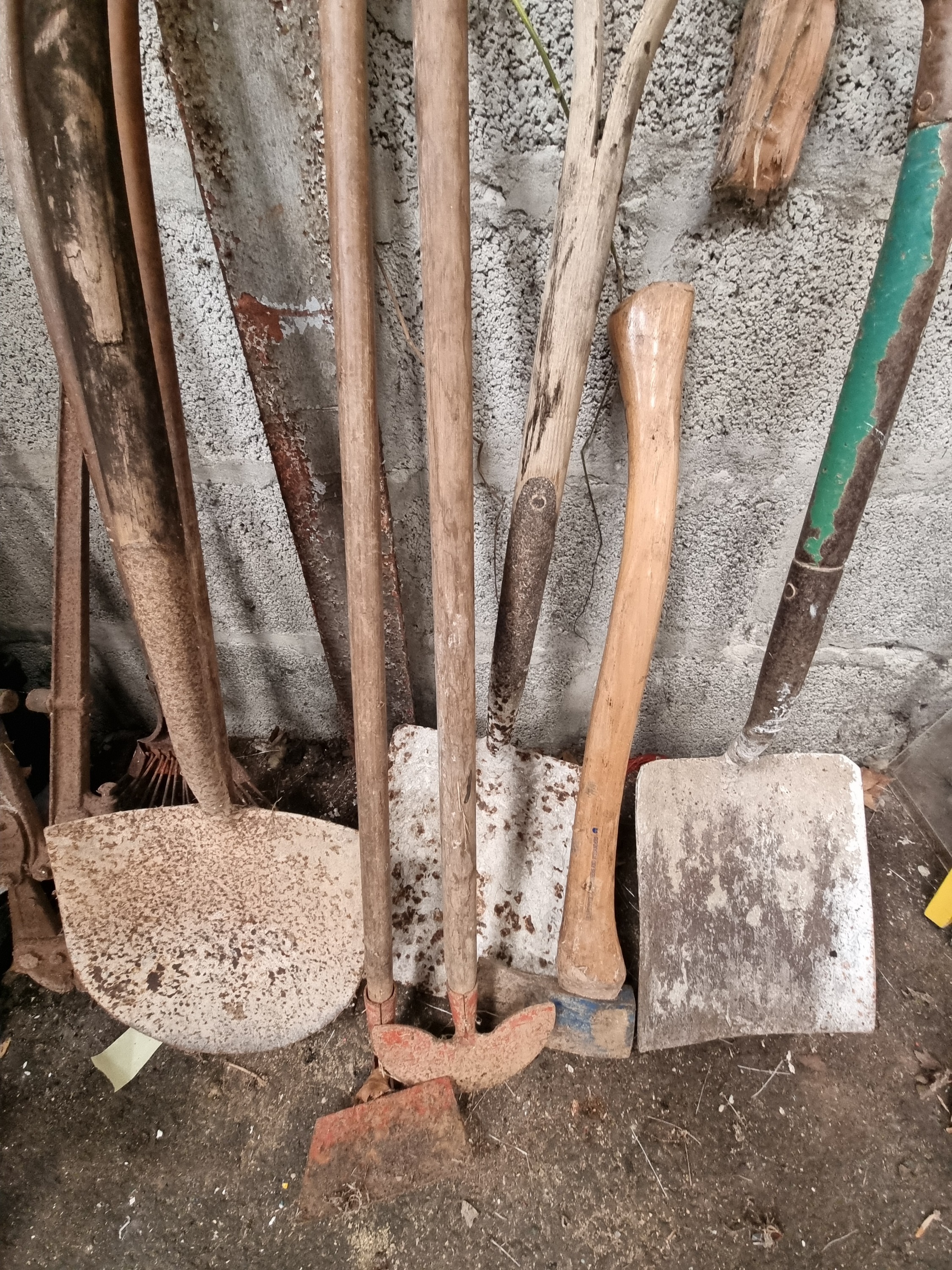 The collection is in a heavily used, as-found condition. All metal components exhibit significant surface oxidation and rust. The wooden handles are weathered with visible grain lifting and signs of prolonged outdoor exposure. The tools appear structurally complete but require restoration and sharpening.