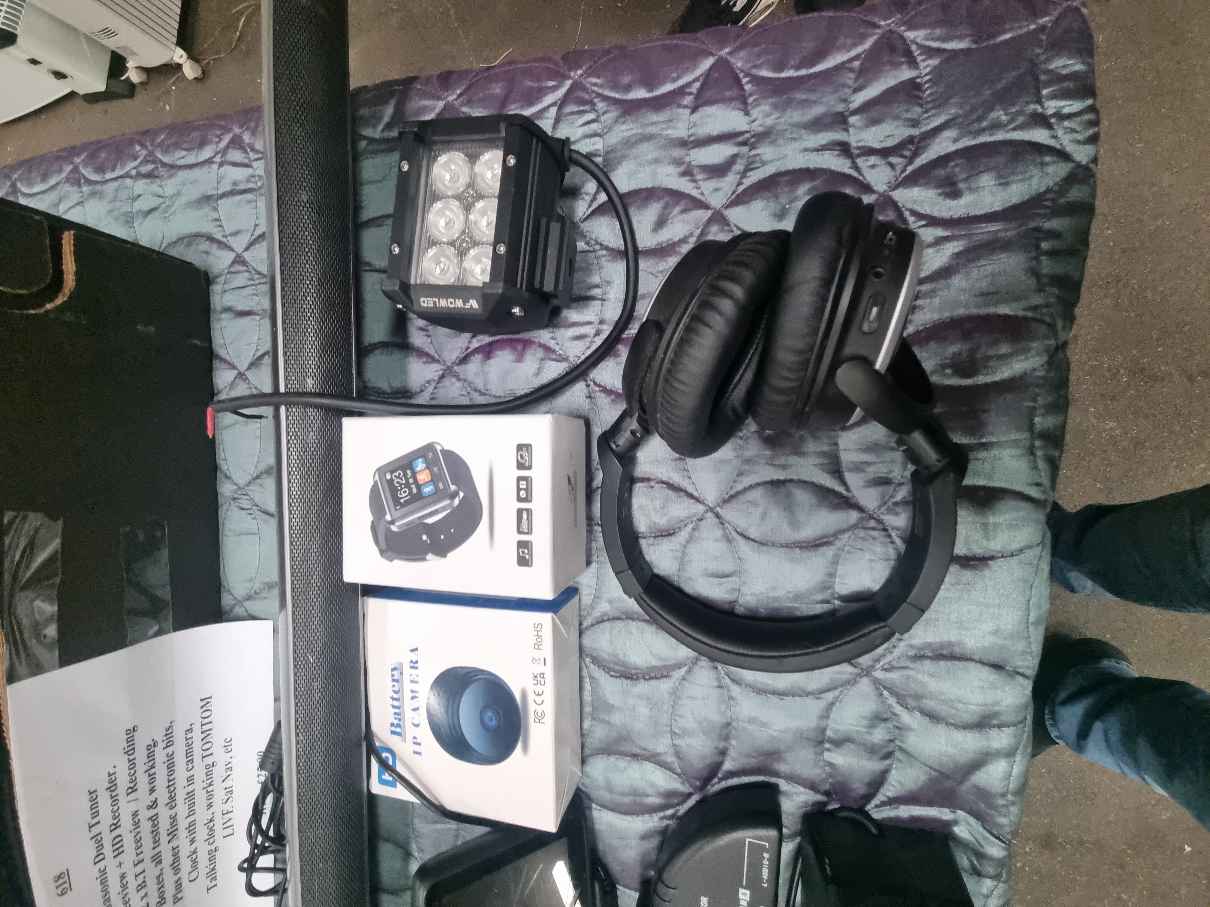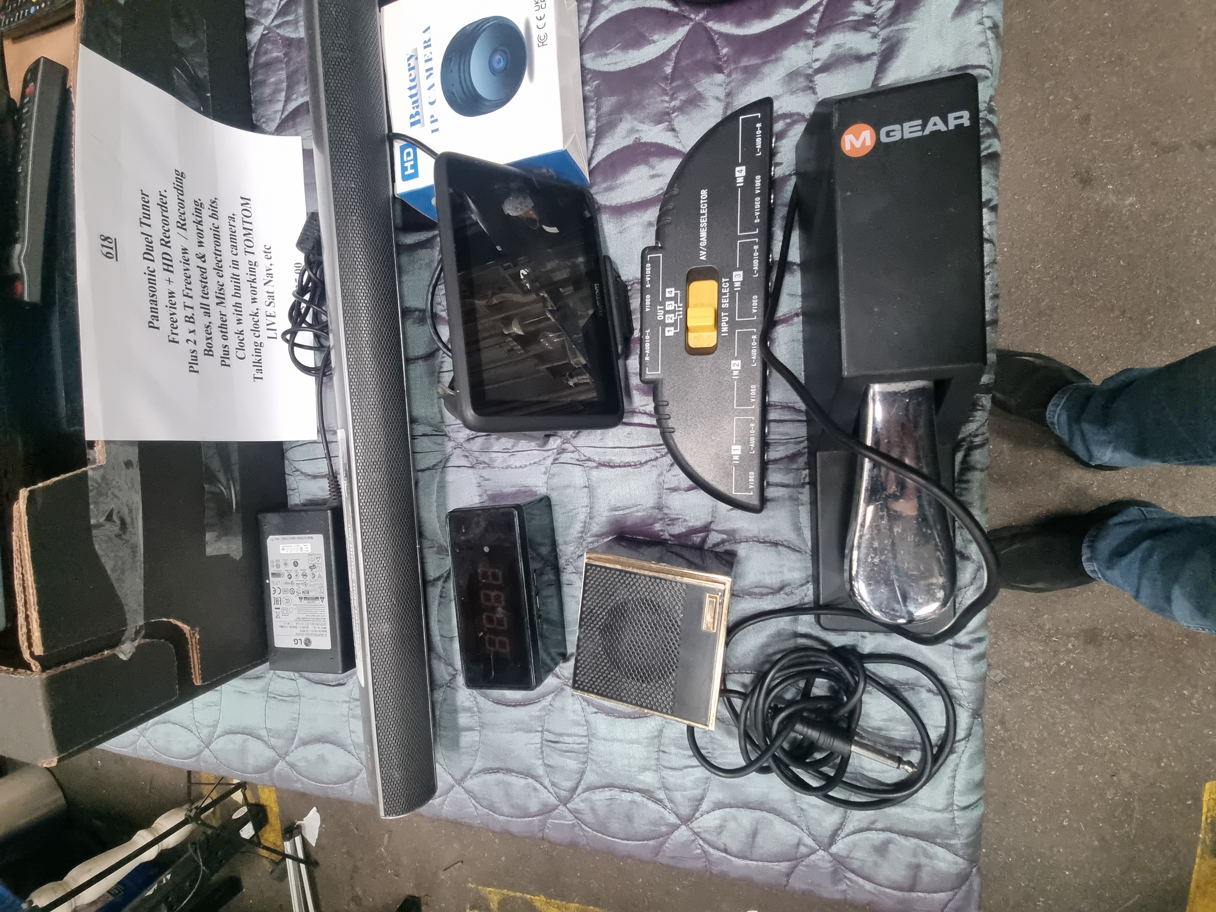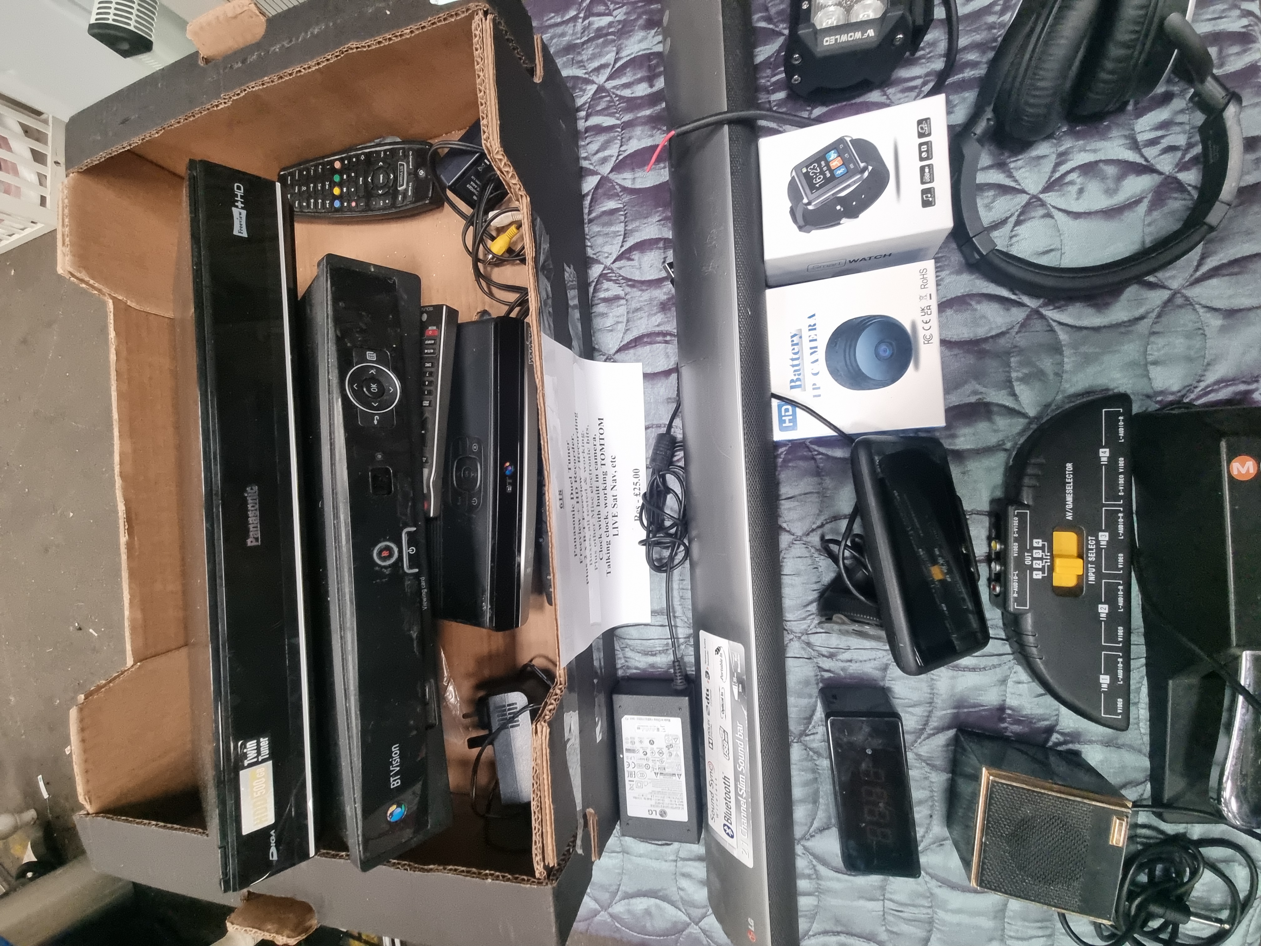 A collection of various consumer electronics and home media accessories. The lot features a Panasonic dual tuner Freeview+ HD recorder, marked with HDD 500GB and Twin Tuner. Also included are two BT Vision set-top boxes accompanied by multiple remote controls. Audio equipment includes an LG 2.1 channel slim soundbar featuring Bluetooth connectivity, paired with an LG brand power adapter, a pair of black over-ear headphones, and a small gold-trimmed speaker. Musical accessories comprise an M-Gear brand piano-style sustain pedal. Portable and home electronics include a TomTom LIVE handheld sat nav unit, a boxed Smart Watch, and a boxed HD Battery IP Camera. Additional items include a V-Wowled LED work light, a digital alarm clock, and a manual AV/game selector.