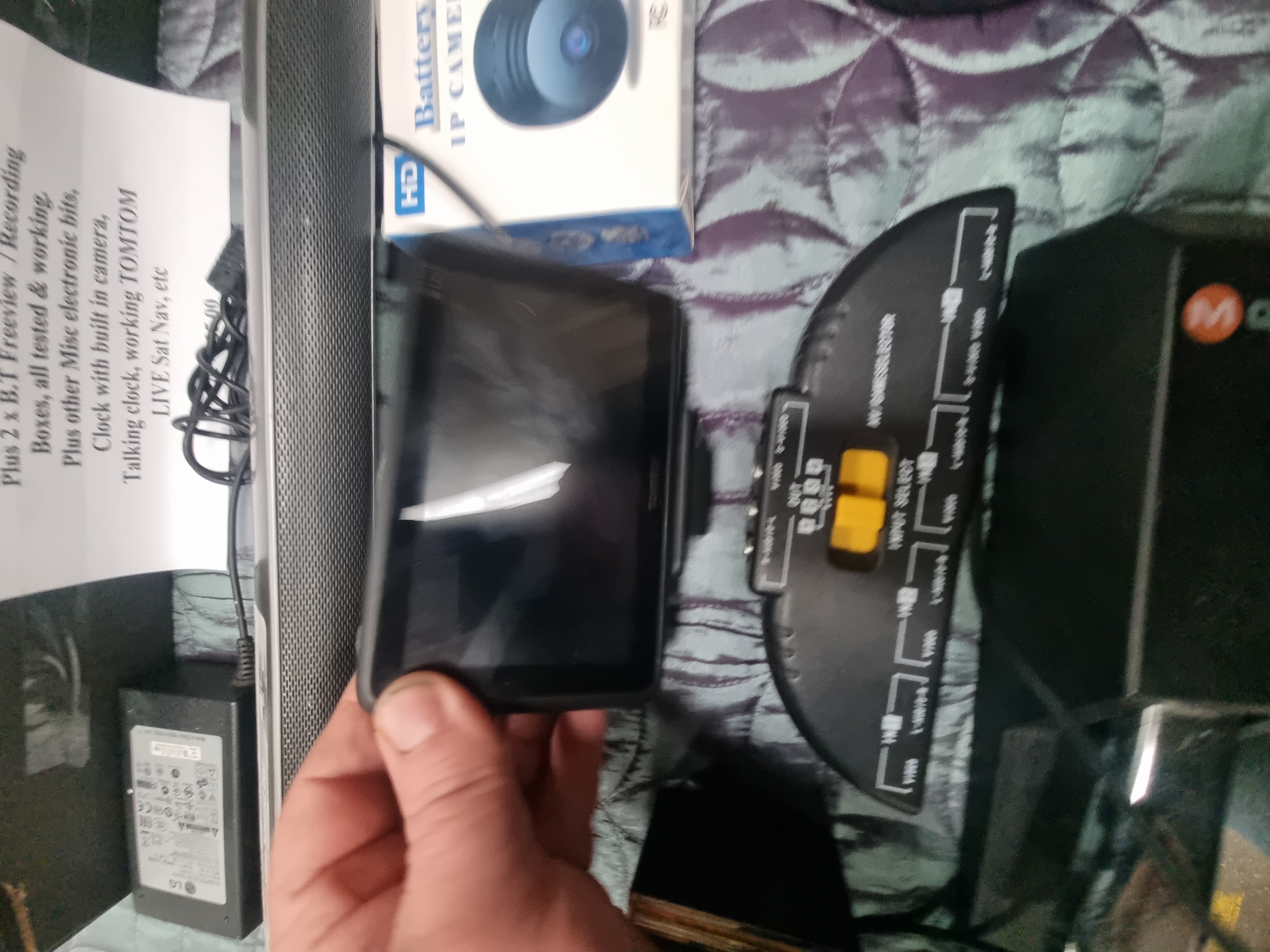The items appear in used condition with visible surface dust and minor cosmetic wear consistent with previous use. A handwritten note included with the lot states that items are tested and working; however, power-on status and full technical functionality have not been demonstrated or verified by the auction house.