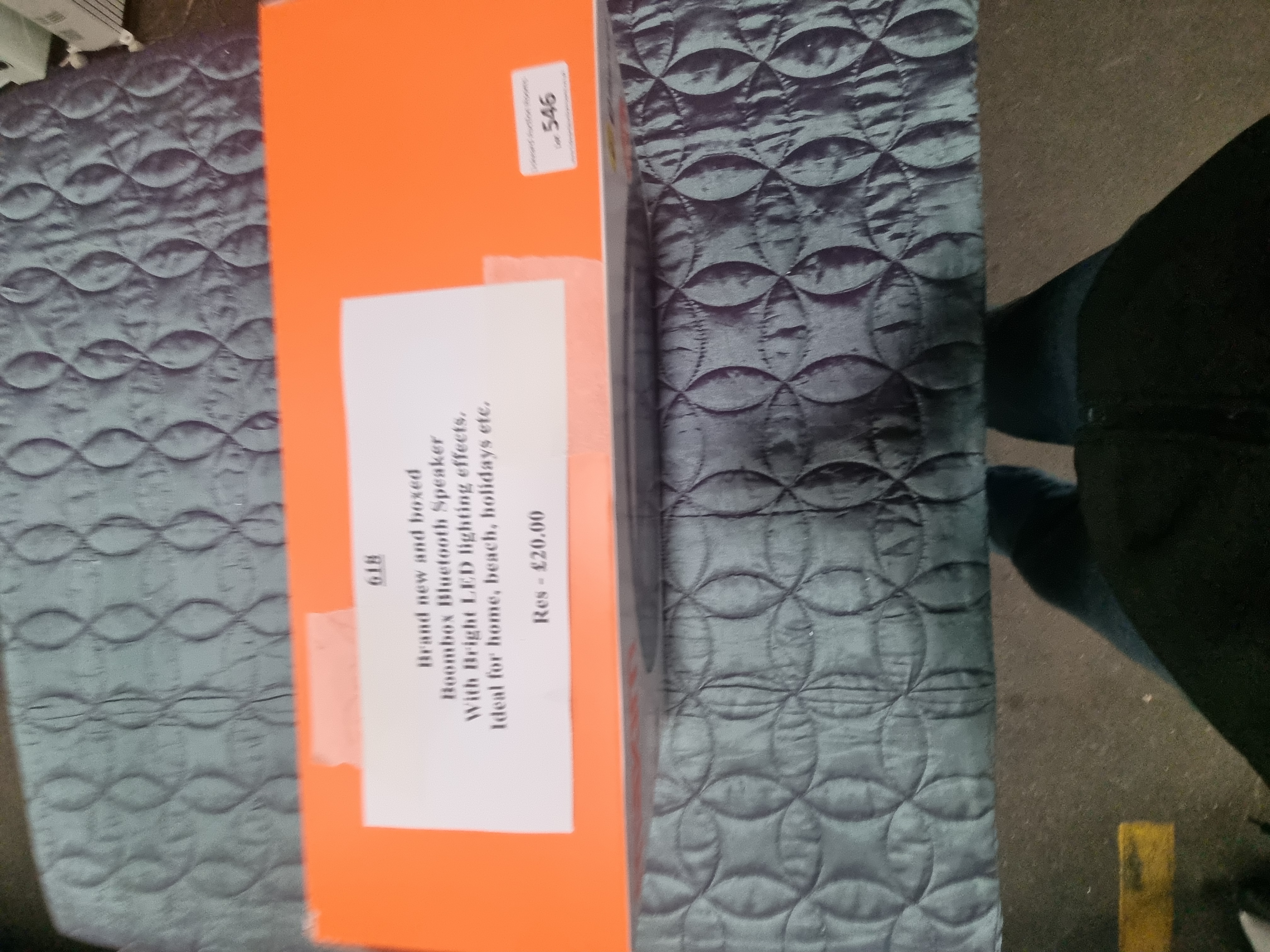 The item is brand new and boxed as per the attached auction label. The exterior packaging shows minor shelf wear and has auction identification labels applied. The electronic functions remain untested.
