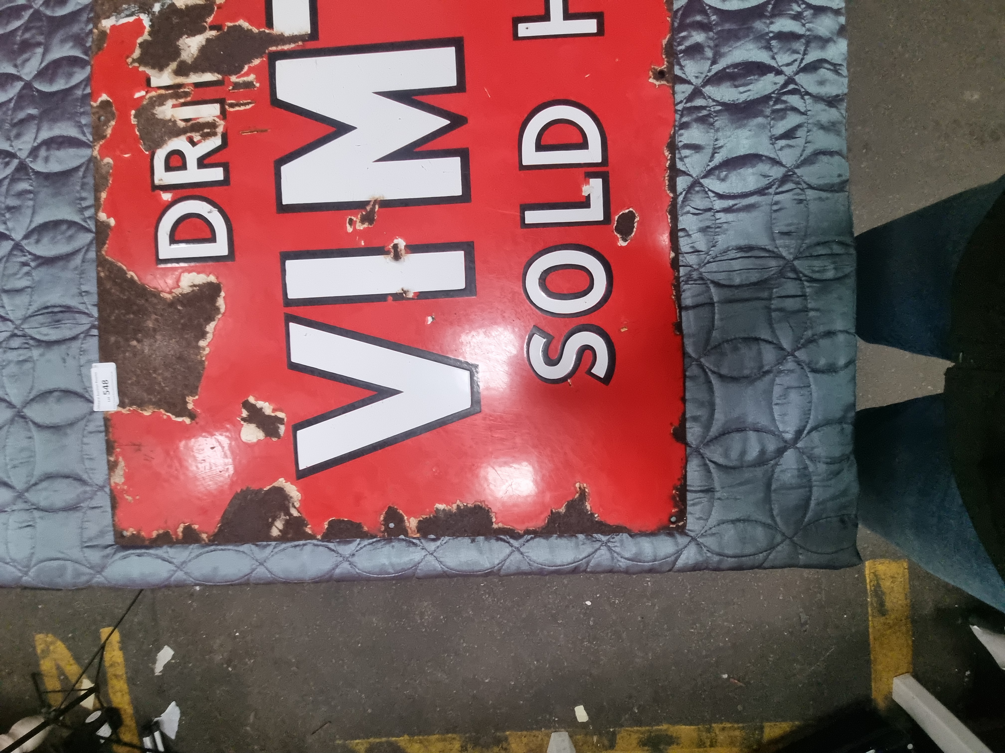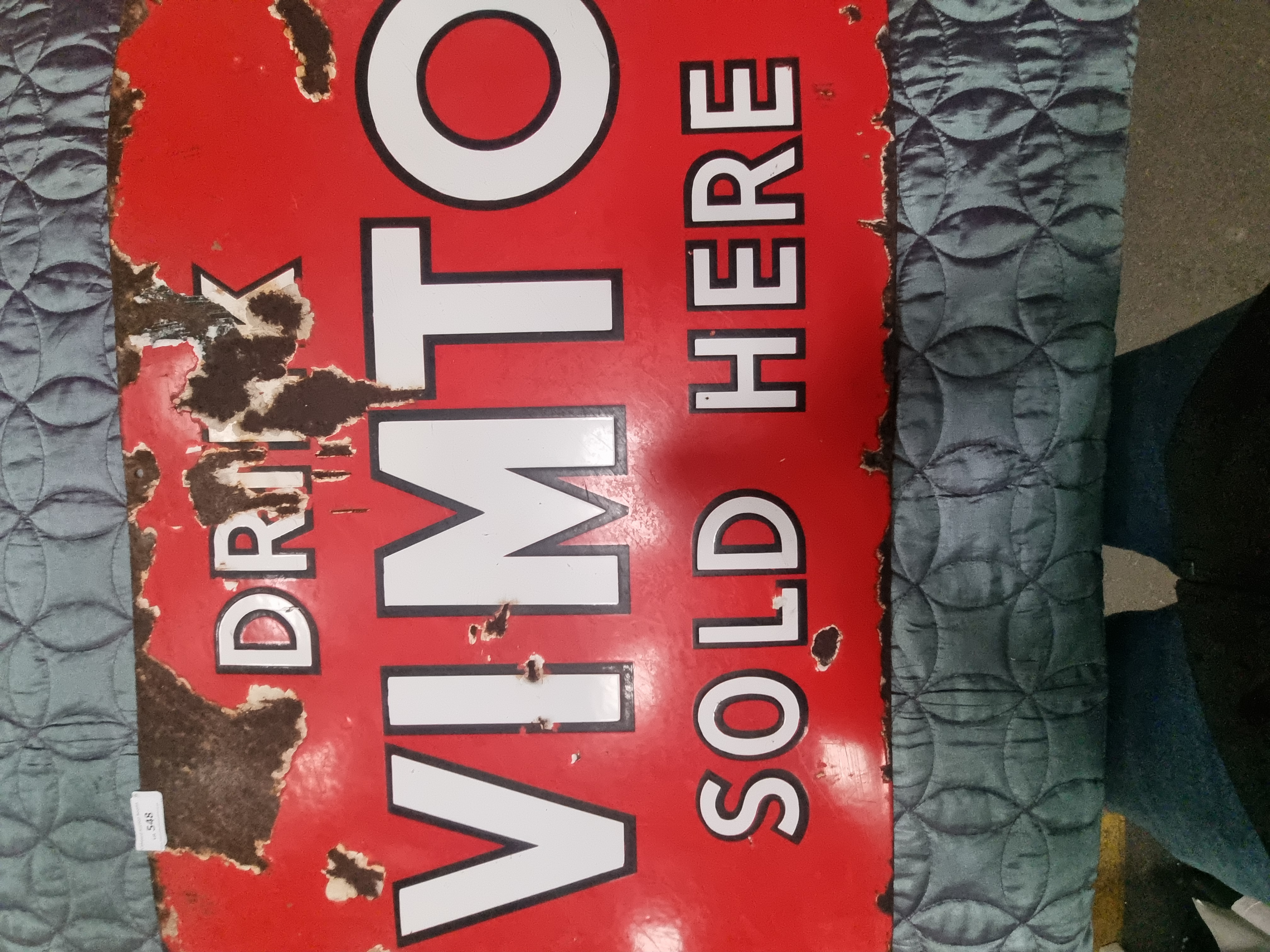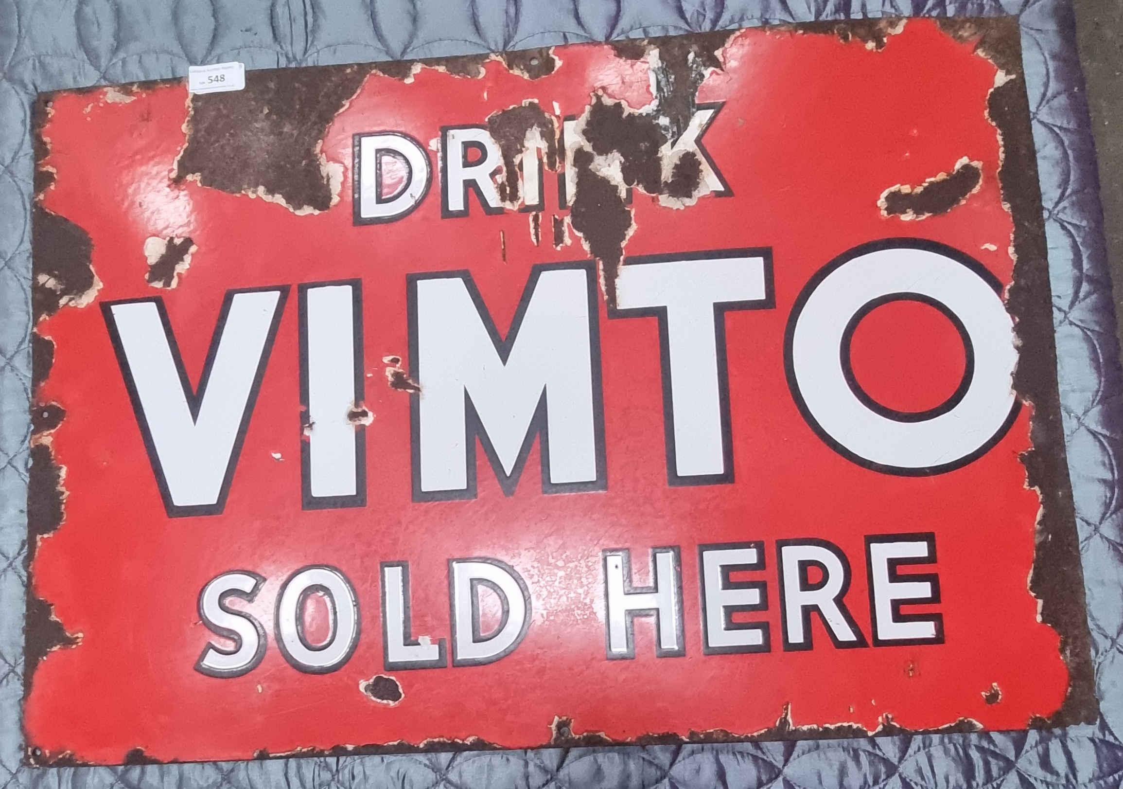 A rectangular vitreous enamel advertising sign for the British soft drink brand Vimto. The sign is constructed from vitreous enamel on a steel substrate, featuring a vibrant red ground with bold white block lettering outlined in black. The layout is designed for vertical display, with the text arranged in three distinct sections reading DRINK VIMTO SOLD HERE. No manufacturer names or maker marks are discernible on the face or along the edges. A small white adhesive lot tag with the number 548 is located in the lower-left corner.