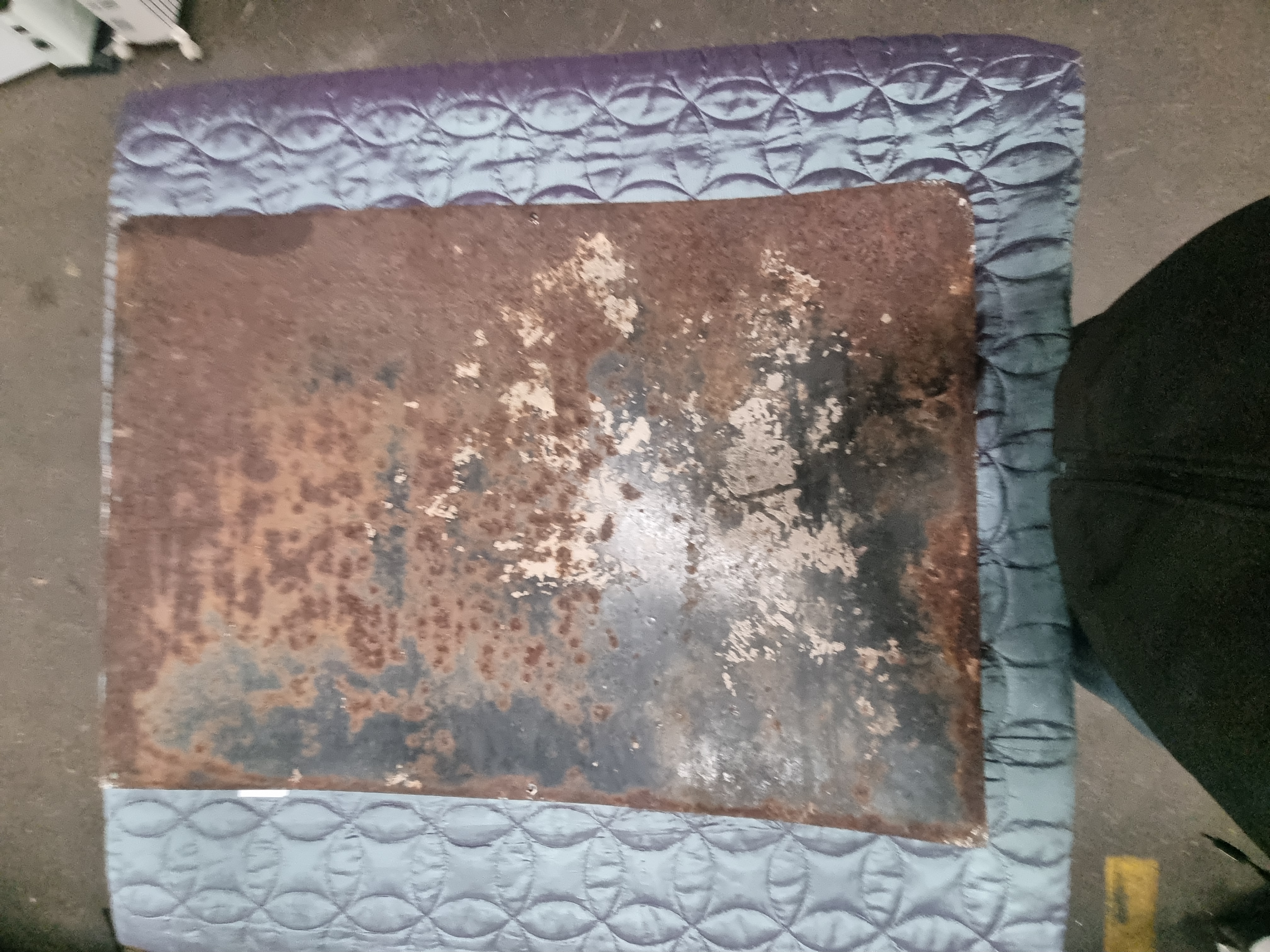 The sign is in a weathered, as-found condition. There is significant enamel loss and chipping, particularly along the left-hand margin and around the perimeter where the metal substrate is exposed. These areas show heavy surface oxidation and rust. The central VIMTO lettering remains largely intact and legible, though some minor pitting and small enamel flecks are missing within the white characters. The reverse side exhibits extensive, deep-seated rust and a near-total loss of the original protective coating.