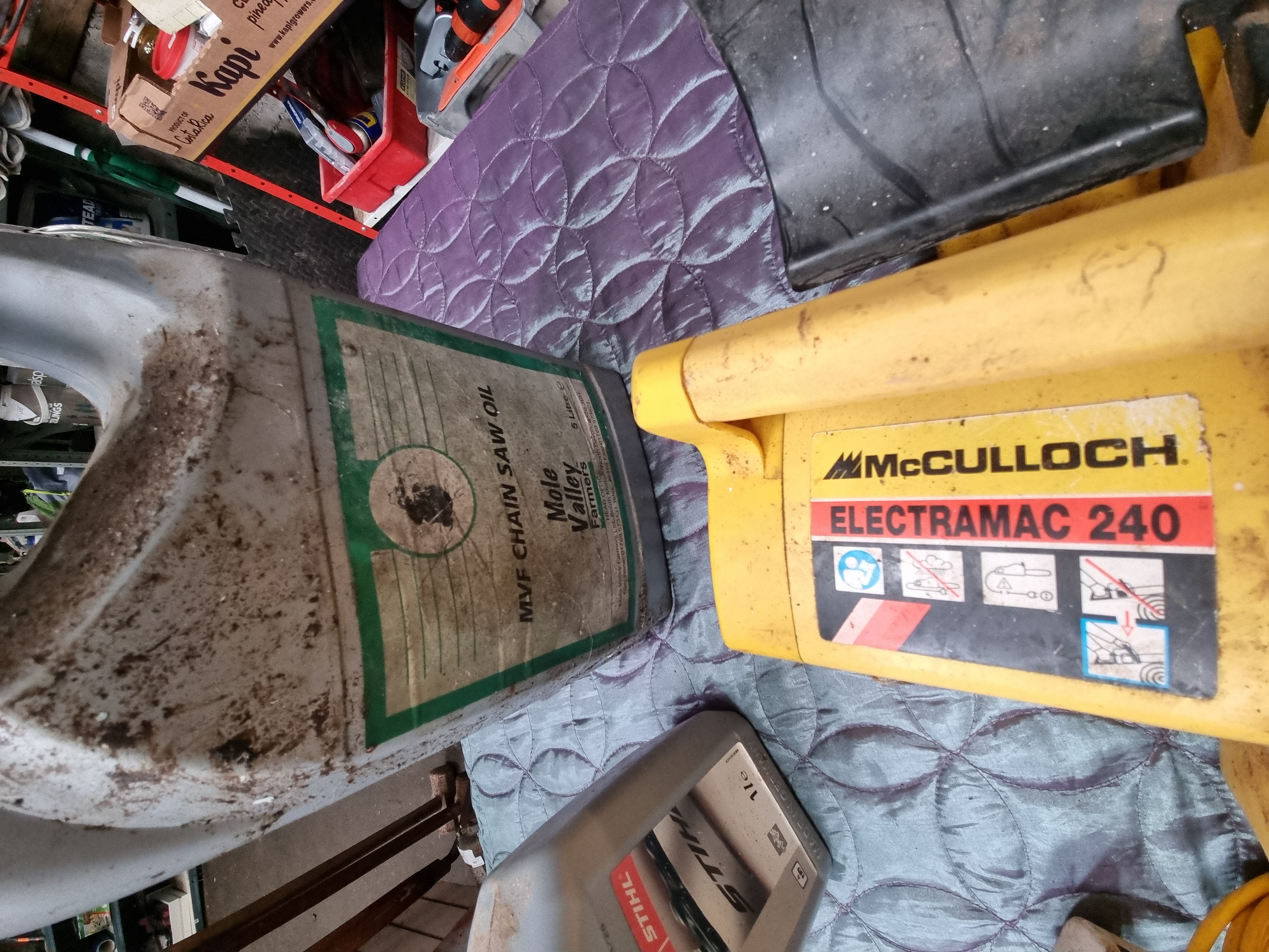 A McCulloch Electramac 240 corded electric chainsaw. The tool features a yellow plastic housing with a metal guide bar and metal chain. The housing is marked with a label reading McCULLOCH ELECTRAMAC 240. The guide bar is inscribed 16 inch McCULLOCH. The unit is fitted with a standard United Kingdom three-pin power plug. This lot includes a yellow plastic McCulloch branded guide bar scabbard, a 5-litre container of Mole Valley Farmers MVF Chain Saw Oil, and a 1-litre bottle of Stihl SynthPlus chainsaw oil.