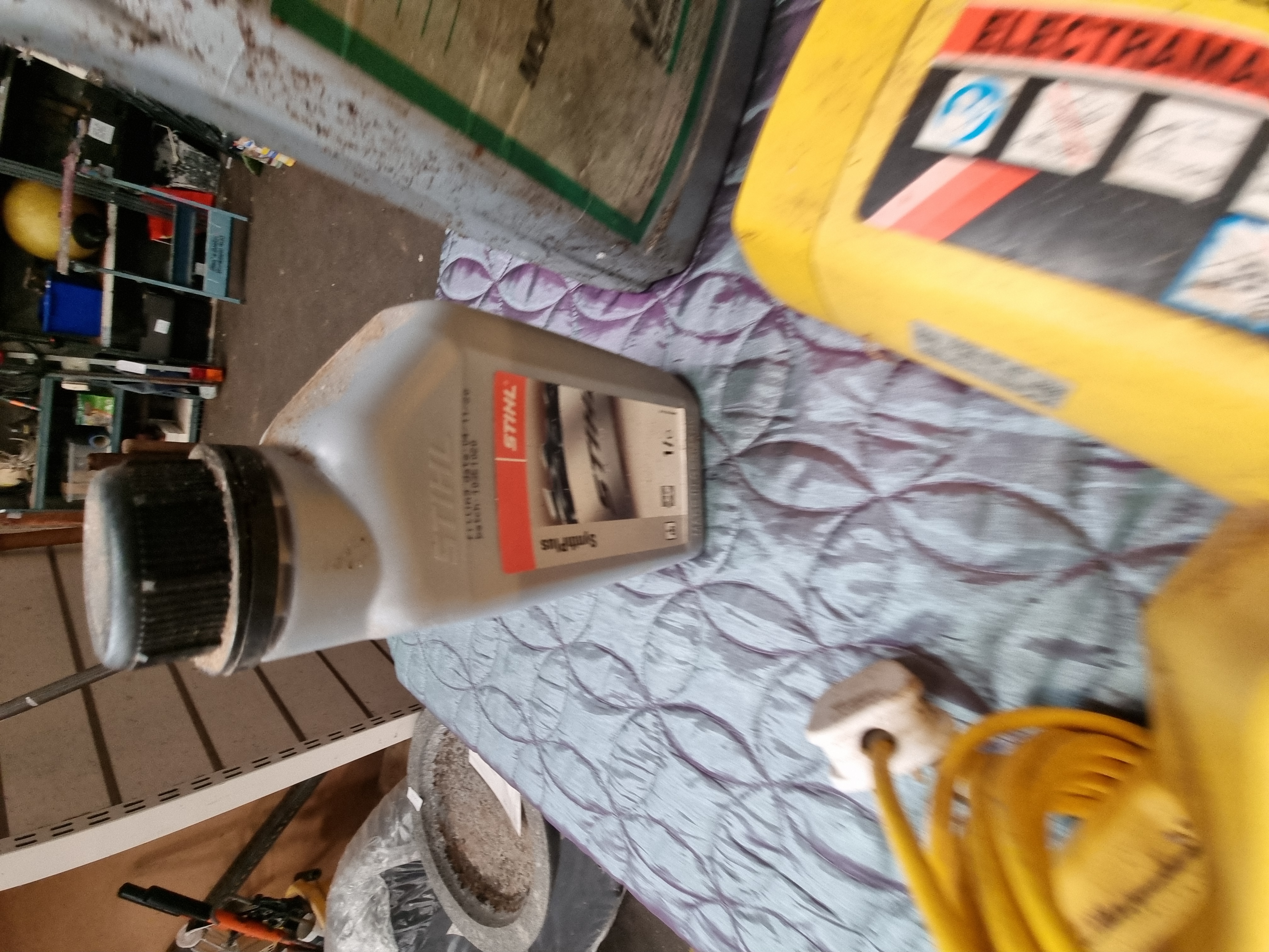 The chainsaw is in a heavily used condition, exhibiting significant surface dirt, sawdust residue, and staining across the yellow plastic body. The power cable appears intact. The included oil containers are open and partially used. The item is sold as seen and is untested for working order.