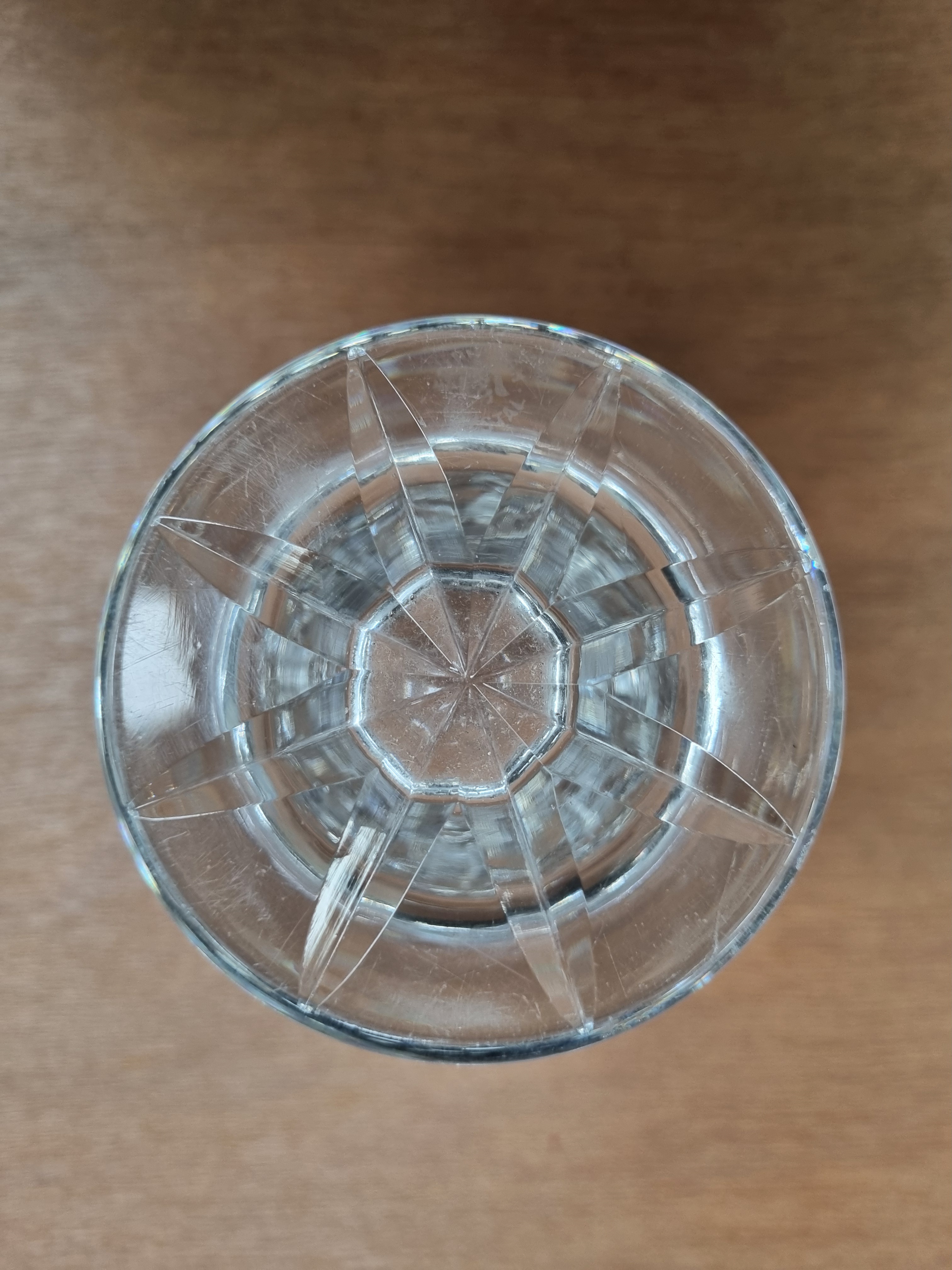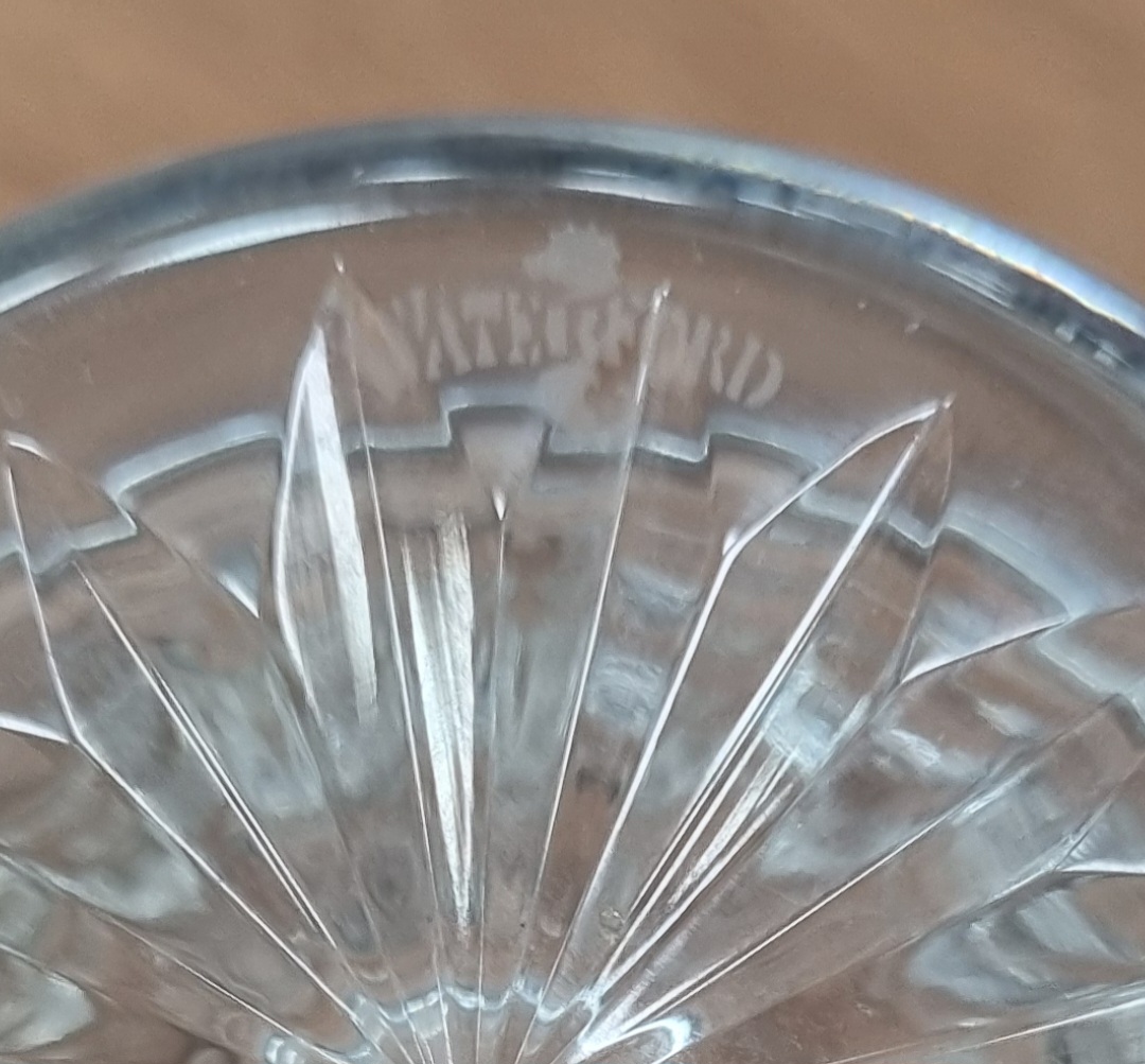 A collection of lead crystal glassware comprising a set of seven wine hock glasses and two small decorative vases. The hock glasses feature rounded bowls decorated with vertical wedge cuts radiating from the base, supported by multi-faceted stems on plain circular feet, a style consistent with the Sheila pattern. The two vases include one of flared conical form with a star-cut base and one of baluster form, both featuring intricate geometric diamond and vertical wedge cutting. The items are crafted from high-quality lead crystal, evidenced by their clarity and high refractive index. Physical examination of the bases reveals etched markings for Waterford Crystal, Edinburgh Crystal, and vintage Bohemia glass hock glasses. The etched letters WATERFORD and partial CRYSTAL marks are clearly visible on several items.