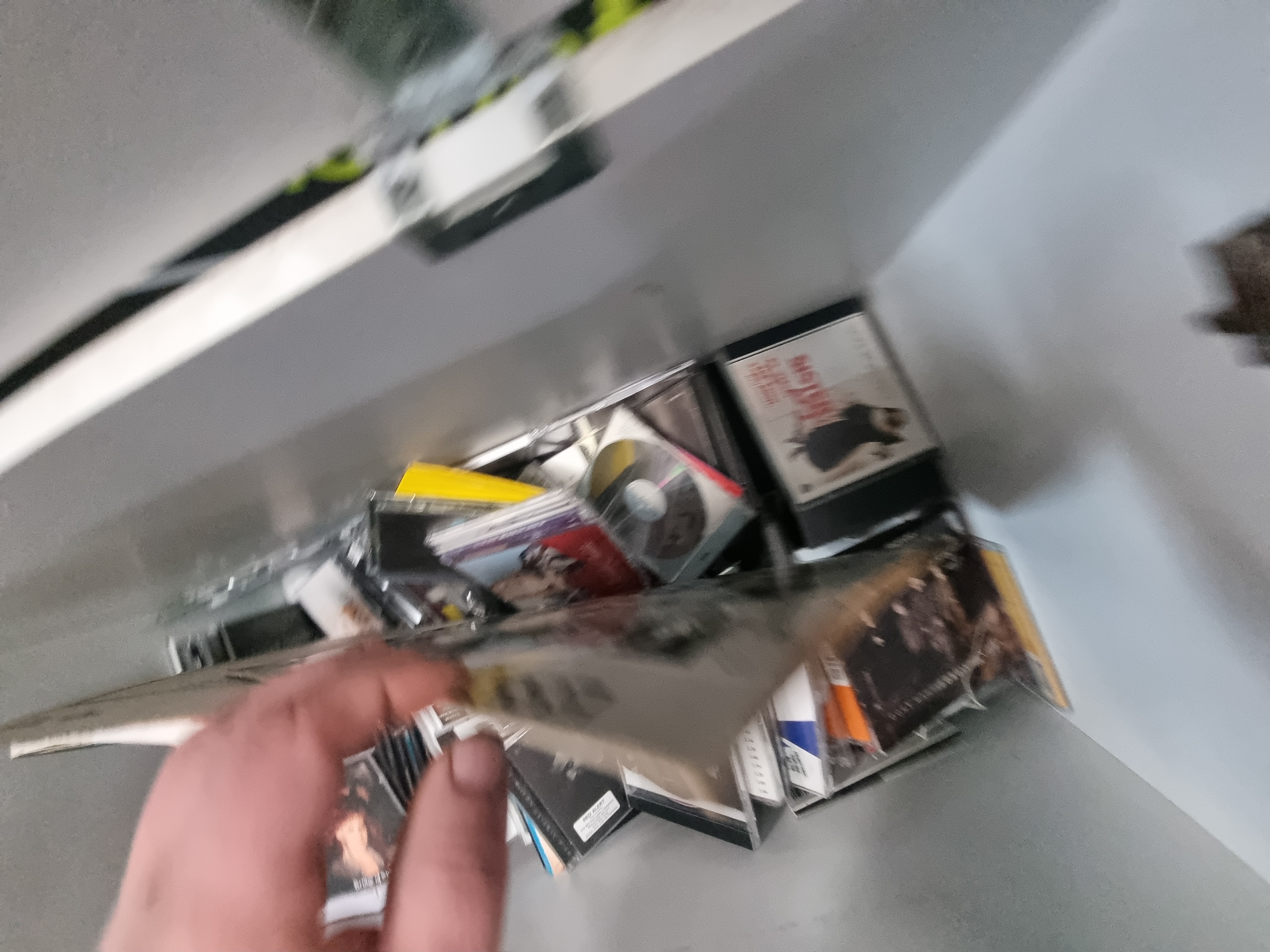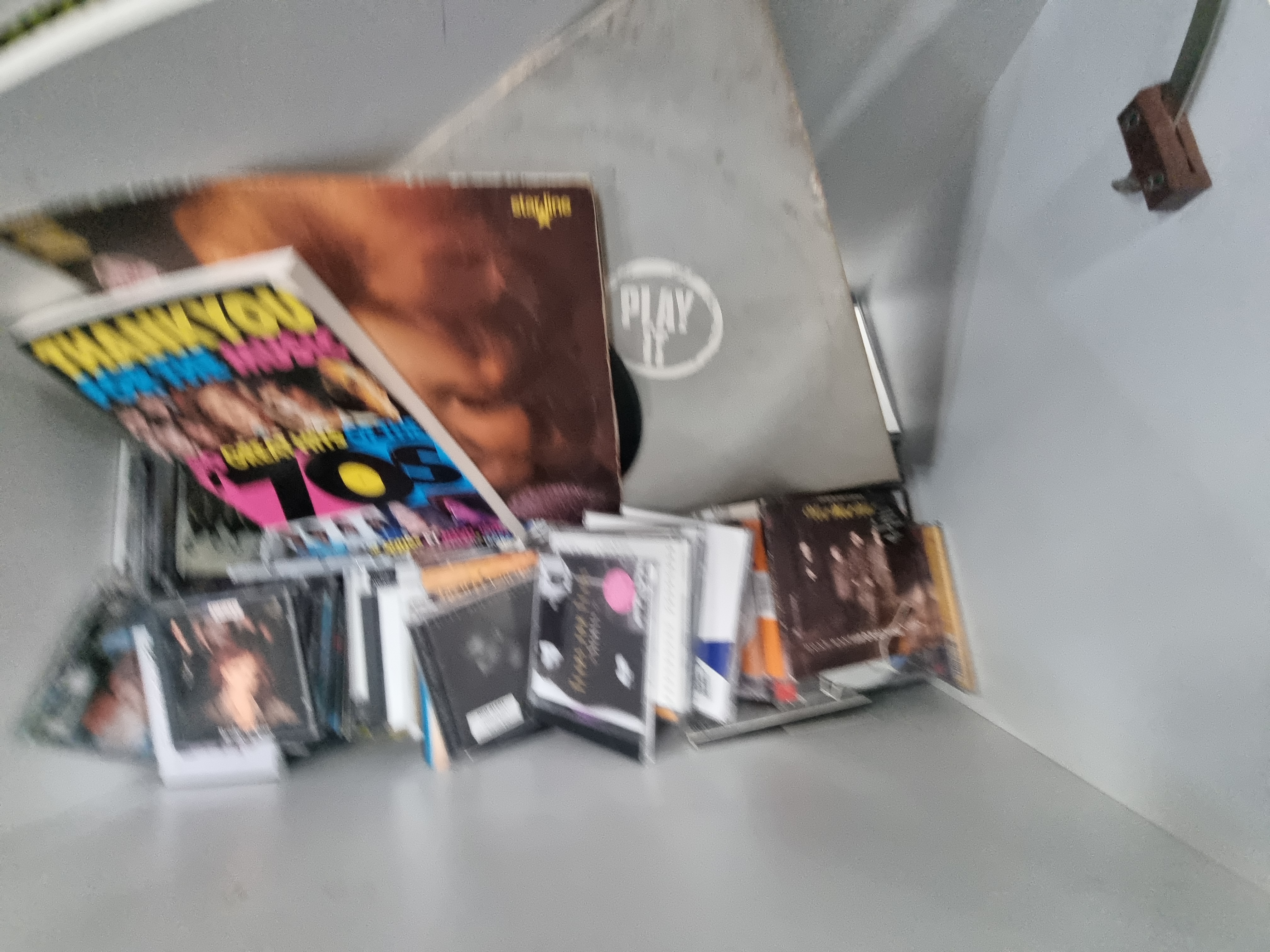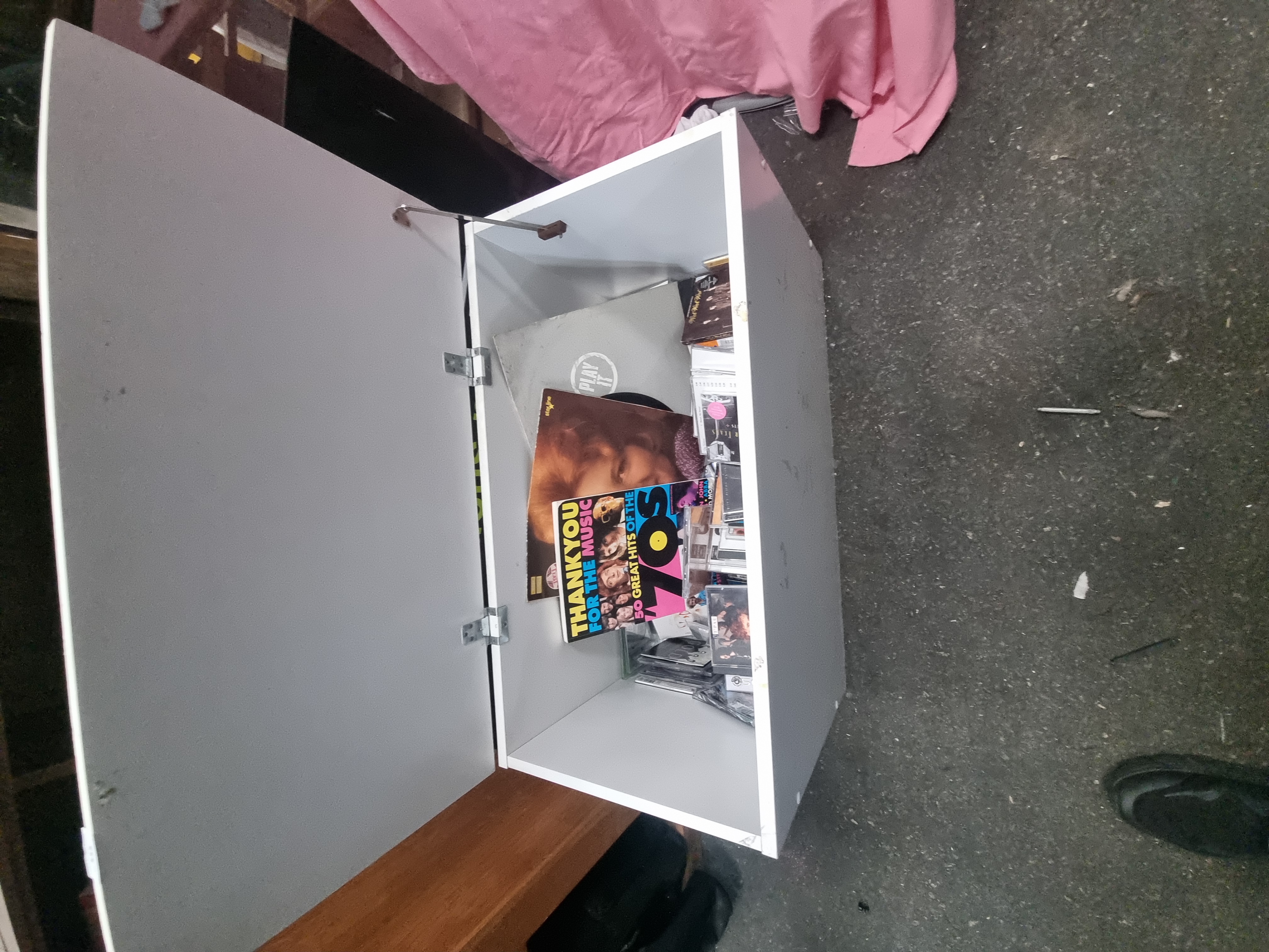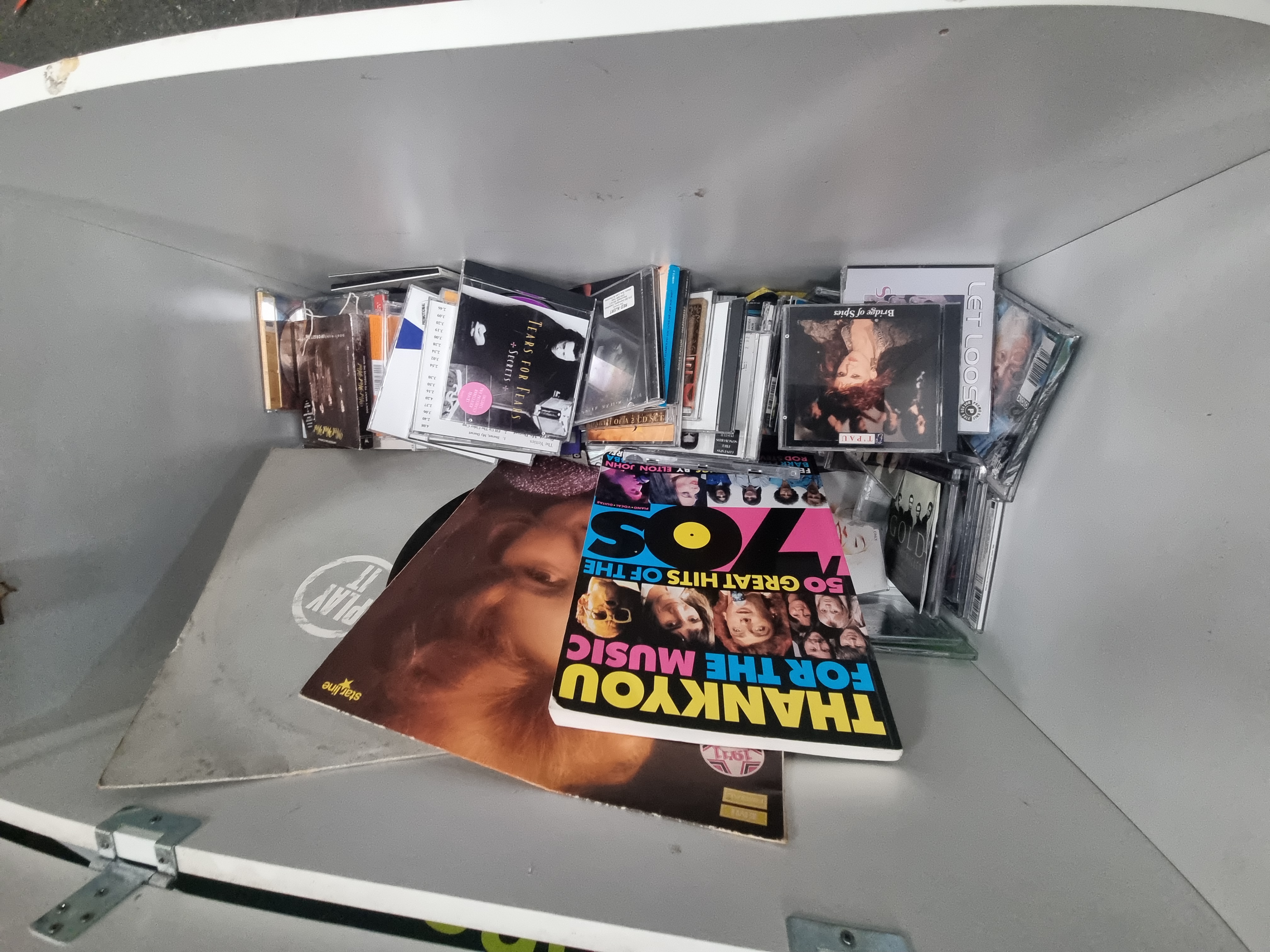 This lot comprises a collection of music media and related items housed within a contemporary white storage unit. The collection includes several vinyl LP records and singles, featuring a release on the Starline label and an item in a grey sleeve with a circular Play It logo. The compact disc selection consists of multiple titles in standard jewel cases, including Bridge of Spies by T’Pau, Secrets by Tears for Fears, and a self-titled album by Let Loose, amongst other pop and rock titles. Also included is a softcover songbook titled Thank You for the Music: 50 Great Hits of the 70s, arranged for piano, vocal, and guitar. The storage chest is constructed from white melamine-faced particle board with a single hinged lid supported by a gas-strut mechanism, resembling a contemporary shoe or toy storage bench.