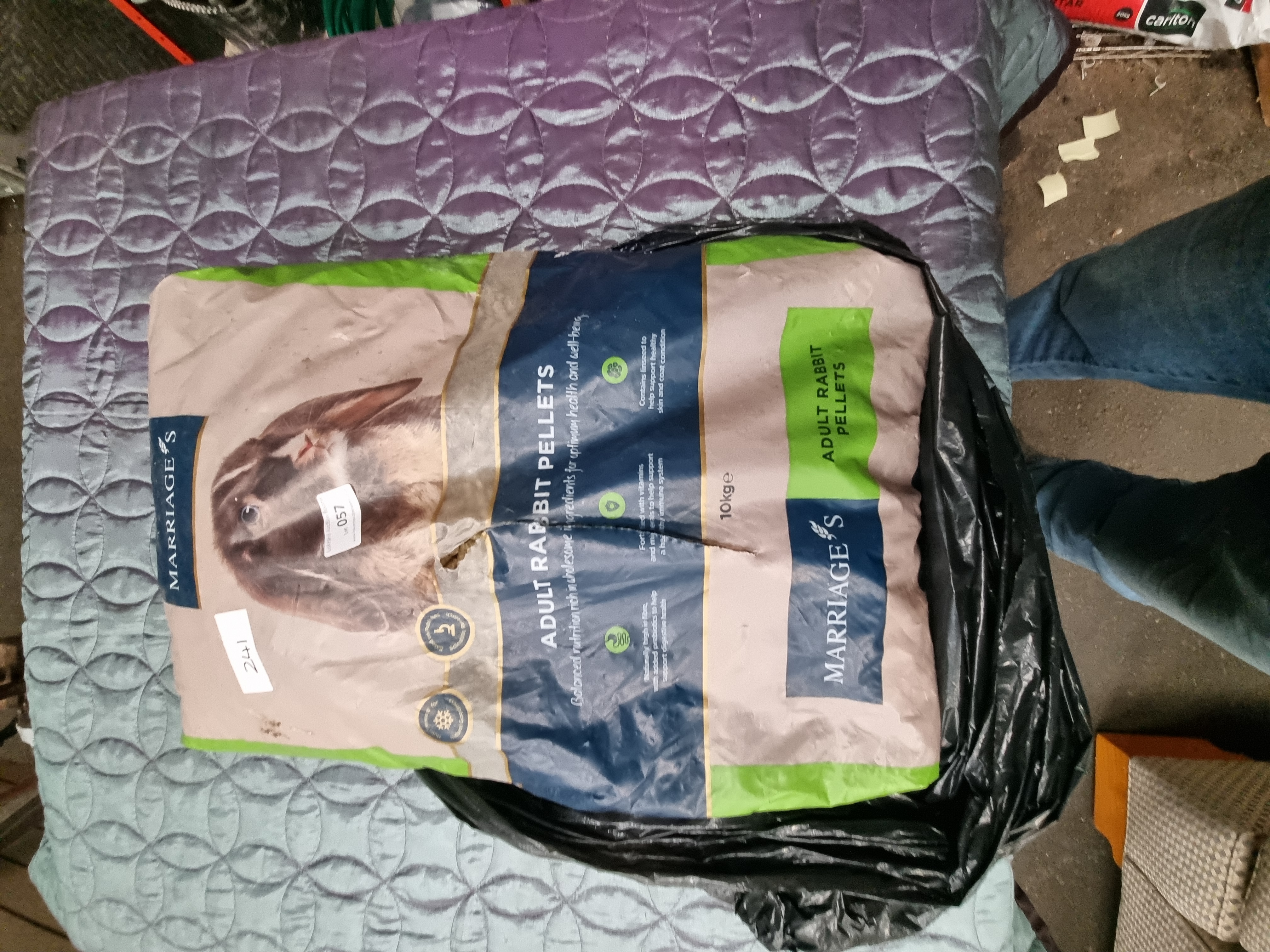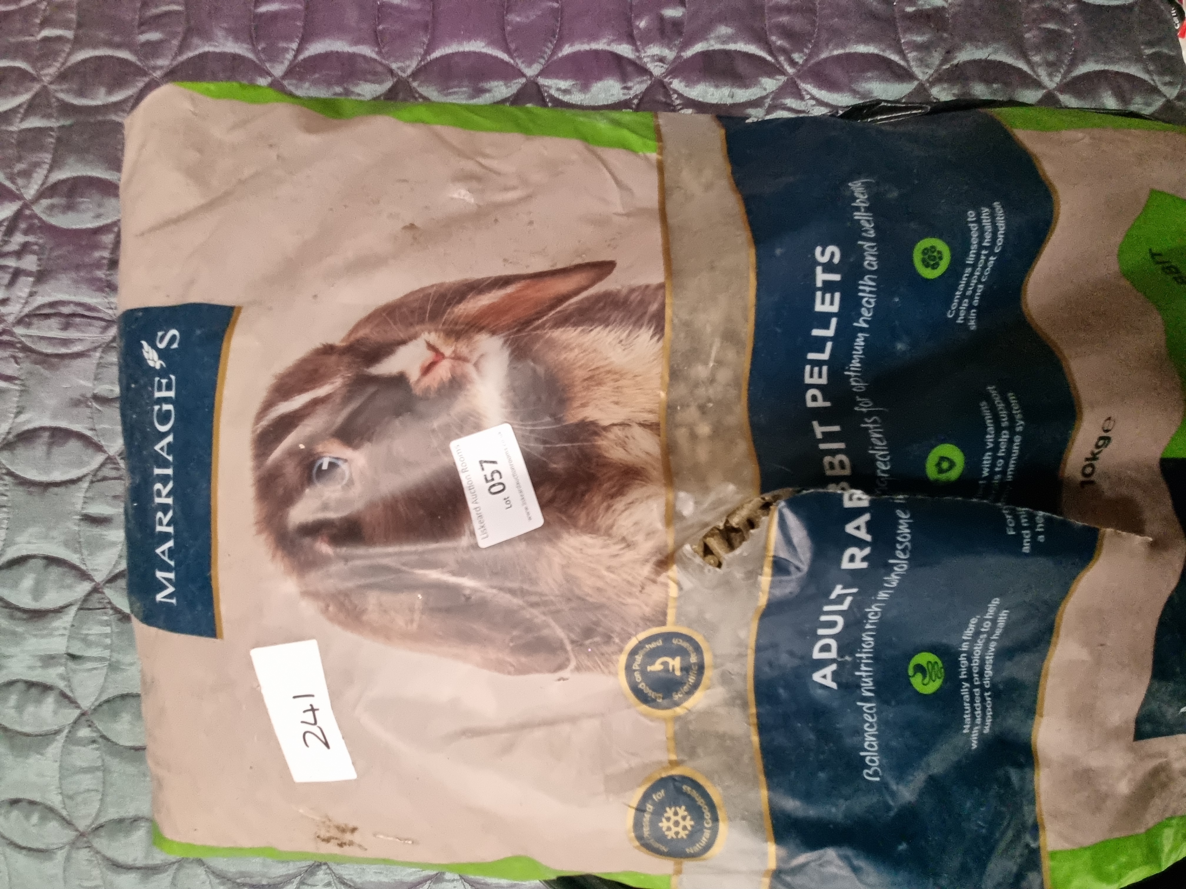 One bag of Marriage’s brand adult rabbit pellets. The packaging is a printed bag displaying the brand name and product details, including the presence of linseed, vitamins, and minerals. The bag features a photographic illustration of a rabbit and carries auction house identification stickers for lot 057 and a handwritten label 241.