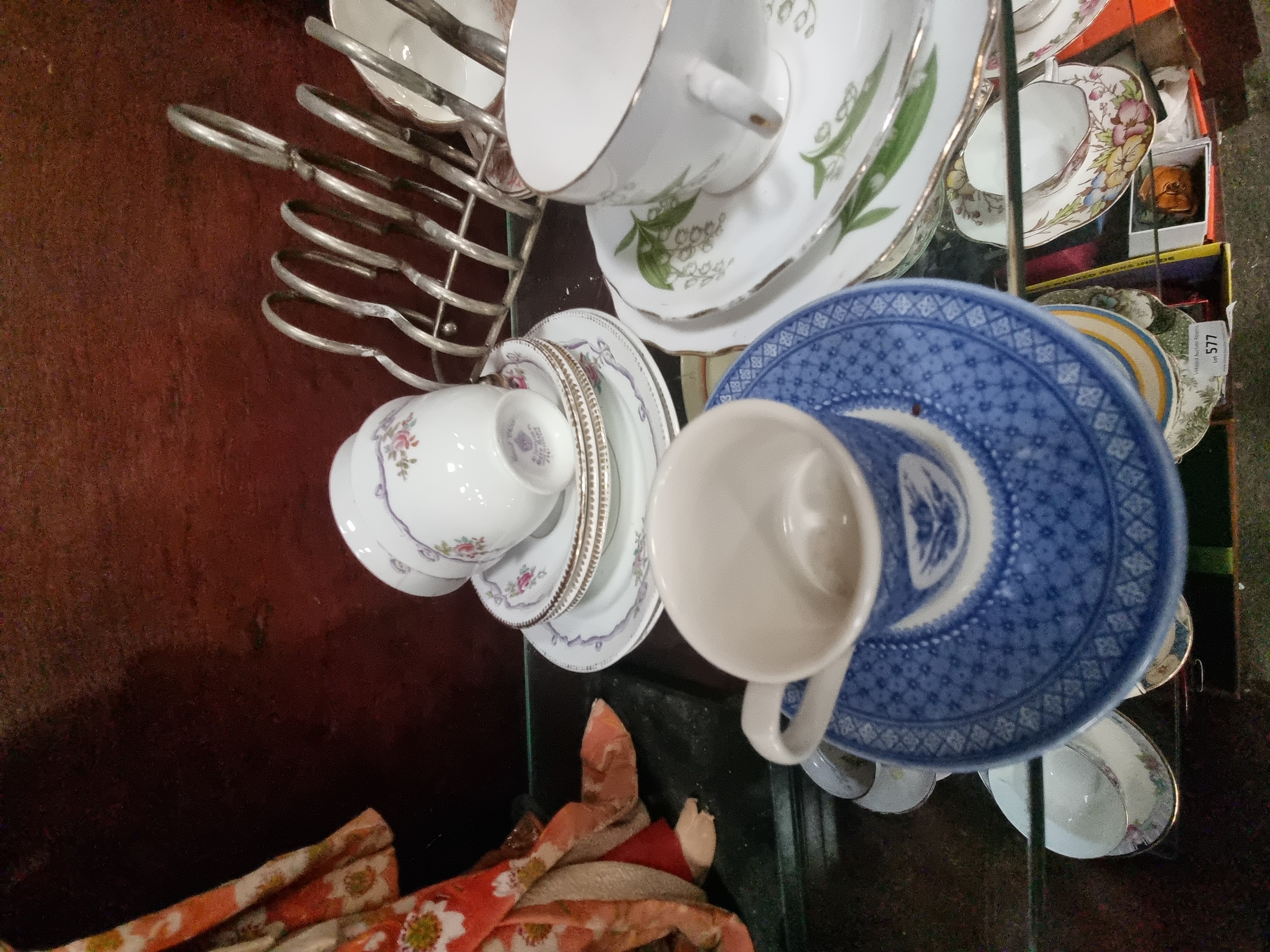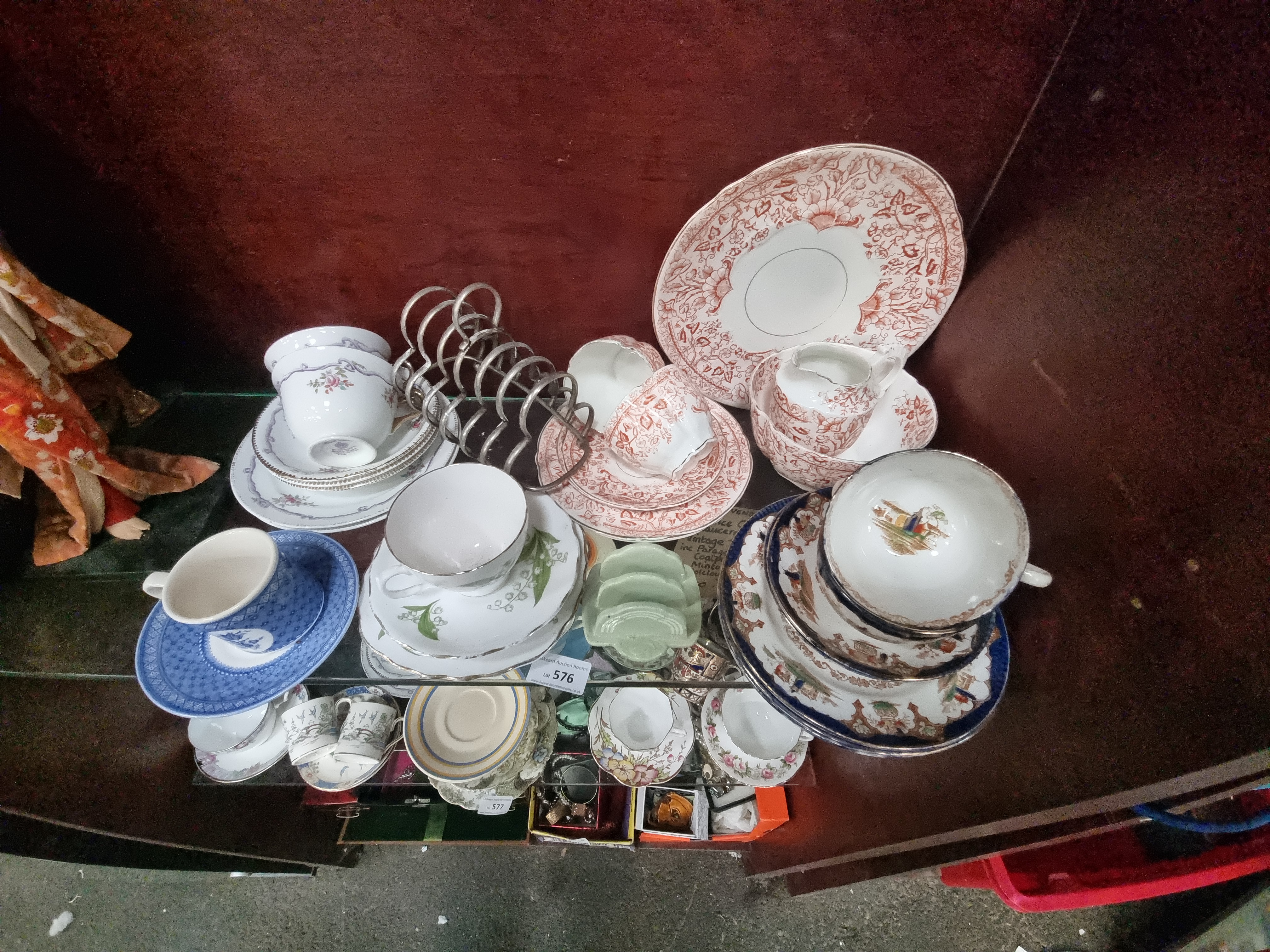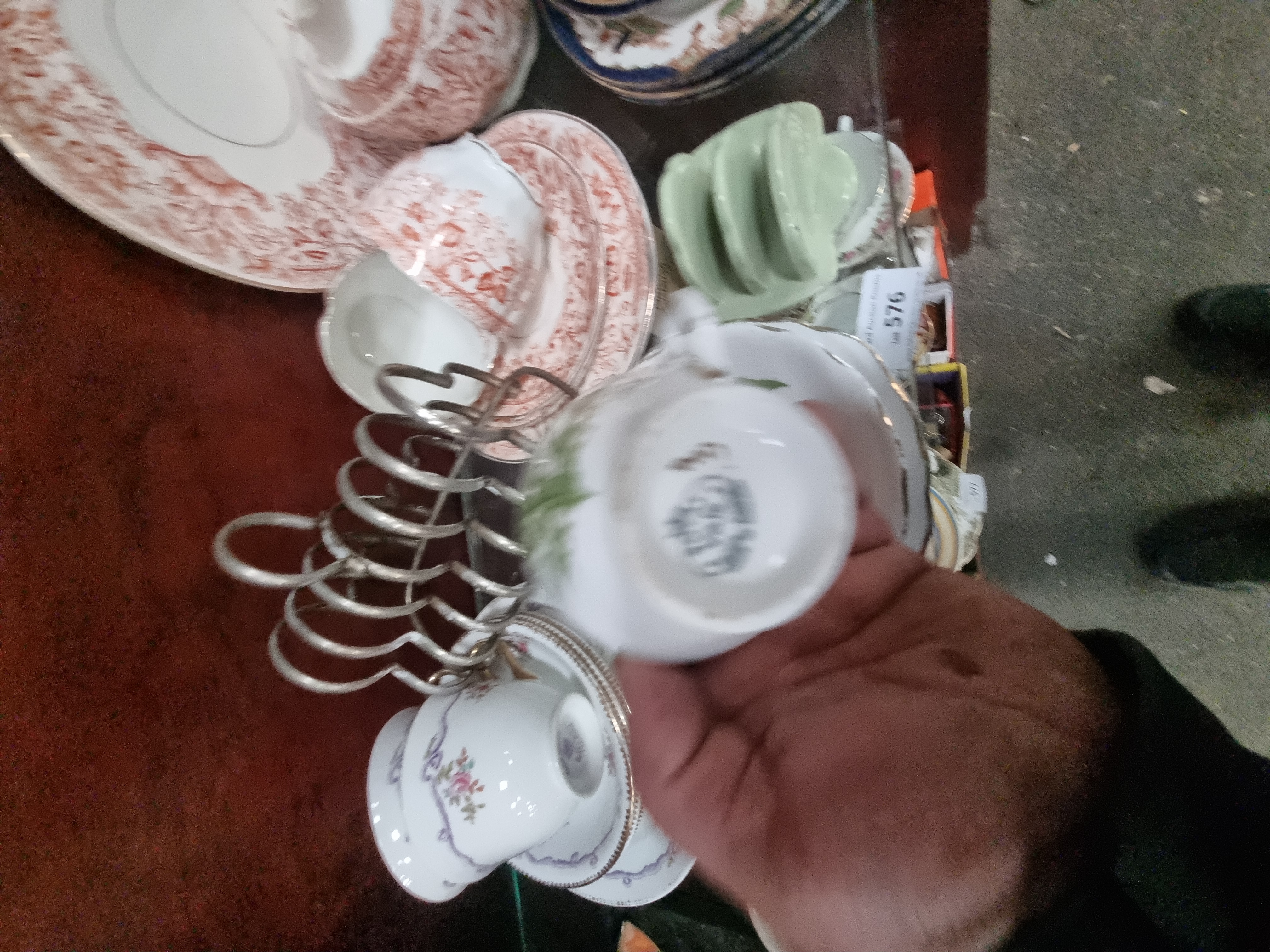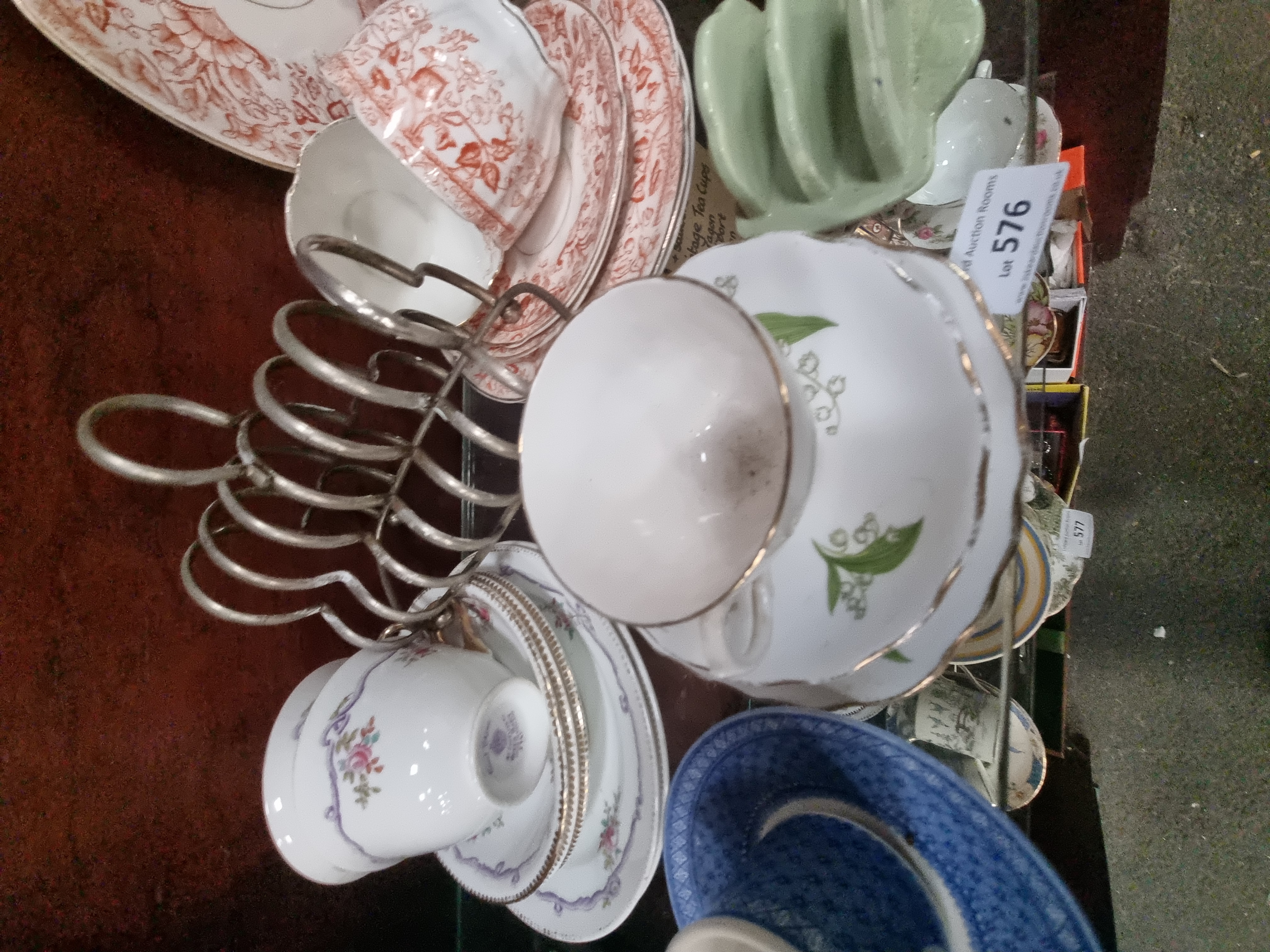 This collection comprises a variety of British ceramic tea wares, predominantly fine bone china and porcelain from the mid-20th century. Manufacturers identified by marks or vendor attribution include Paragon, Coalport, Minton, and Colclough. The assortment features several distinct patterns and services. A red transferware service is decorated with a dense, all-over floral chintz-style pattern and includes a large serving plate, a milk jug, and multiple teacups and saucers. A trio in the Gaudy Welsh style is decorated in a traditional Imari palette of cobalt blue, rust, and green with gilt highlights. The collection also includes a white porcelain set featuring Lily of the Valley sprays with gilt rims, a set decorated with purple floral garlands and scalloped rims, and a blue lattice pattern set with a central floral motif. Accessories within the lot include a green-glazed earthenware five-slot toast rack and a silver-tone wire rack. Visible markings include a green printed Paragon royal warrant crest on a white teacup and hand-painted pattern number 3986 on the red transferware.
