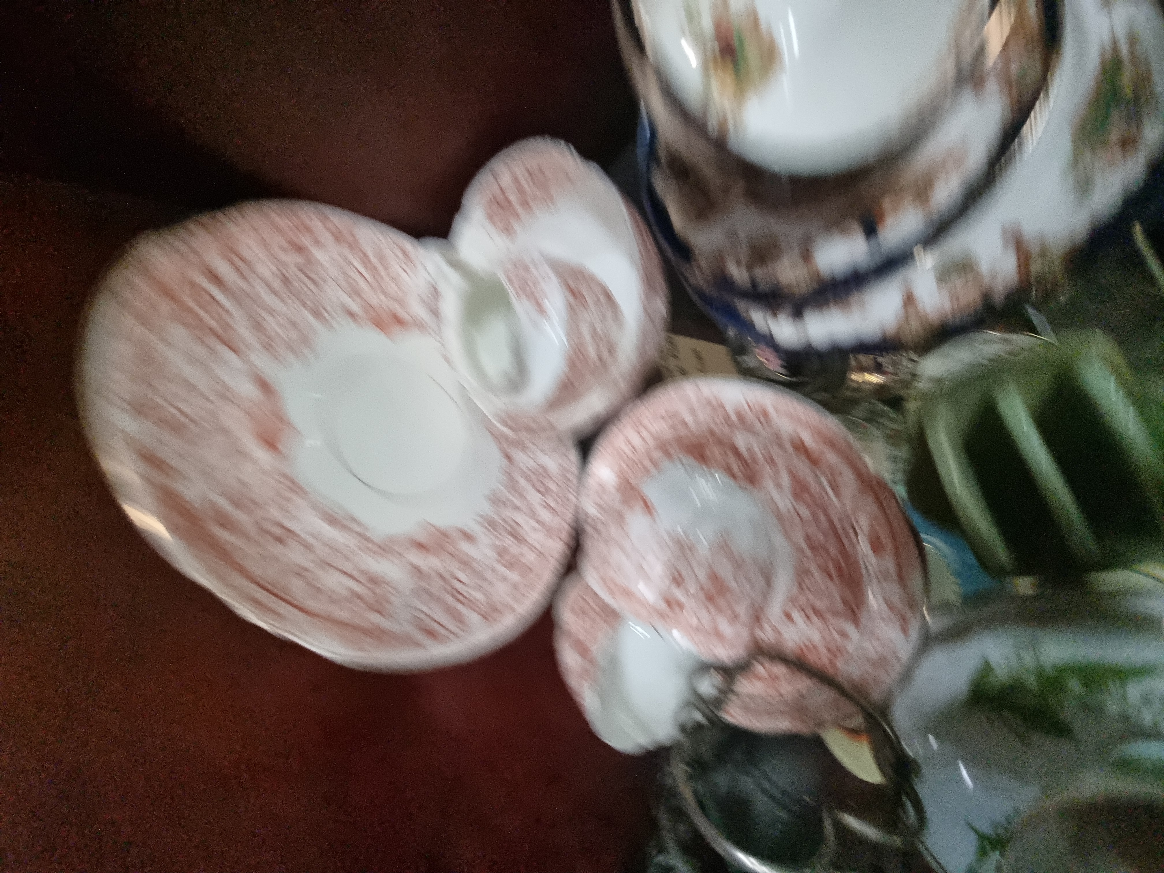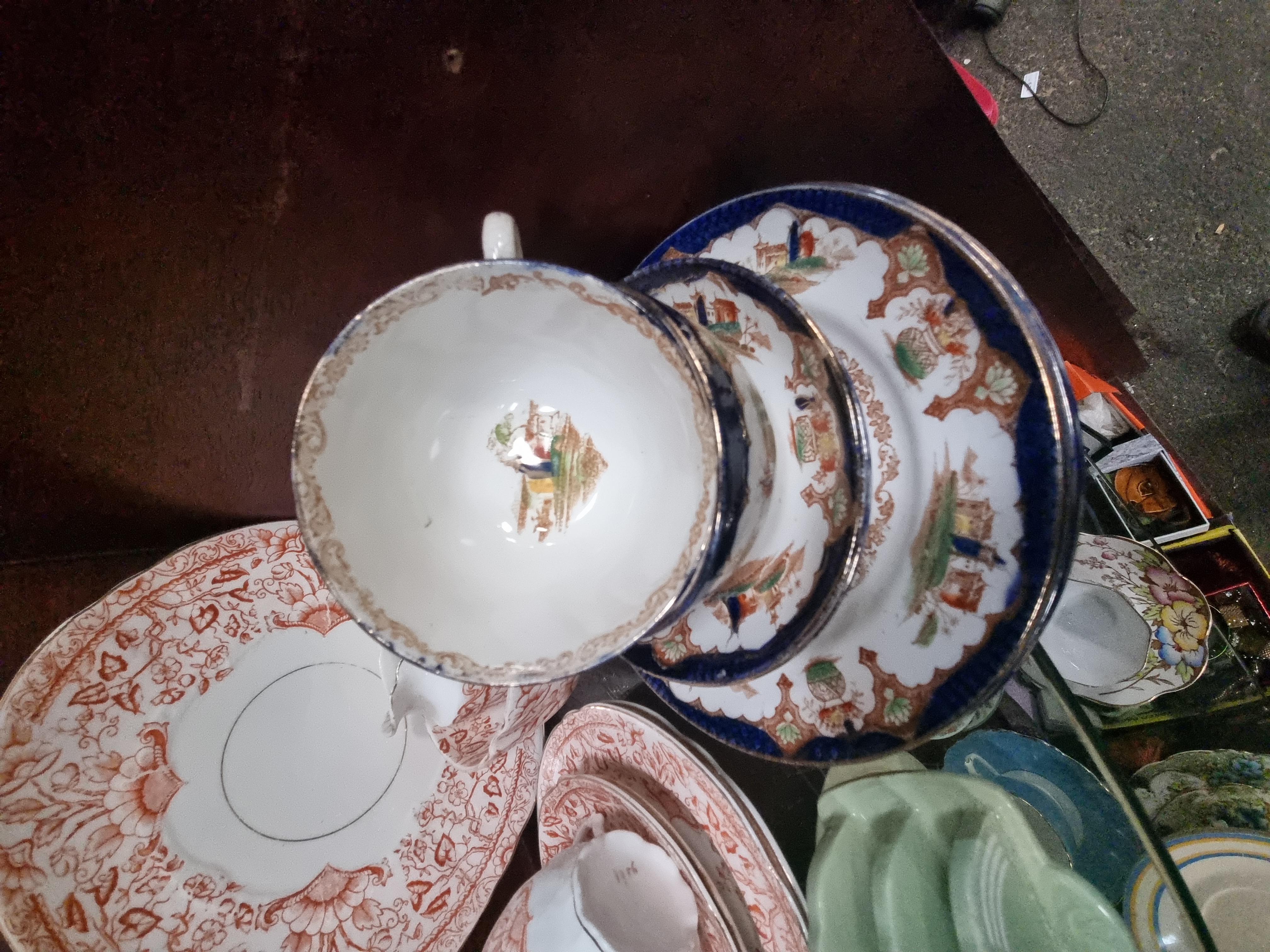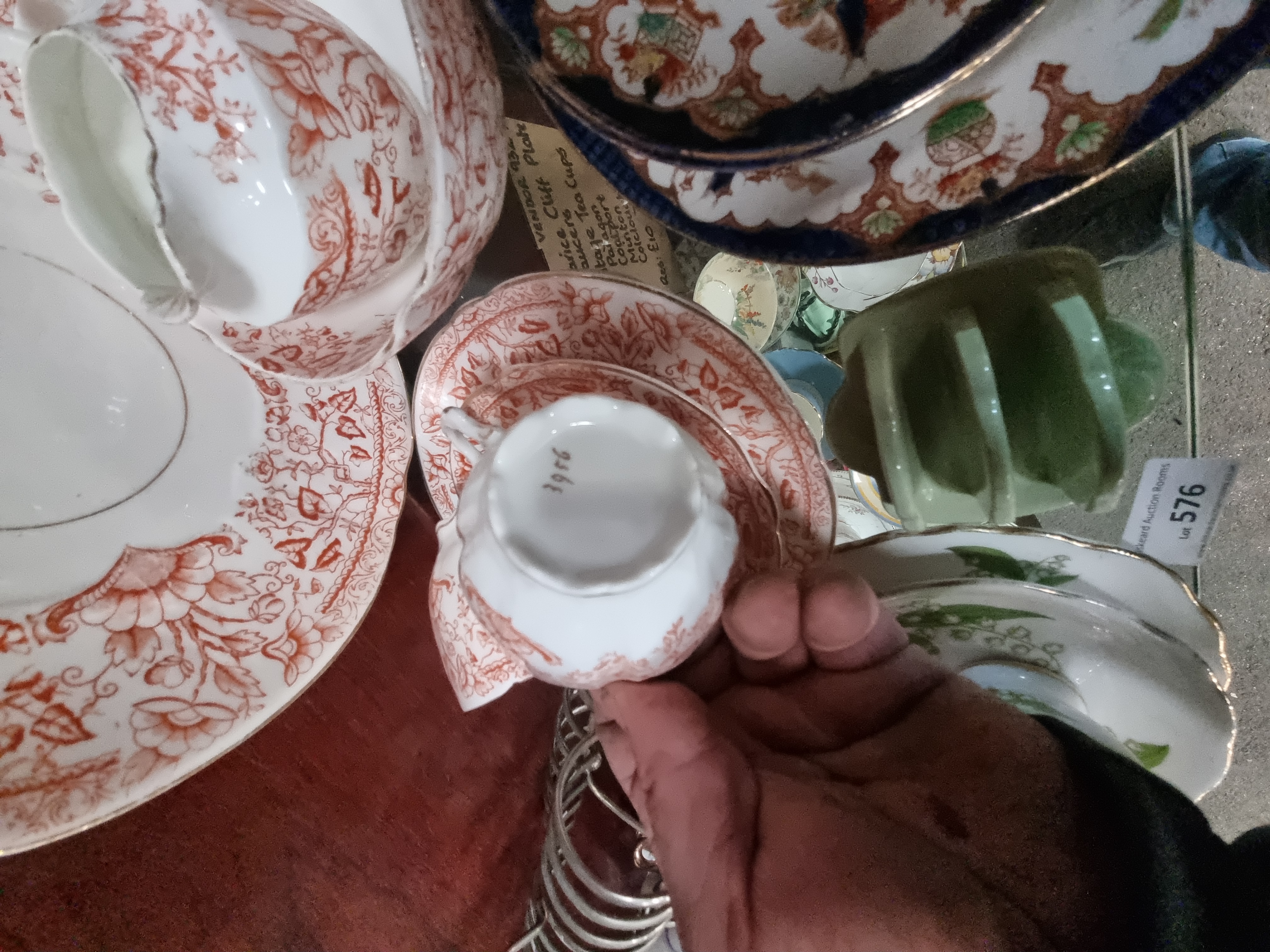 The items show signs of age and domestic use. The red transferware milk jug has a significant chip and loss to the rim. General rubbing and wear to the gilding are visible on the rims and handles of several pieces, most notably on the Gaudy Welsh style and purple floral sets. The red transferware pieces exhibit some typical manufacturing imperfections and minor surface wear. No other major cracks or repairs are visible.