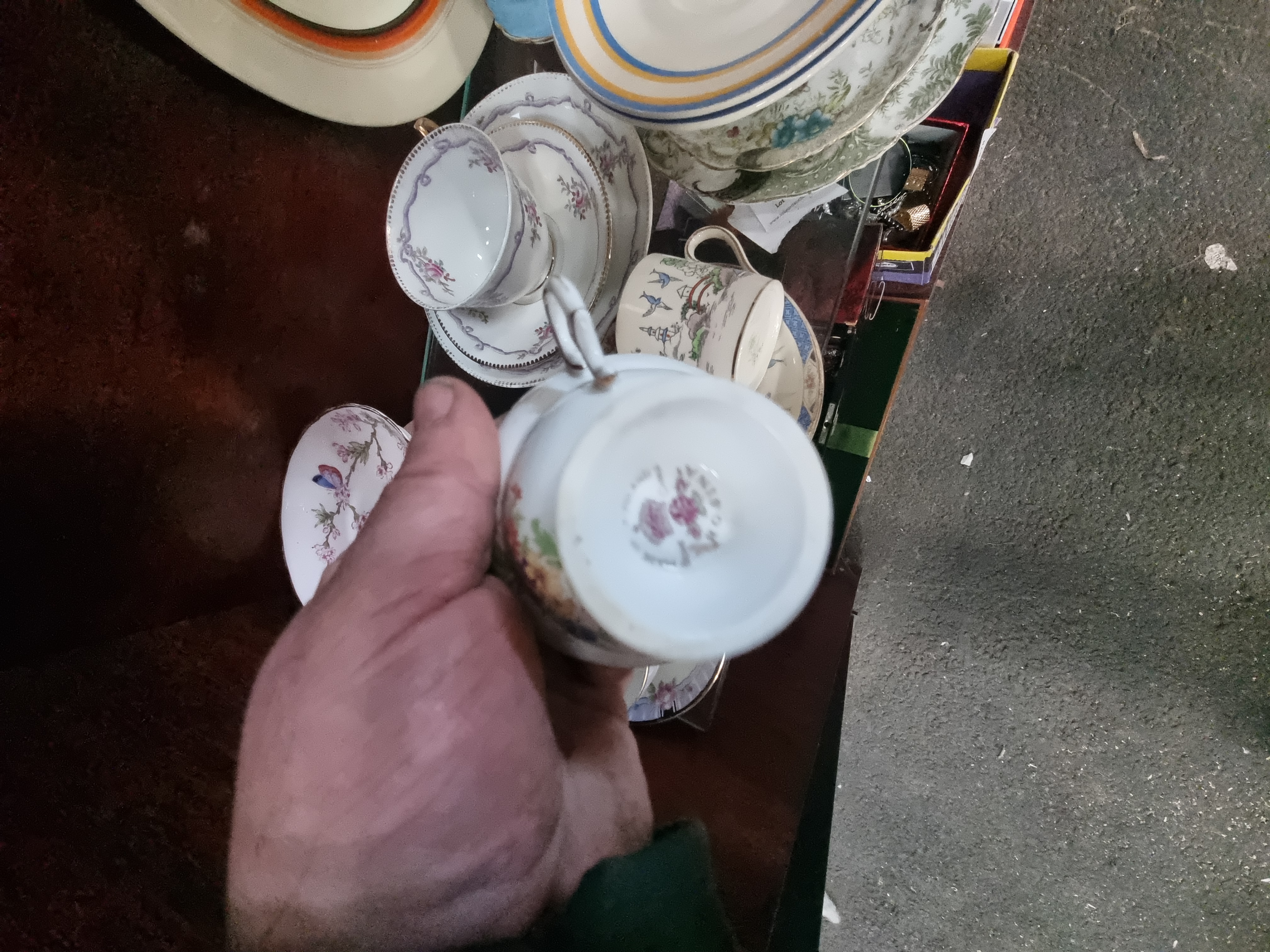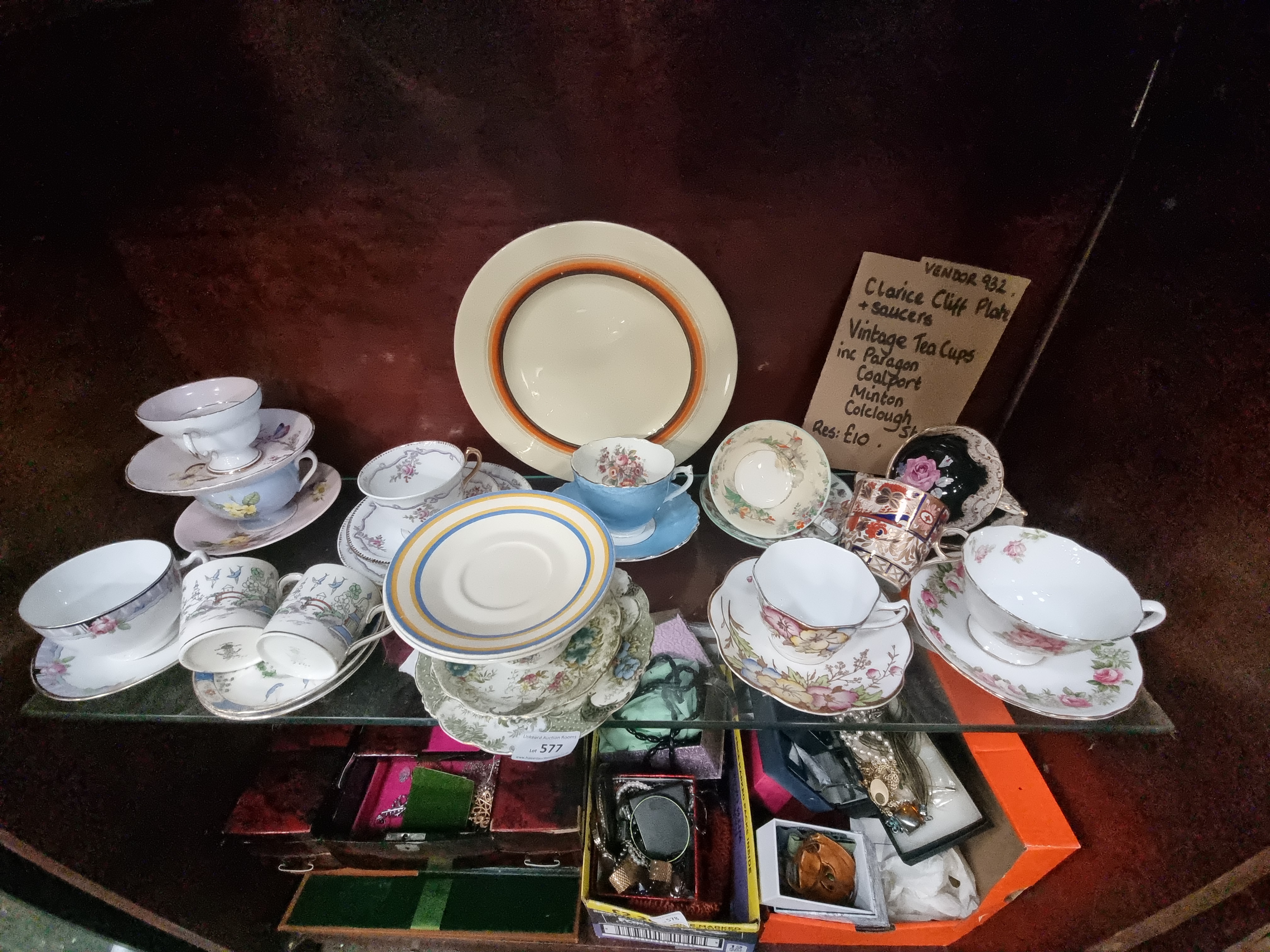 The Clarice Cliff items show light surface wear and minor paint loss to the hand-painted rings consistent with age. The Paragon tea ware appears in good condition. Other cups and saucers exhibit varying degrees of wear to the gilt rims and light surface marks. No major chips, cracks, or repairs are visible upon inspection. Fine crazing may be present on earthenware pieces.