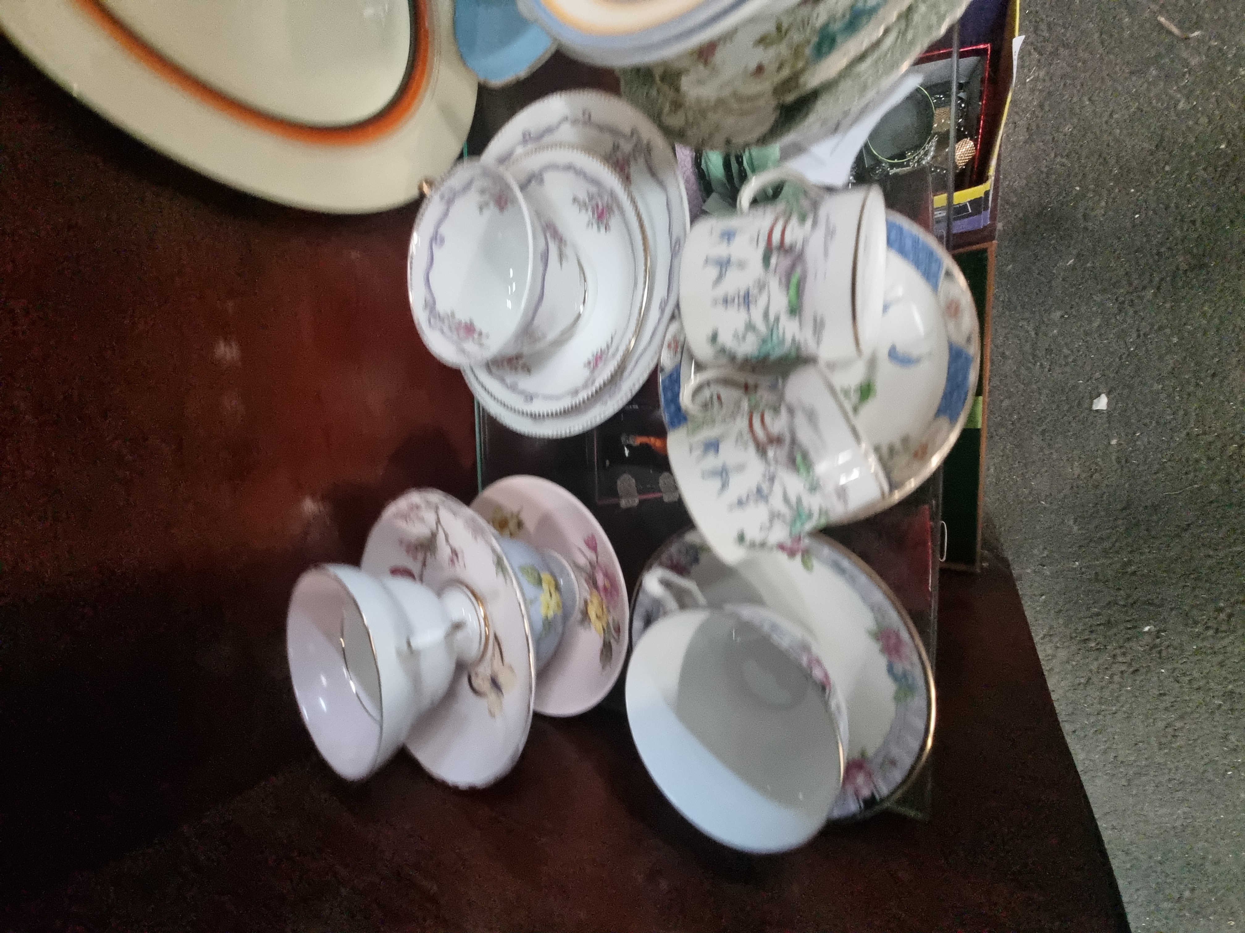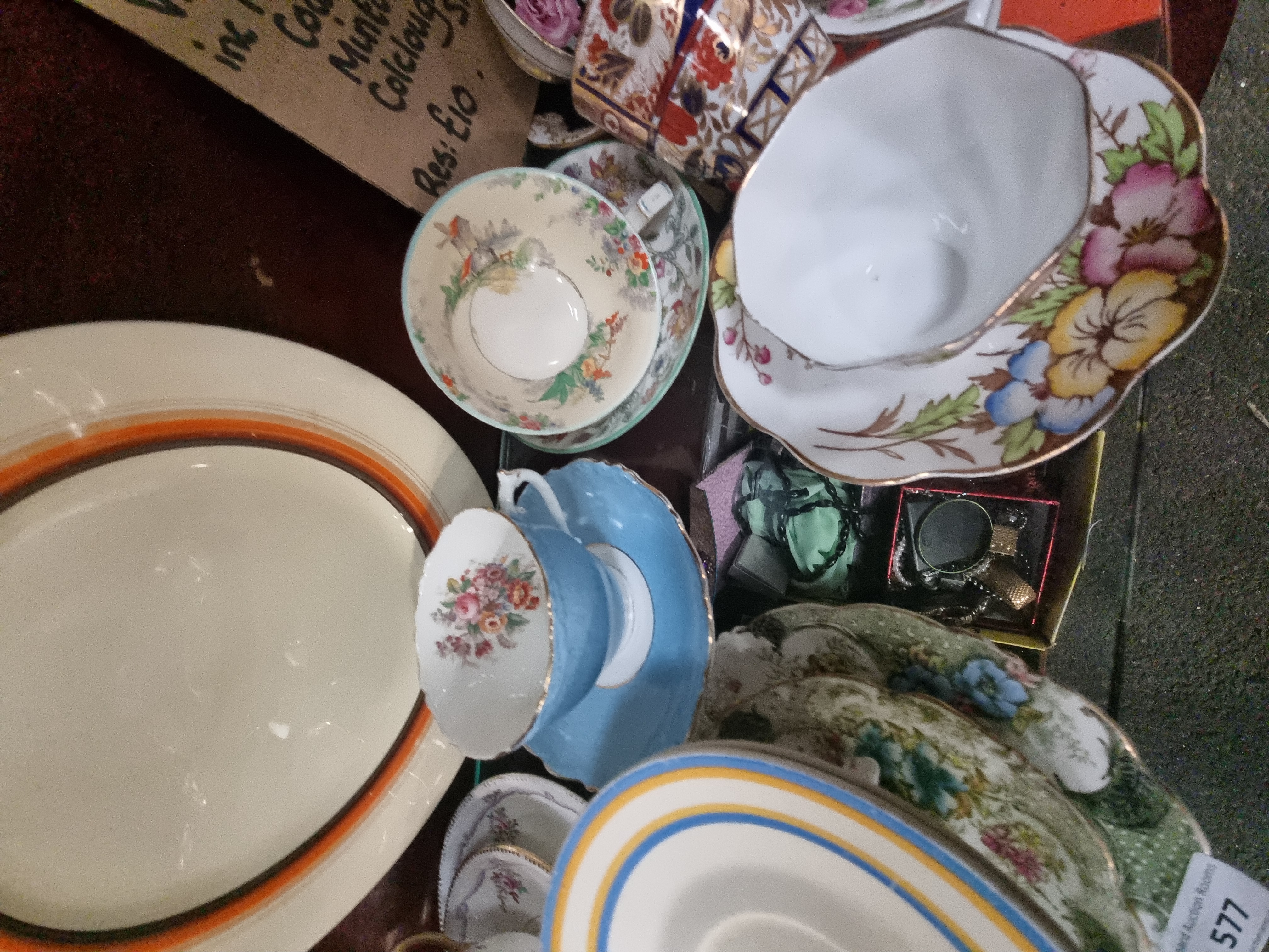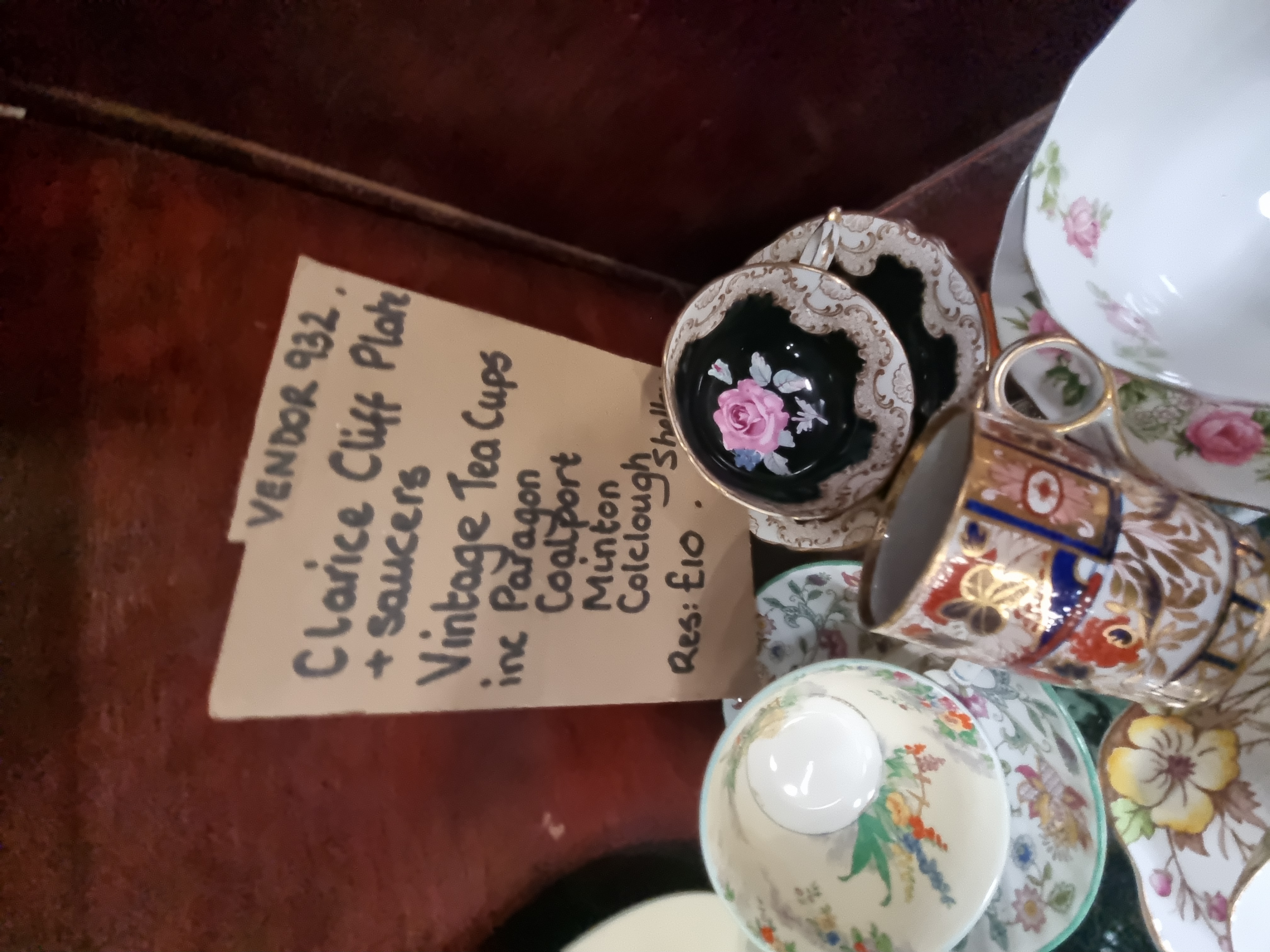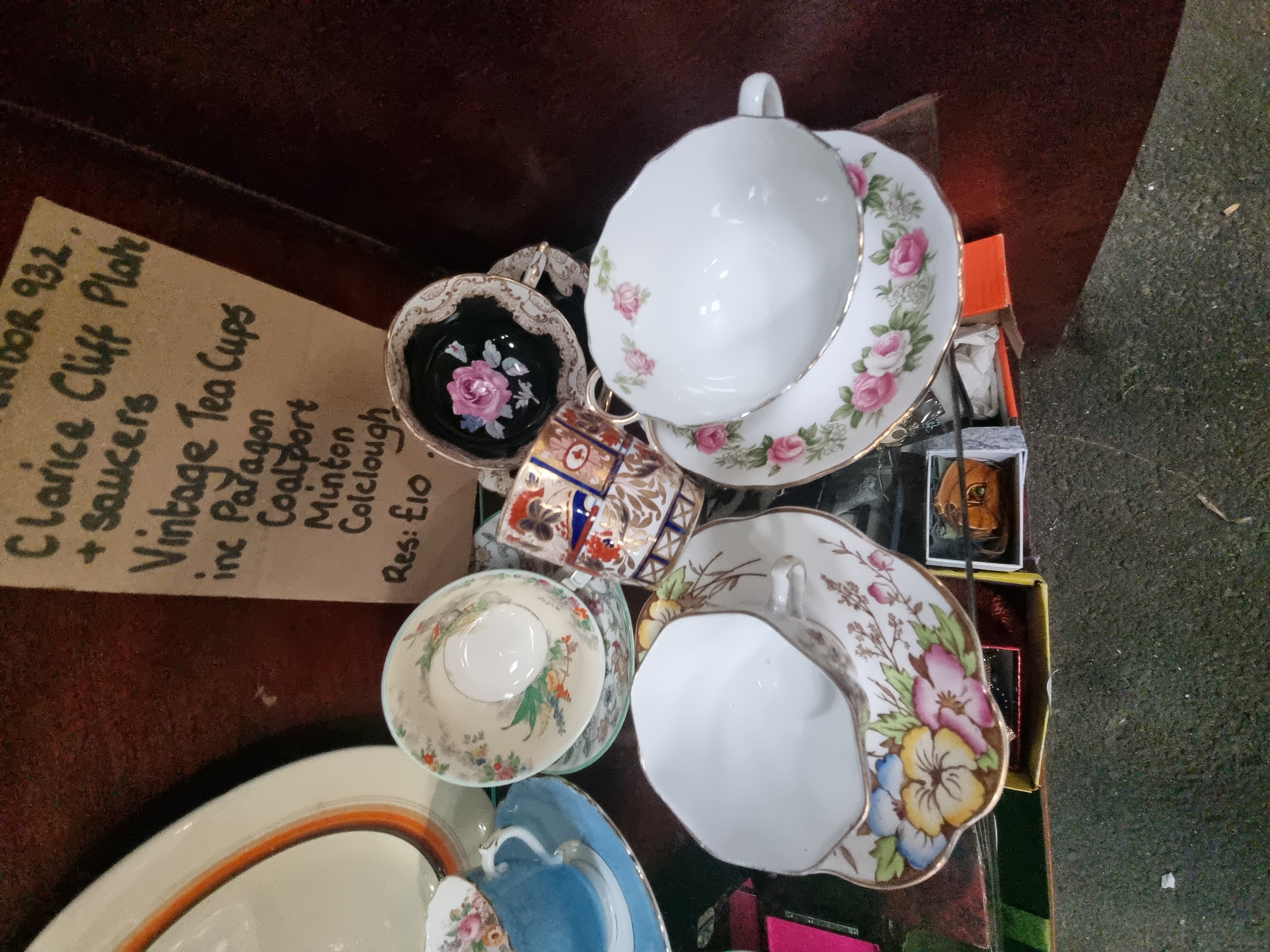 A collection of decorative ceramics featuring mid-20th-century English pottery. The lot includes a Clarice Cliff Bizarre range earthenware plate and two matching saucers, hand-painted with concentric rings in orange, yellow, blue, and dark brown. These pieces bear the Newport Pottery backstamp. Also included is a Paragon fine bone china tea cup and saucer in the Elizabeth Rose pattern, decorated with a pink rose and green foliage with gilt rims, bearing the royal warrant mark for Her Majesty the Queen. The collection further contains various tea cups and saucers, including an Imari-style pattern with cobalt blue and orange floral motifs, examples with transfer-printed landscape scenes, and a cup with bird and blossom decoration. Vendor notes attribute these additional pieces to makers including Coalport, Minton, and Colclough.