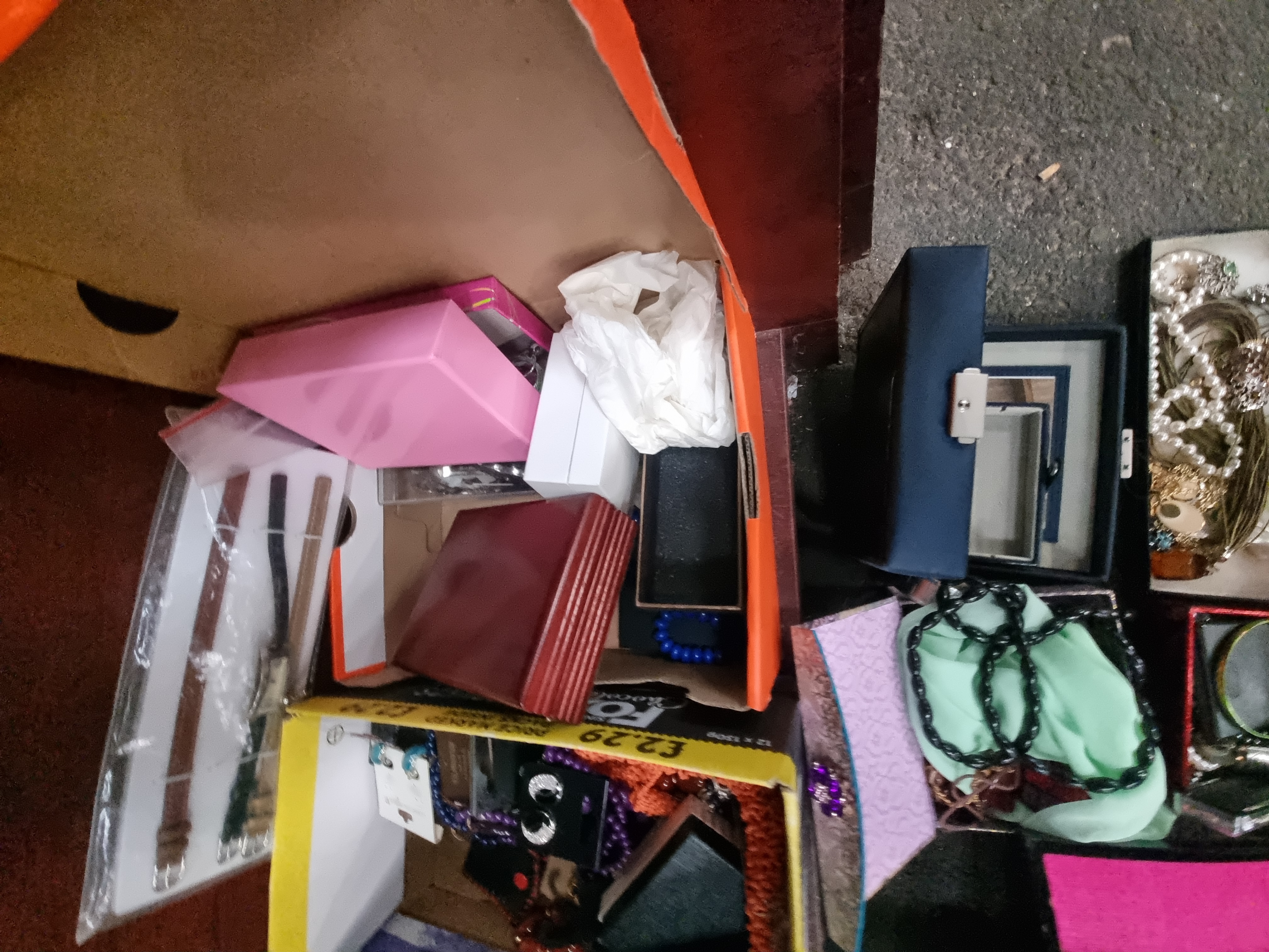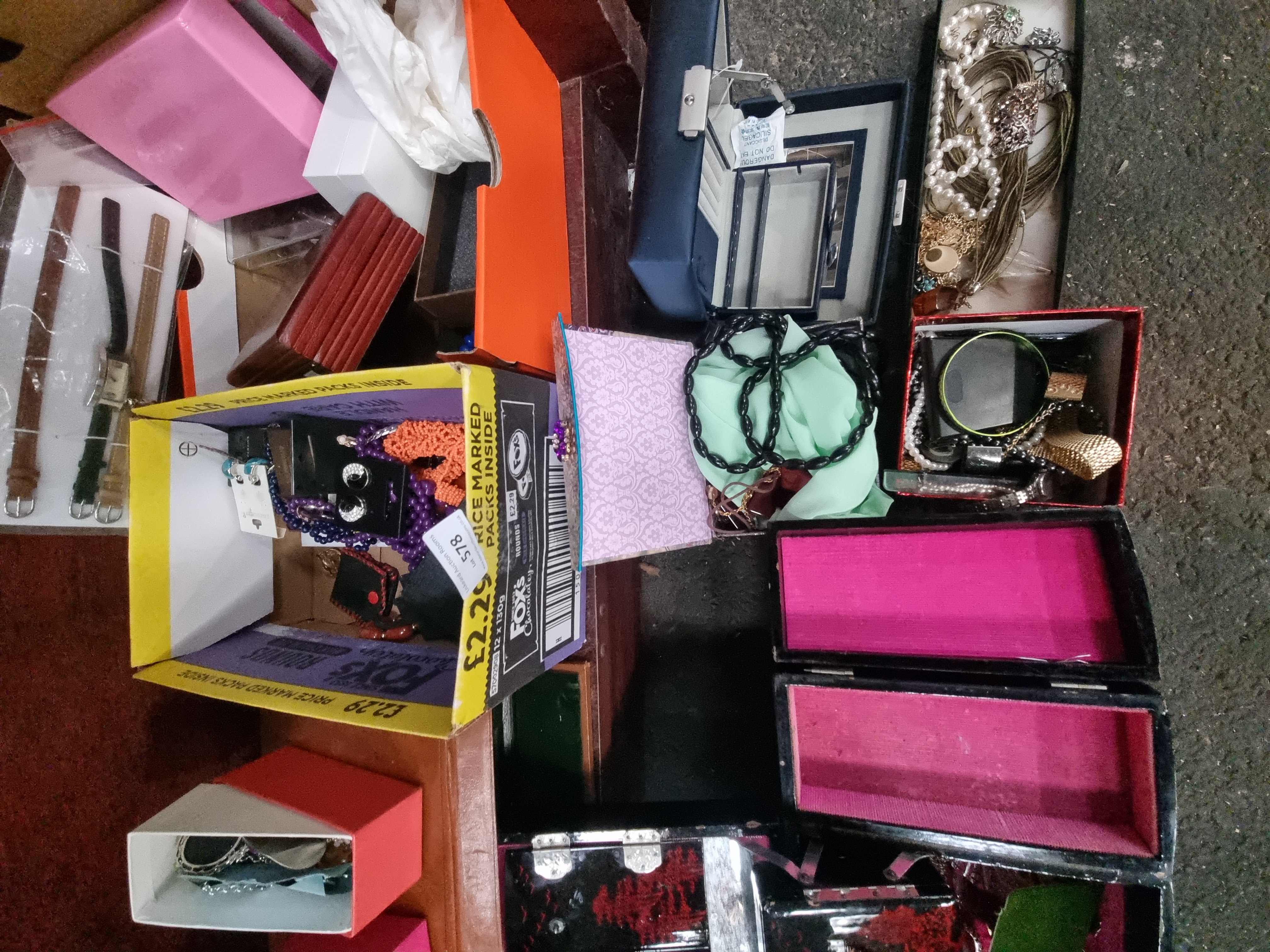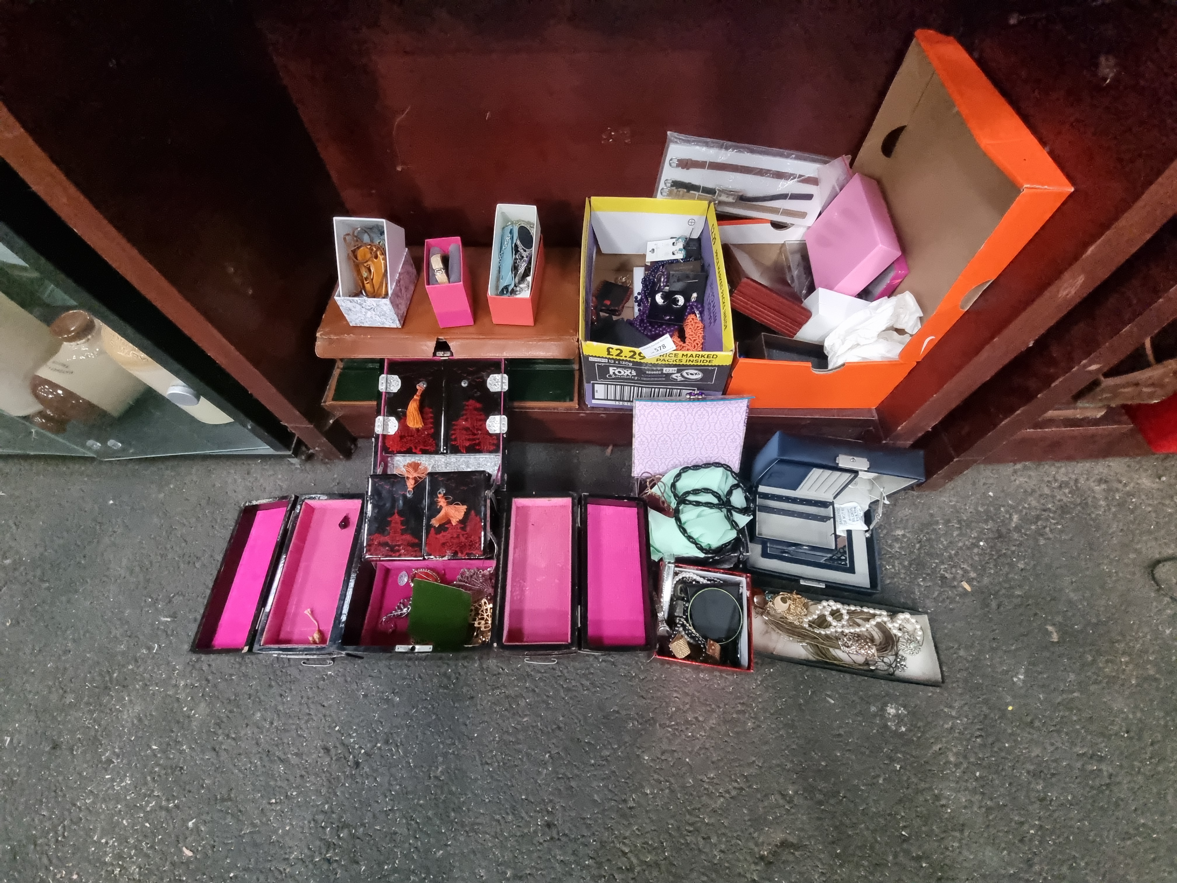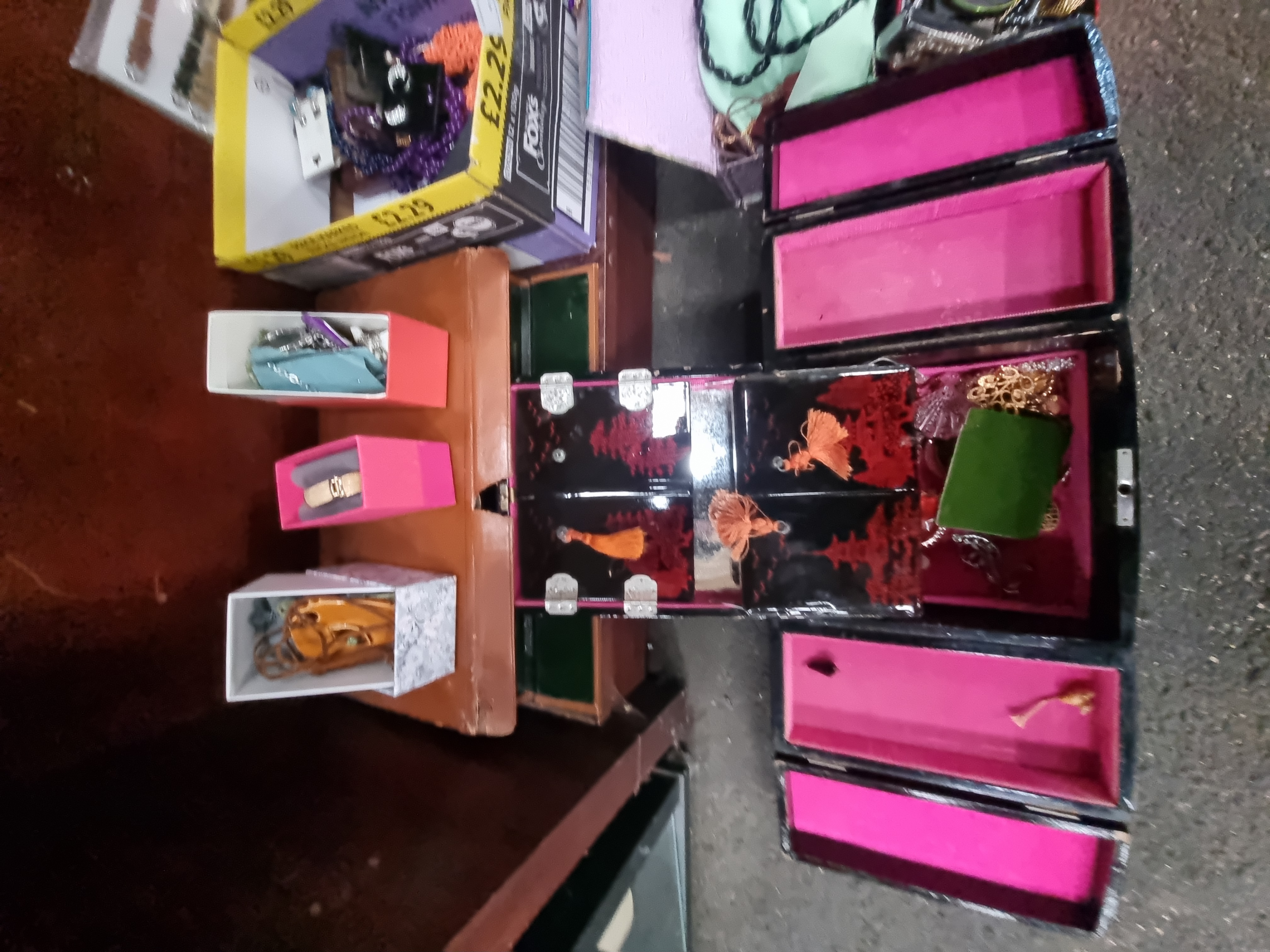 A collection of costume jewellery and accessories dating from the mid-to-late 20th century. The lot includes multiple necklaces featuring faux pearls and faceted glass and plastic beads. Also present is an assortment of earrings, some retained on original card backings, alongside various bangles and bracelets. A ladies gold-tone wristwatch is included with several loose leather watch straps. The items are housed in a variety of containers, notably a large multi-tiered black lacquer-effect jewellery box decorated with red and gold-tone Orientalist landscapes depicting temples and trees, lined with pink fabric. Other storage includes a blue faux-leather hinged box and several small cardboard presentation boxes. Materials consist of gold-tone and silver-tone base metals, rhinestones, and synthetic beads. No makers marks are visible on the primary jewellery items.