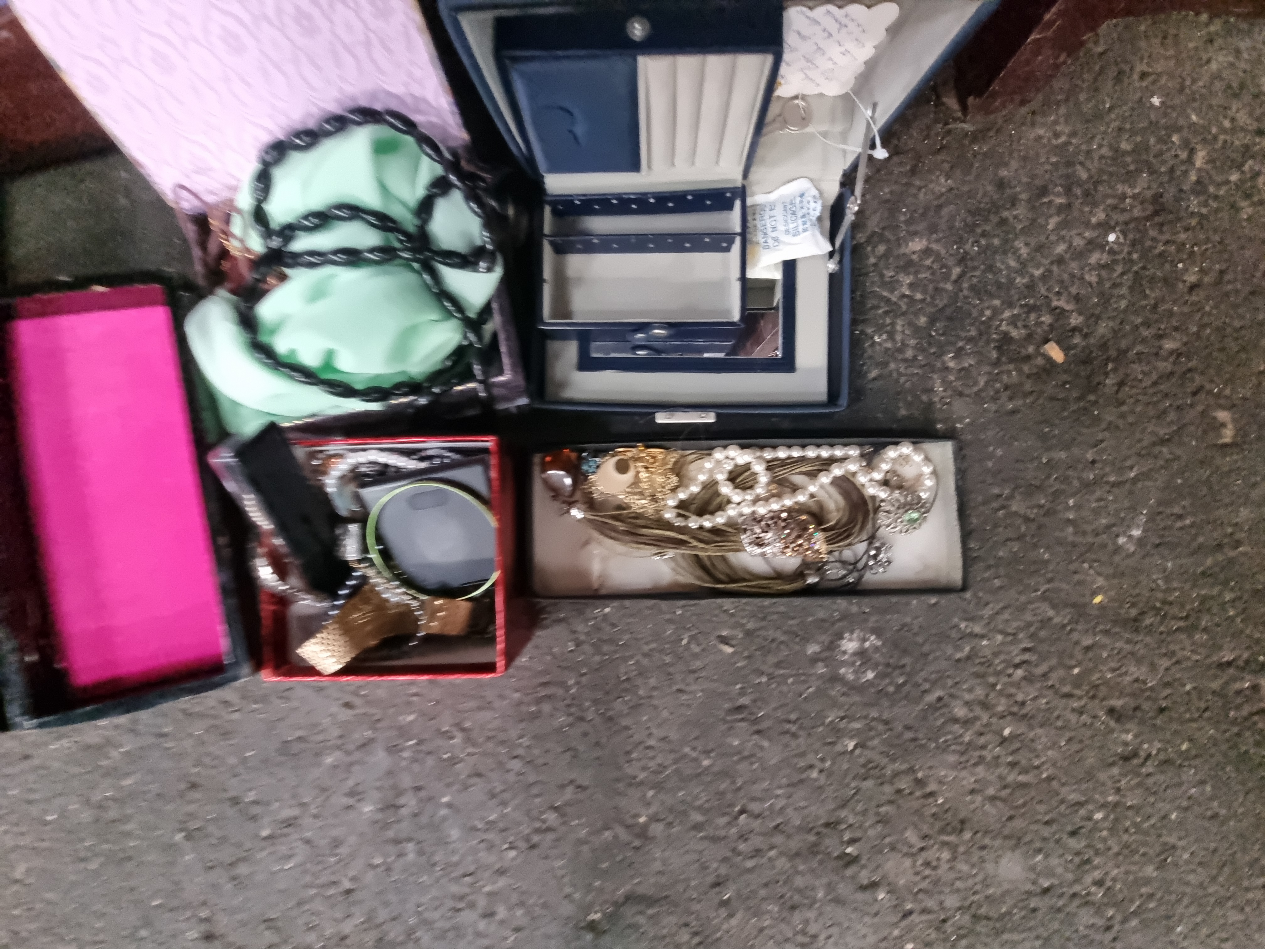 The collection is in fair to good condition, showing wear consistent with age and use. Some necklaces are tangled within their containers. The lacquer-effect box exhibits minor surface wear but remains functional. The lot is sold as seen.