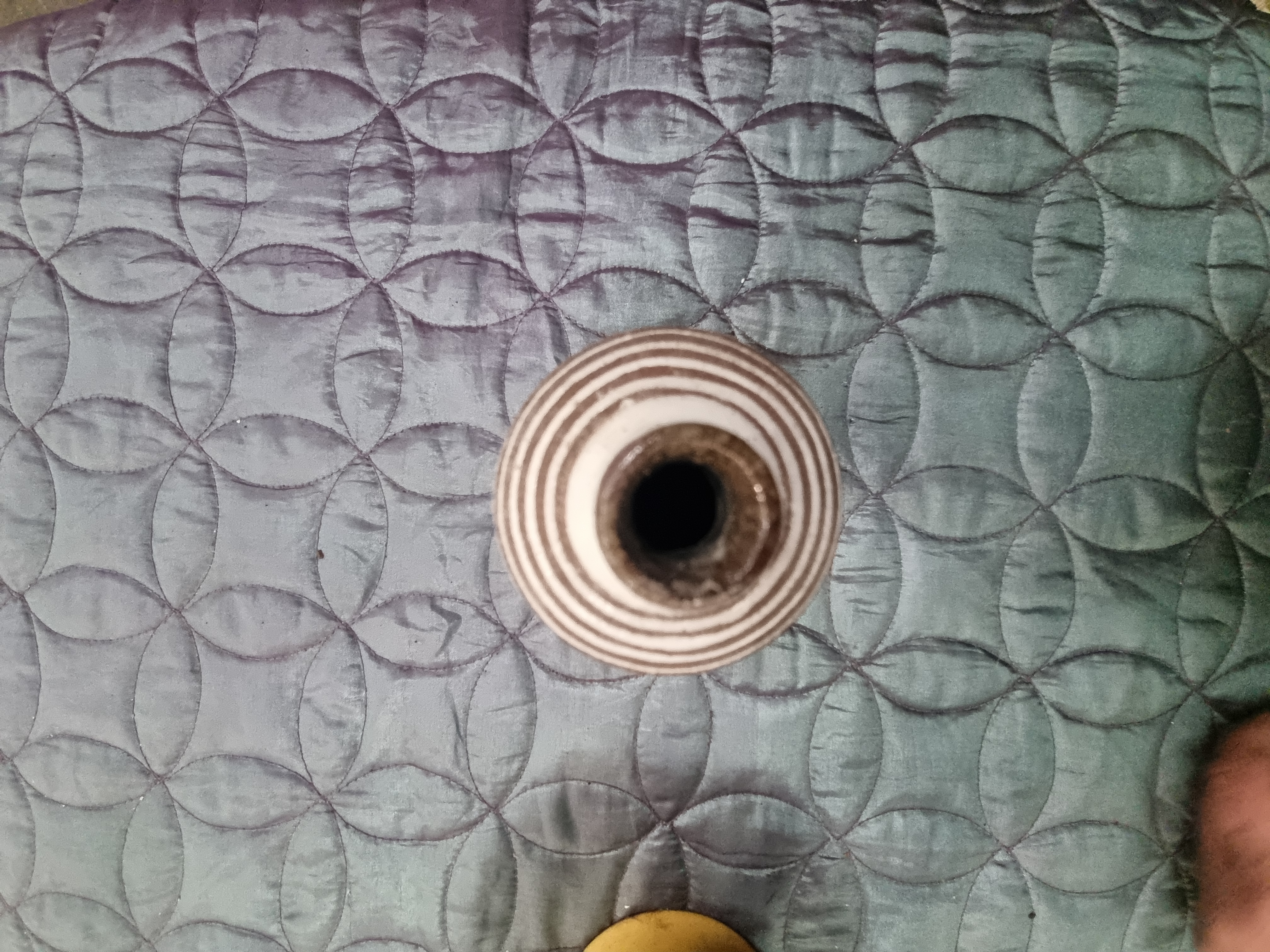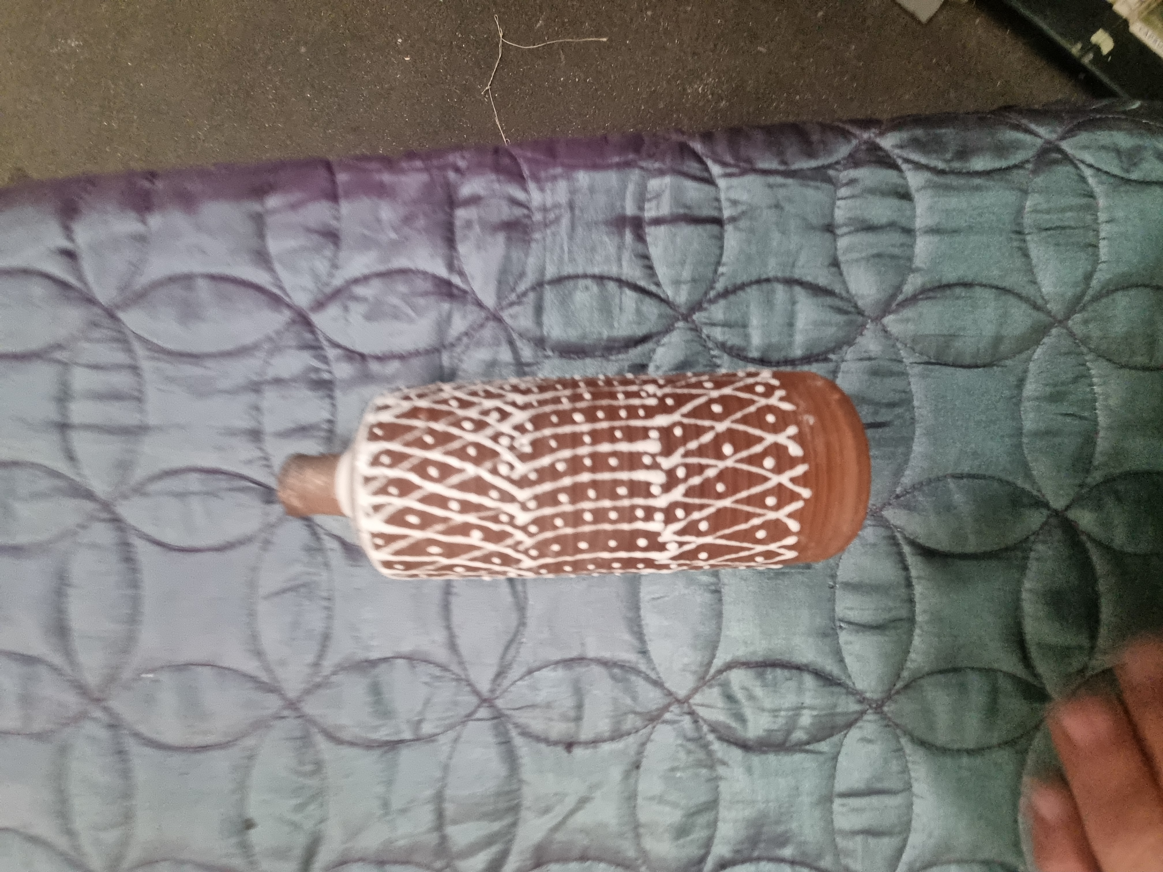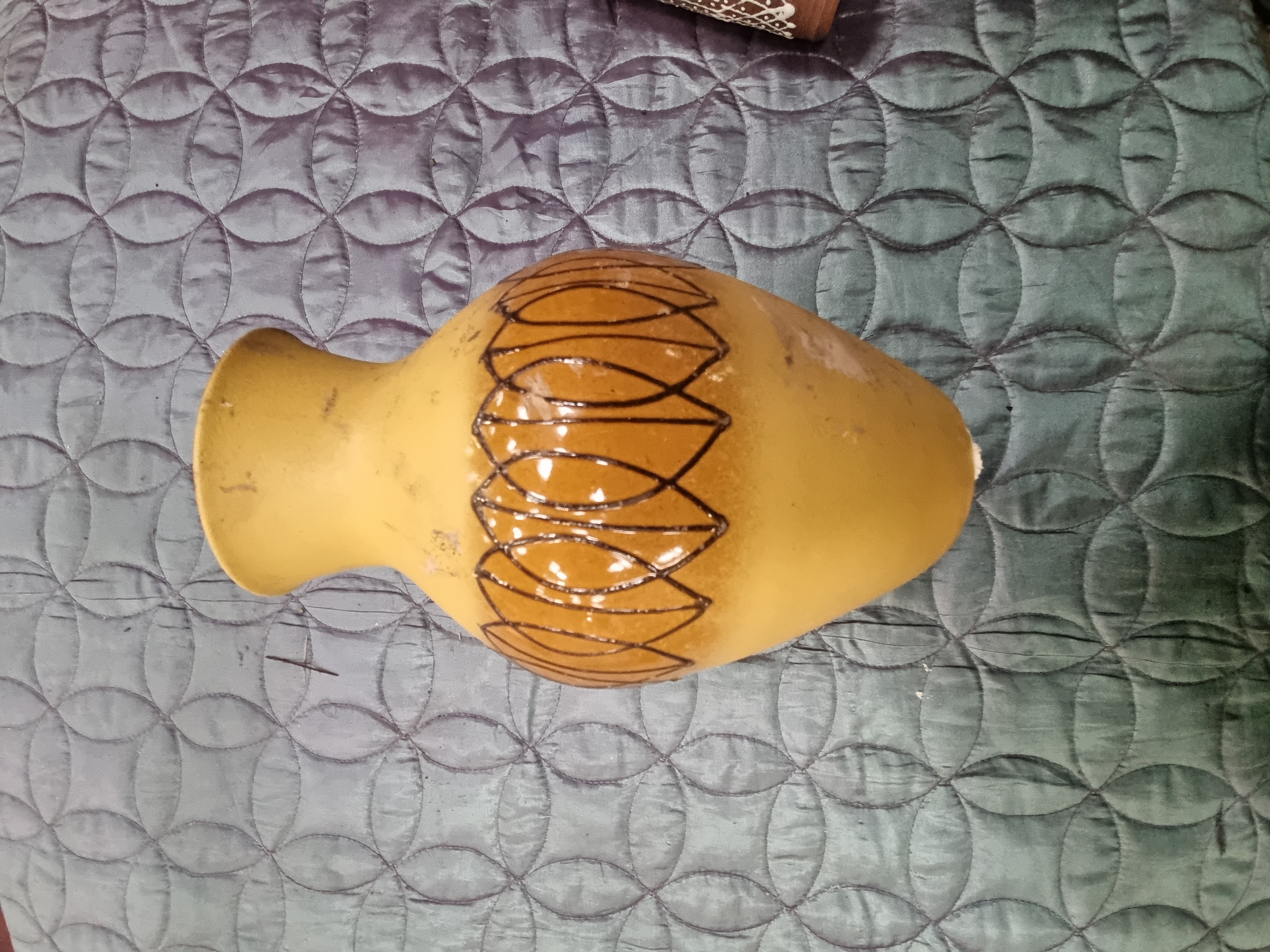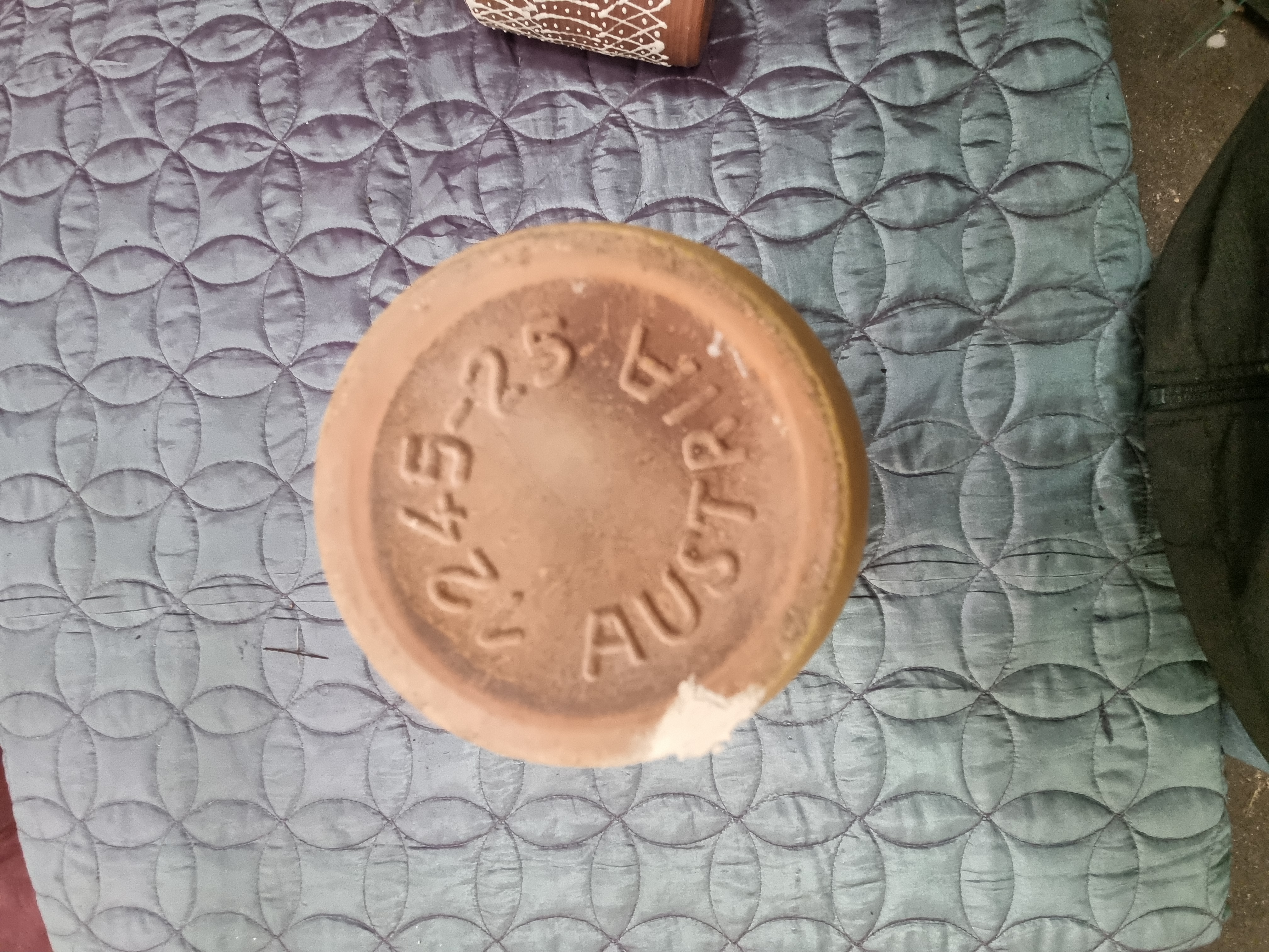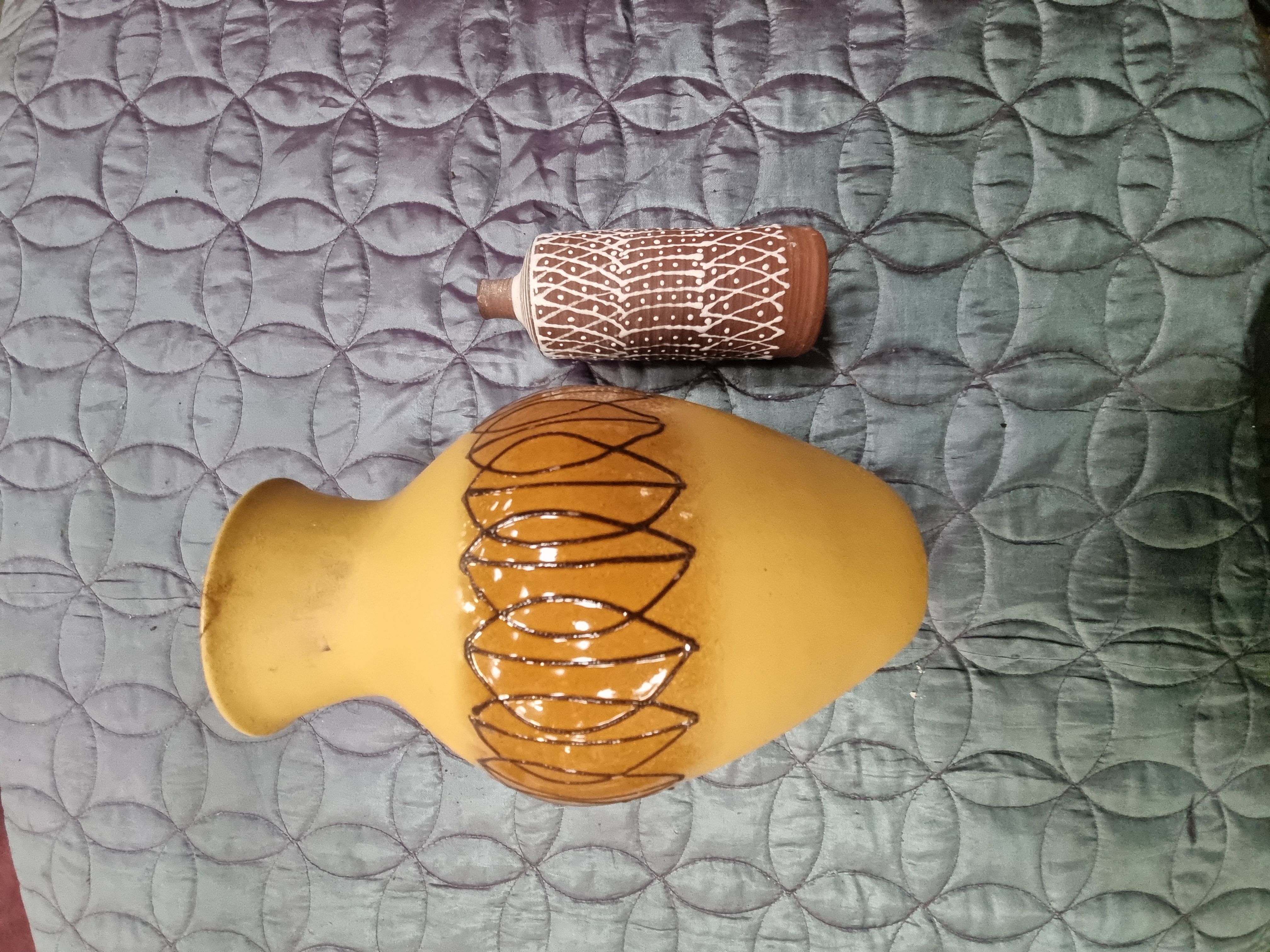 This lot features two distinct pieces of European earthenware. The first is an Austrian art pottery vase of ovoid baluster form with a flared neck and wide rim. It is finished in a mustard-yellow ochre glaze featuring a central decorative band of incised sgraffito geometric motifs in a repeating pattern of overlapping ellipses, highlighted with a dark brown glaze. The unglazed base is impressed with the factory numbers 1245-25 and the word AUSTRIA. The second item is a Greek studio pottery bottle crafted from red earthenware terracotta. It has a cylindrical body and a narrow neck, decorated with white slip over a brown-stained ground. The decoration consists of a sgraffito lattice or net-like design with dot accents at the intersections, while the neck features concentric white rings. The base is hand-incised with the word Rhodes and the number 72.