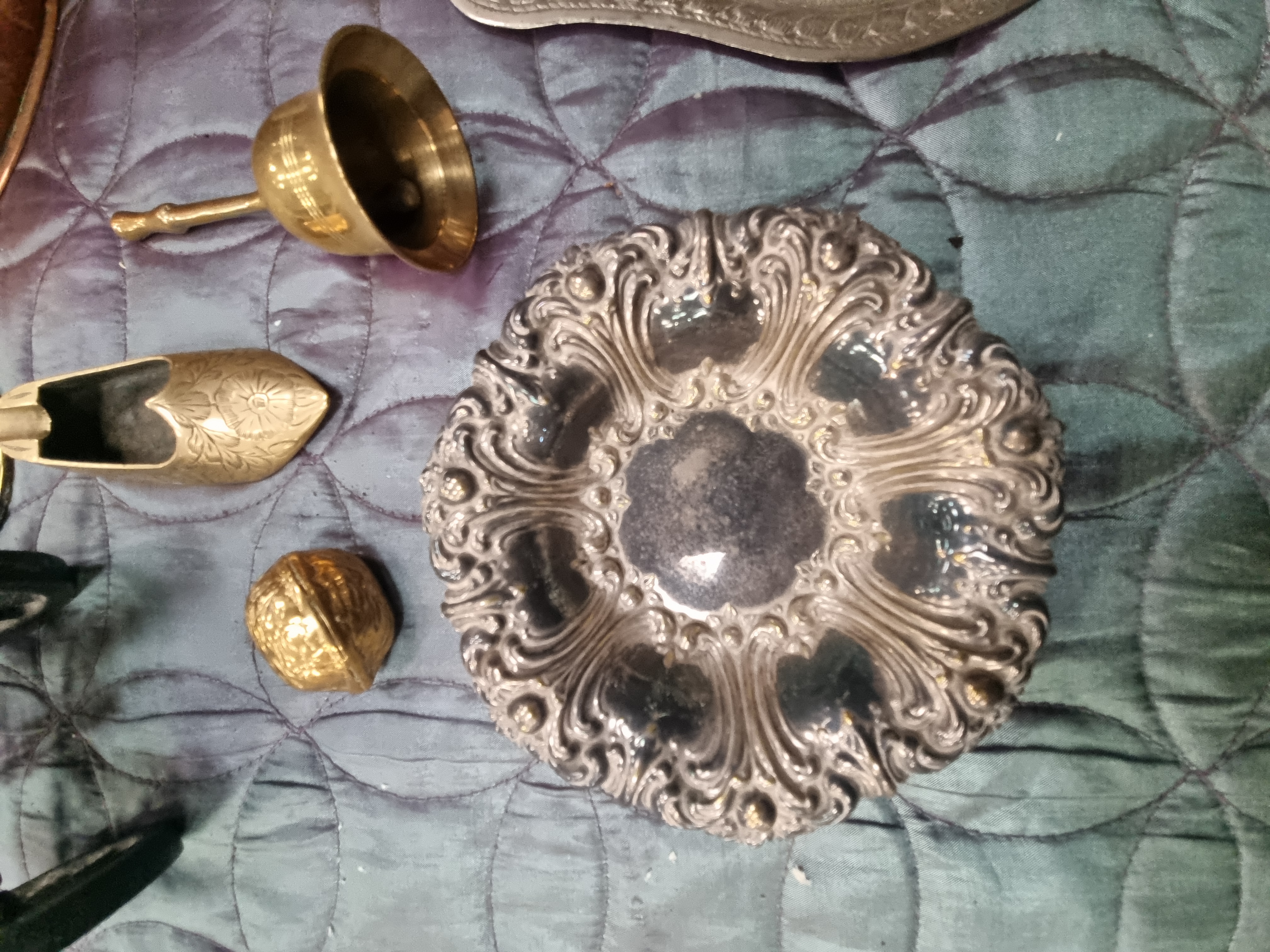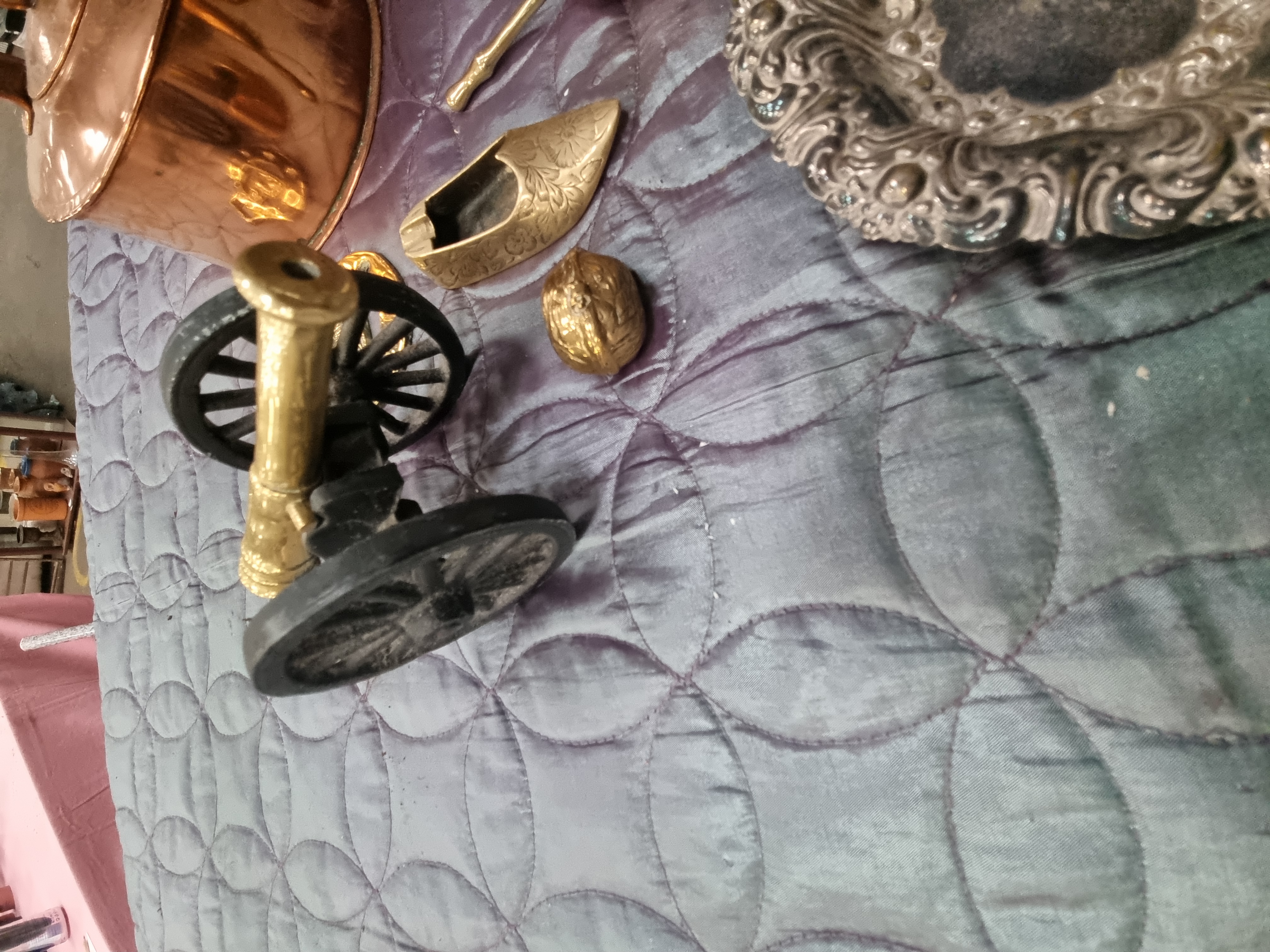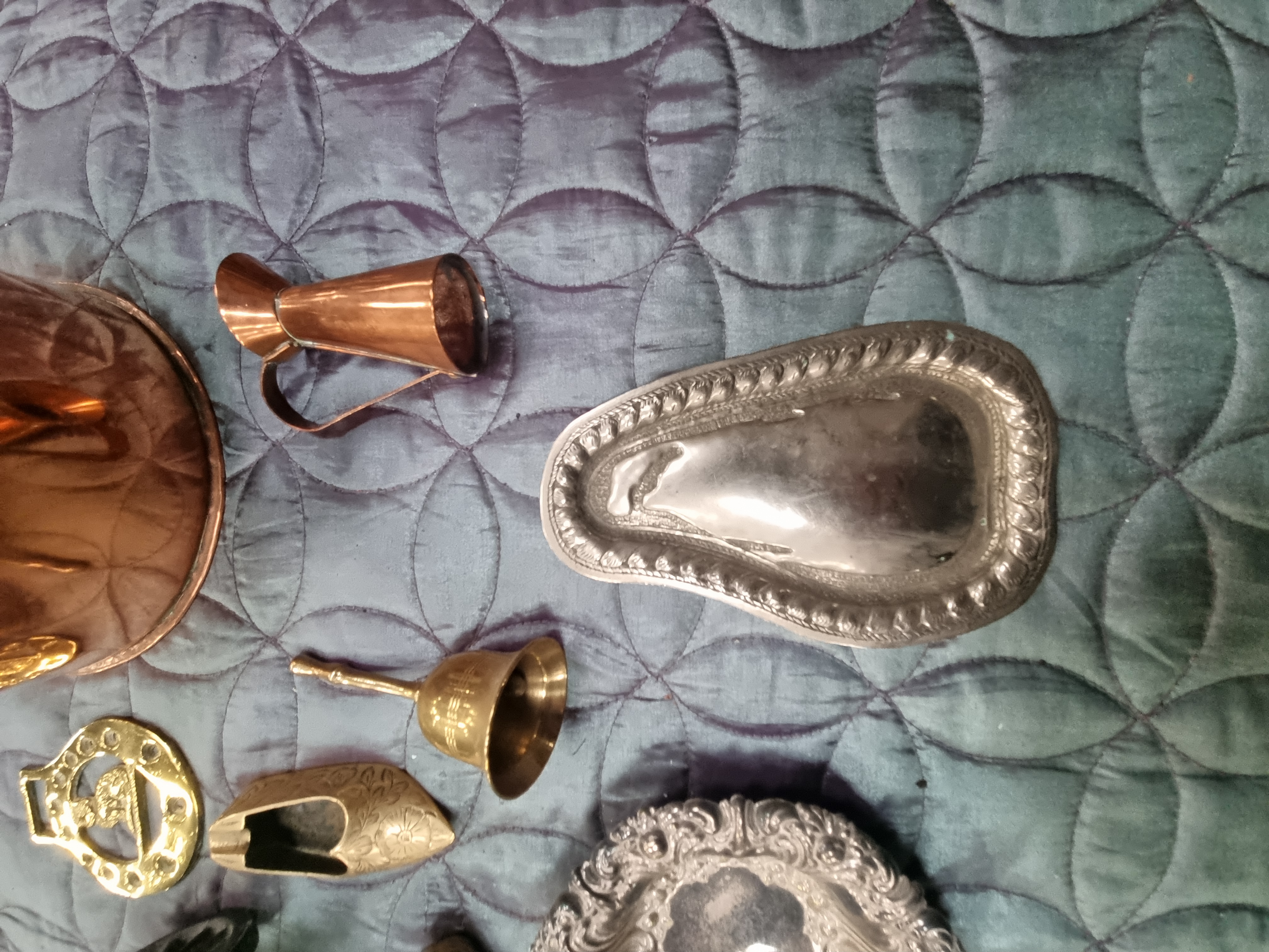This collection of metalware comprises various decorative and functional items, primarily in 19th and 20th-century British styles. The lot includes a large polished copper kettle of Victorian form, featuring a fixed strap handle, a gooseneck spout, and seamed construction. Accompanying the kettle is a small conical copper spirit measure with a simple strap handle. The silver-plated items consist of an oval tray with a raised gadrooned border and a circular dish decorated with Rococo-style repoussé scrollwork and foliate motifs. The brass and miscellaneous items include a model field cannon with a cast brass barrel and black-painted carriage, a novelty brass clog with embossed floral patterns, a small domestic handbell with a turned handle, a circular horse brass featuring a central emblem, and a small cast brass object in the shape of a walnut. No maker’s marks are visible on the exterior surfaces of these items.
