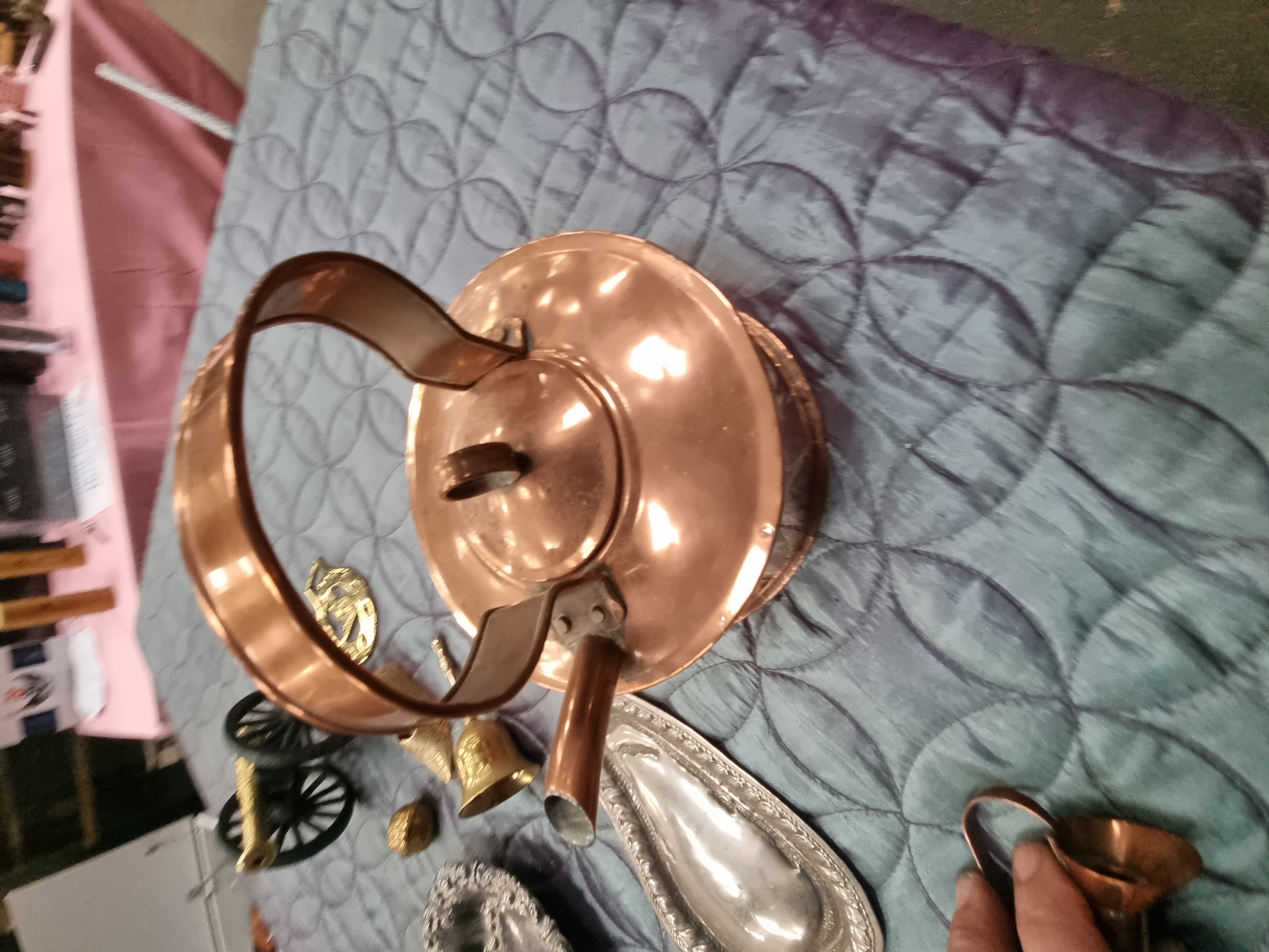 The items are in fair to good condition overall. The copper kettle has been polished to a high shine. The silver-plated pieces exhibit typical surface tarnish and oxidation. The brass items show a natural aged patina with minor surface wear and oxidation consistent with age and domestic use.