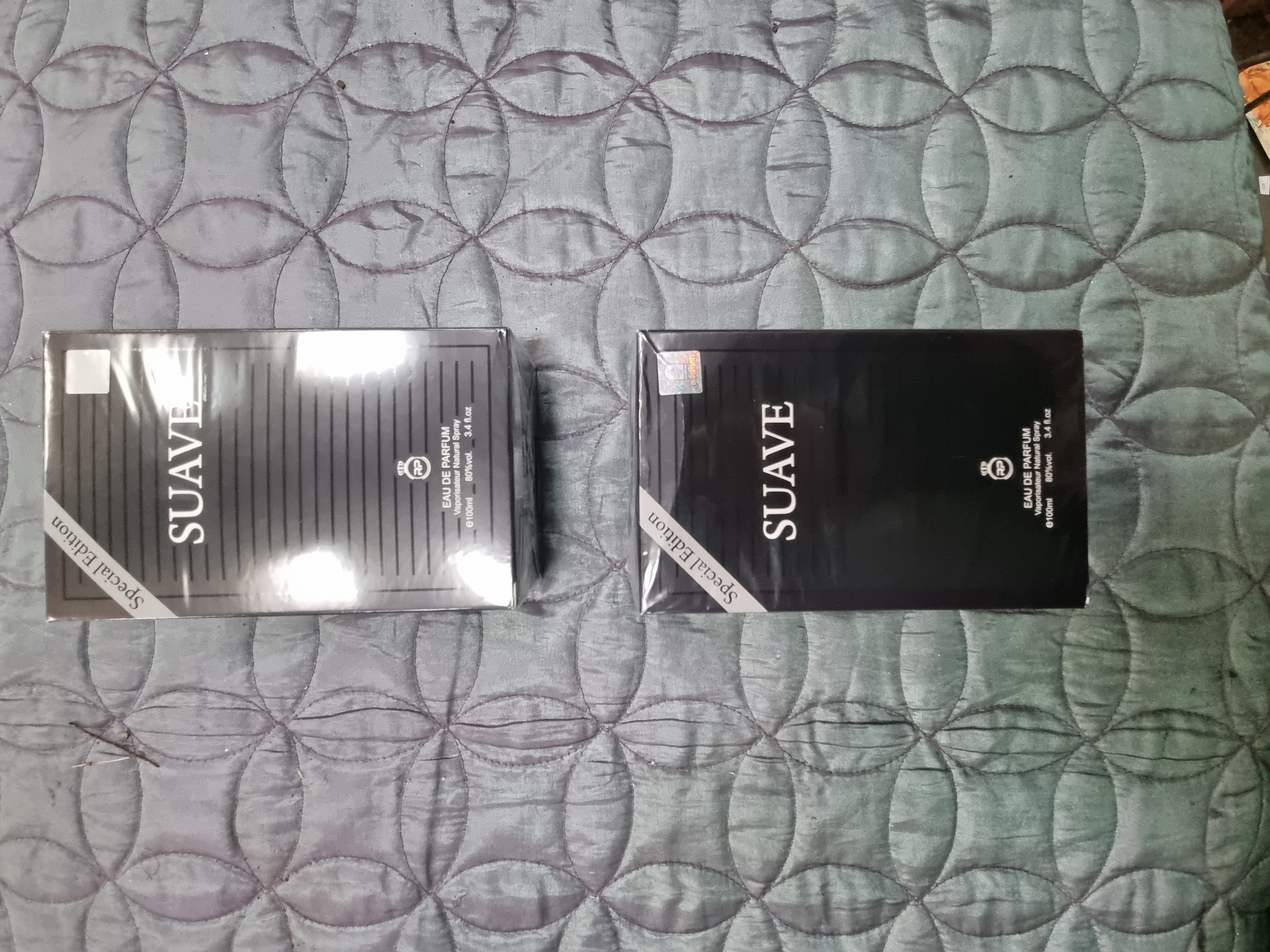 A group of Suave Special Edition eau de parfum, inspired by Dior Sauvage. Each 100ml (3.4 fl. oz) bottle is housed in its original black cardboard packaging featuring white and silver-toned lettering and a logo depicting a crown over the letters RP. The items are manufactured by Zak Perfumes, Dubai, UAE, and are attributed to the Fragrance World collection. The boxes are factory-sealed in clear plastic film. The reverse side of the packaging includes a detailed list of ingredients, safety warnings in both English and Arabic, and a manufacturer’s sticker indicating a production date of 12/2023 and an expiry date of 11/2028.