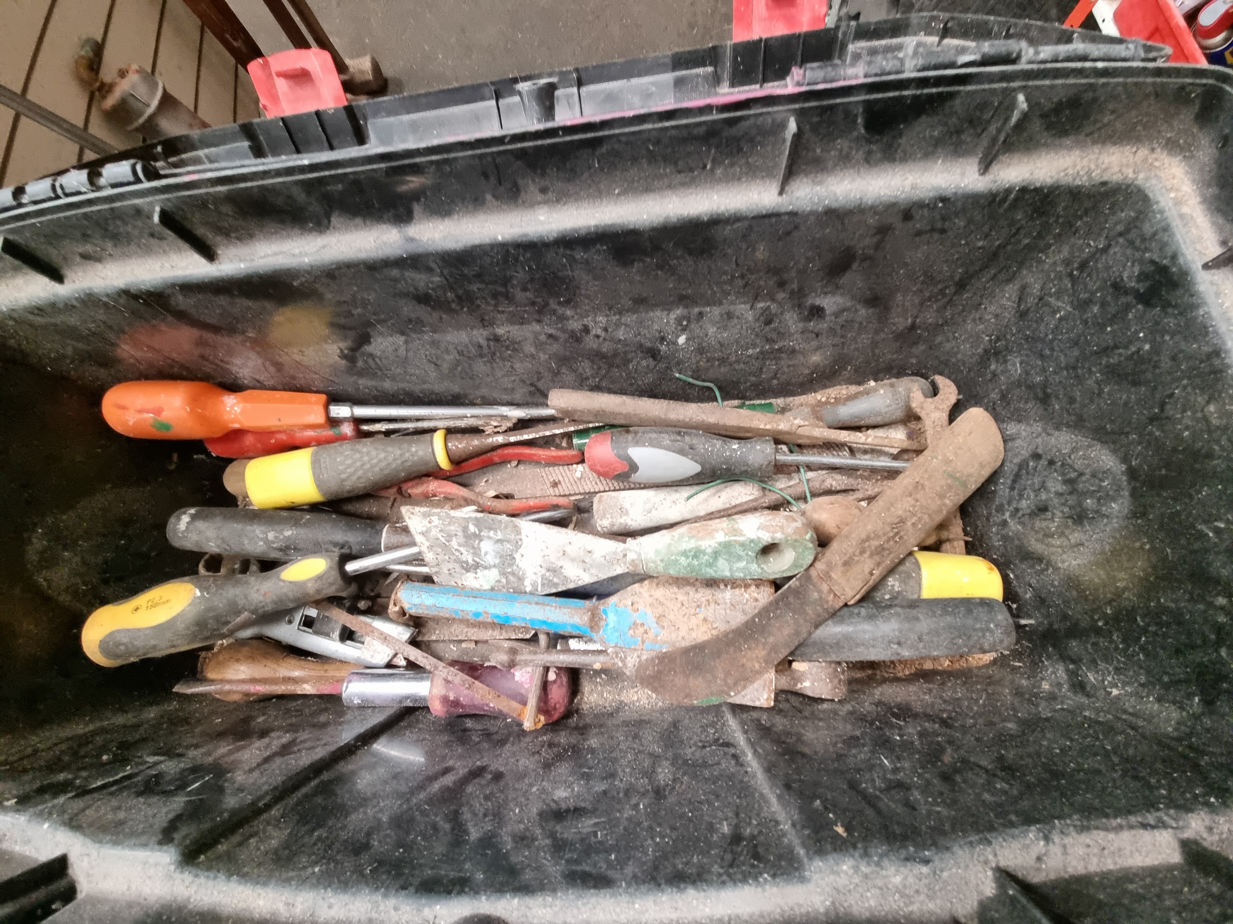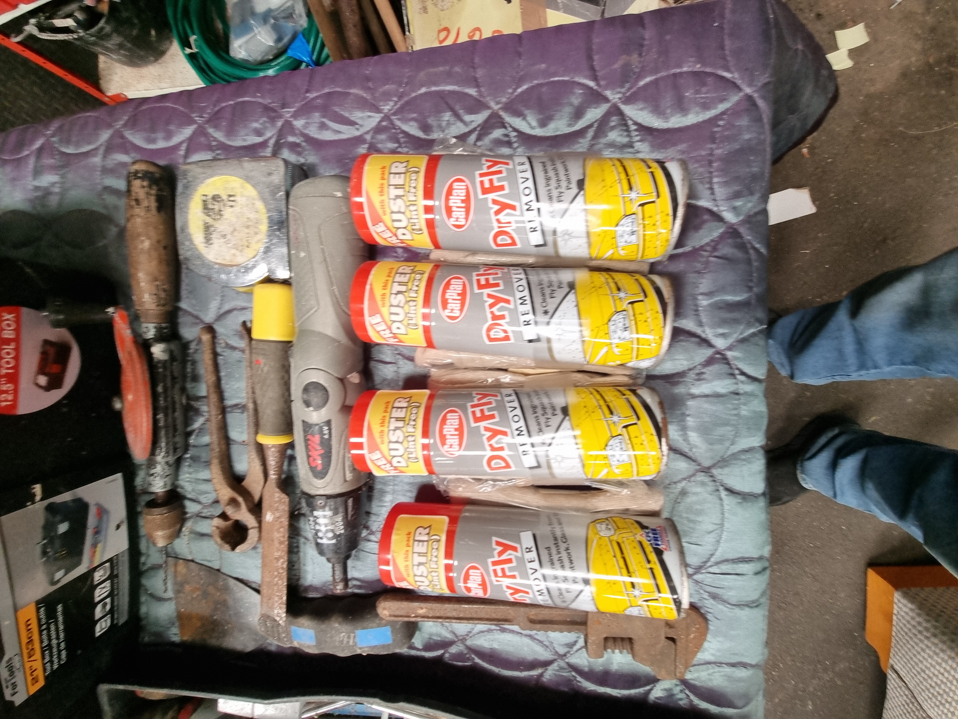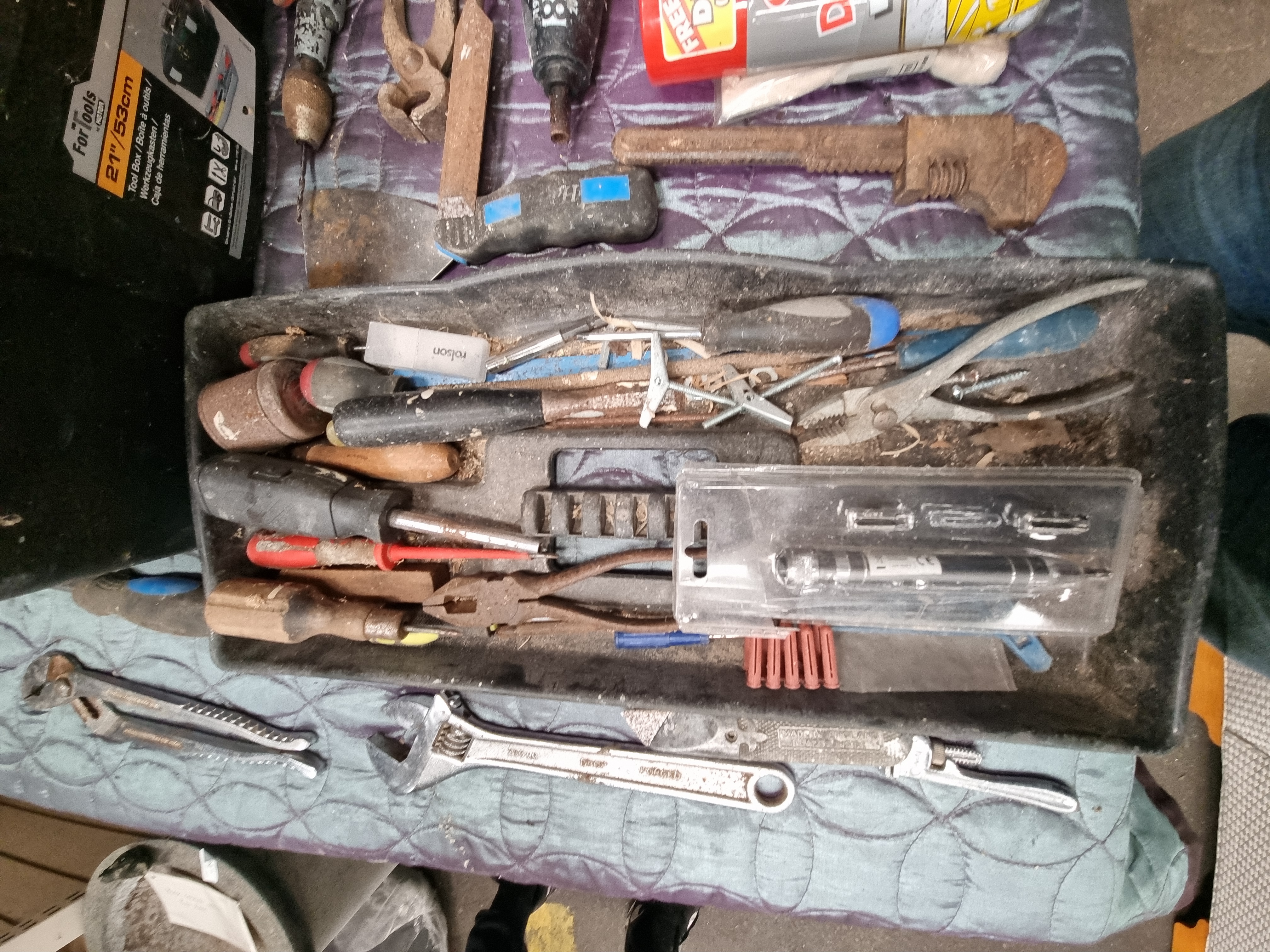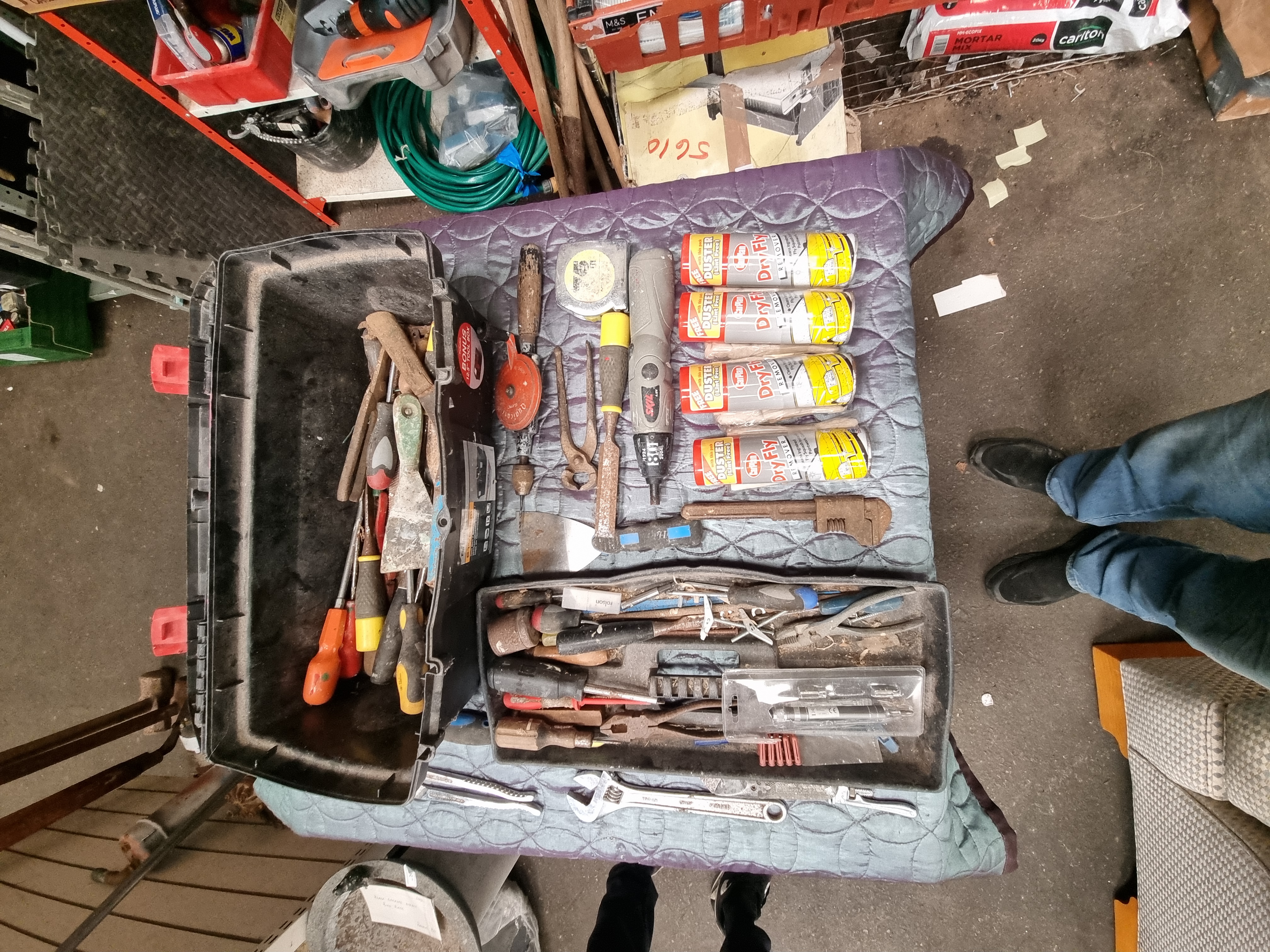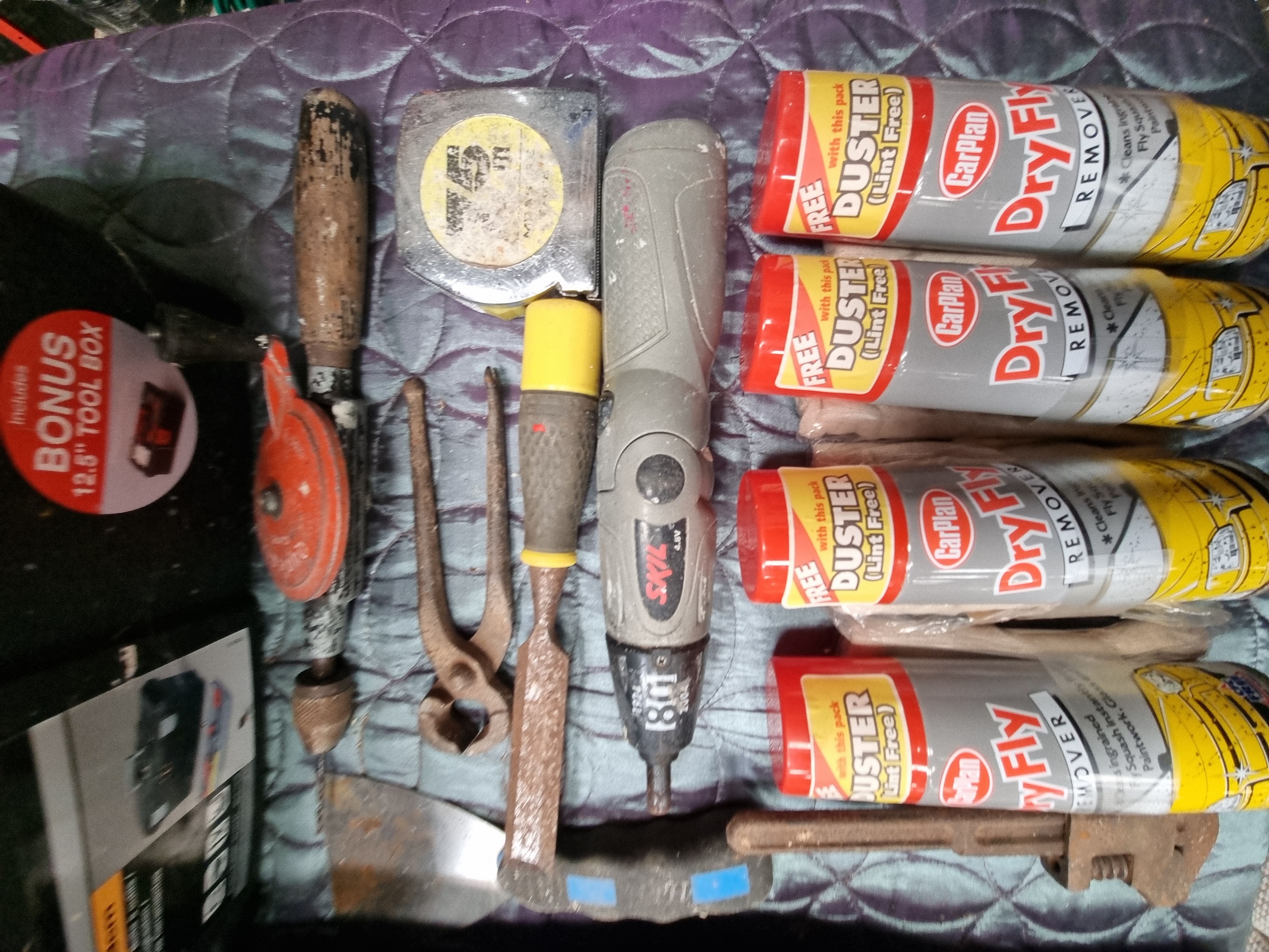 The items are in used, as-found condition. Significant surface rust is present on several steel hand tools, most notably the pipe wrench and certain pliers. Tools show evidence of heavy workshop use, including accumulated dirt, grease, and wear to the handles. The Skil cordless screwdriver is untested and lacks a charger. The CarPlan aerosol cans appear unused but are older stock. The plastic toolbox exhibits typical scuffs and surface soiling.