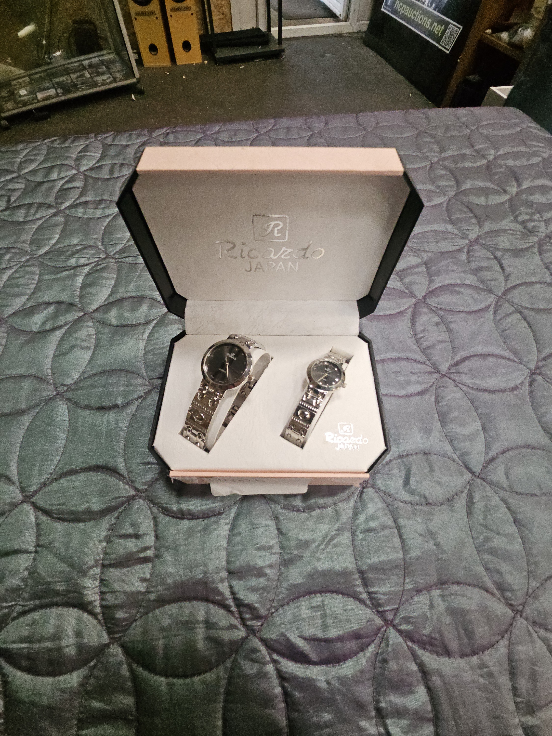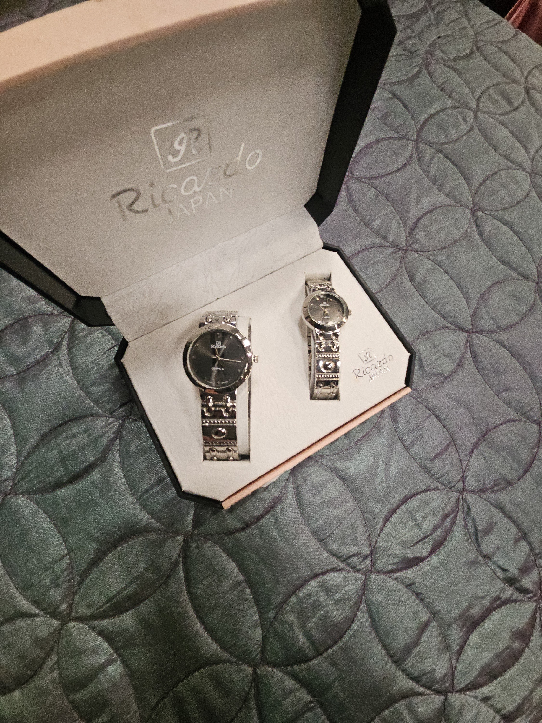 A matching pair of gents and ladies wristwatches by Ricardo. Each watch features a black dial with silver-tone hands and a single dot marker at the 12 o’clock position. The dials are marked with a stylized R logo and the brand name Ricardo below the 12 o’clock position, with the word Quartz above the 6 o’clock position. The cases and integrated bracelets are constructed from polished silver-tone metal, with the bracelets featuring embossed decorative patterns including circles and geometric shapes. The set is housed in its original branded Ricardo Japan presentation box.