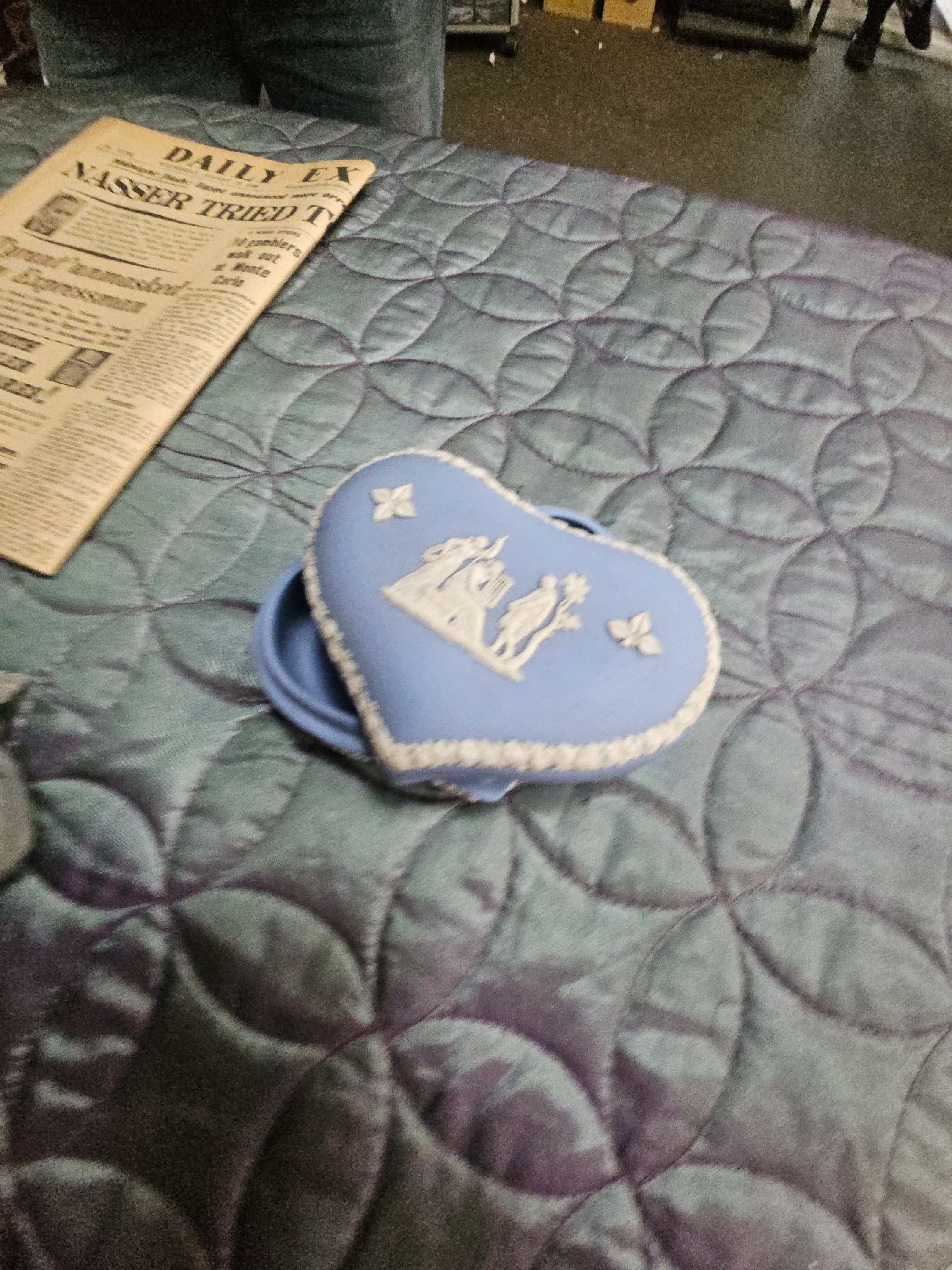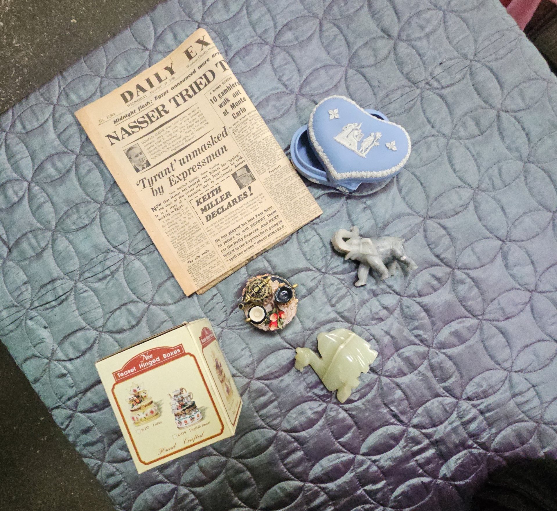 A group of decorative items and ephemera. The lot includes a heart-shaped blue jasperware trinket box featuring white sprigged relief decoration of classical figures and foliate borders, in the style of Wedgwood. Also included is a vintage edition of the Daily Express newspaper dated Wednesday 29 August 1956, with headlines relating to the Suez Crisis. The collection further contains a miniature hinged box designed as a floral tea set on a circular base, accompanied by its original cardboard packaging labelled Teaset Hinged Boxes. Completing the group are two carved stone animal figurines, including an elephant, fashioned from a semi-translucent pale green or grey stone, possibly onyx or soapstone. No maker’s marks are visible on the bases of the objects.