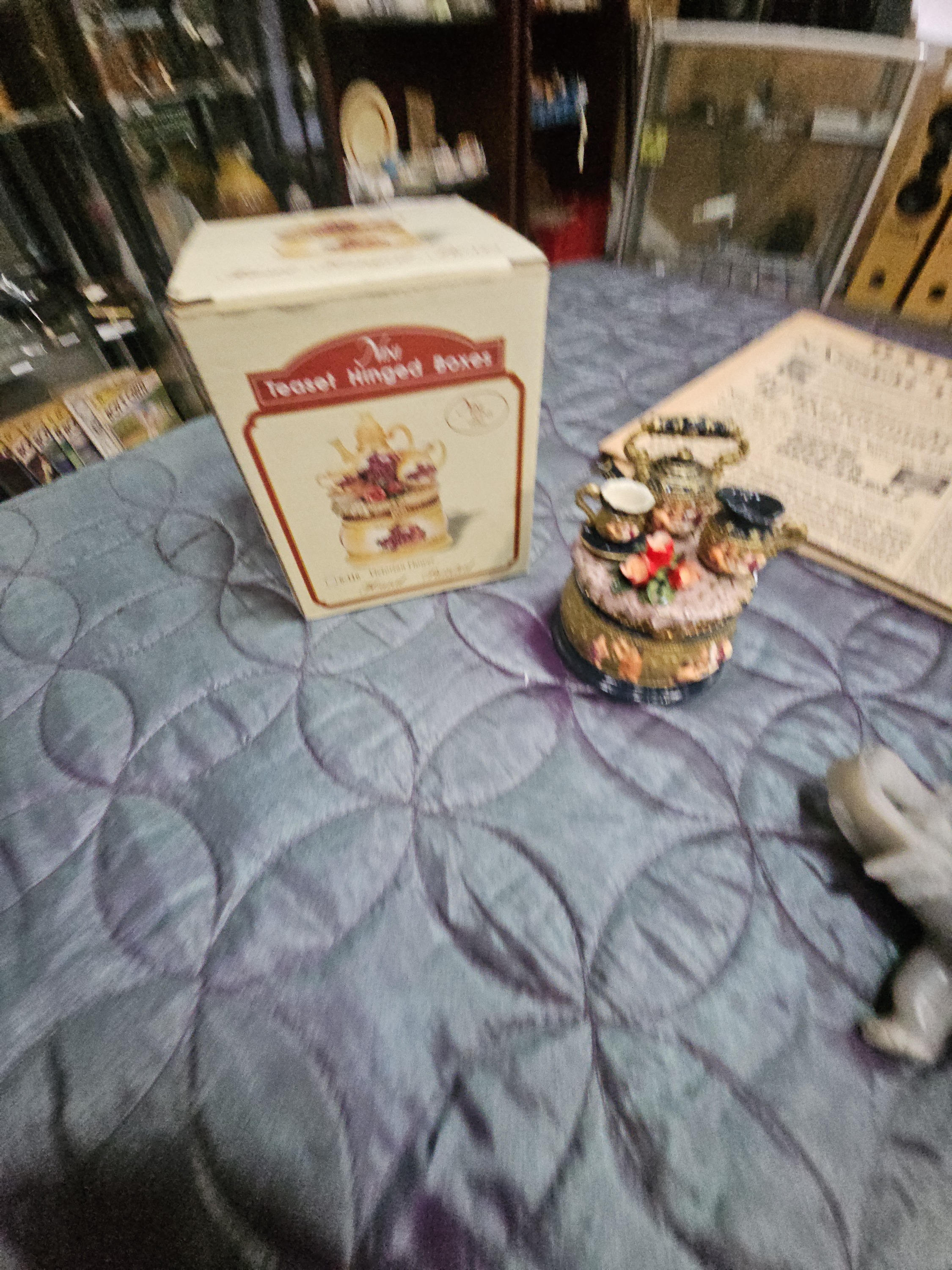 The items are in generally good condition. The newspaper exhibits expected age-related toning, creases, and minor wear to the edges. The jasperware box, miniature tea set, and stone figurines appear to be free from visible chips, cracks, or repairs. The original packaging for the miniature box shows minor shelf wear.