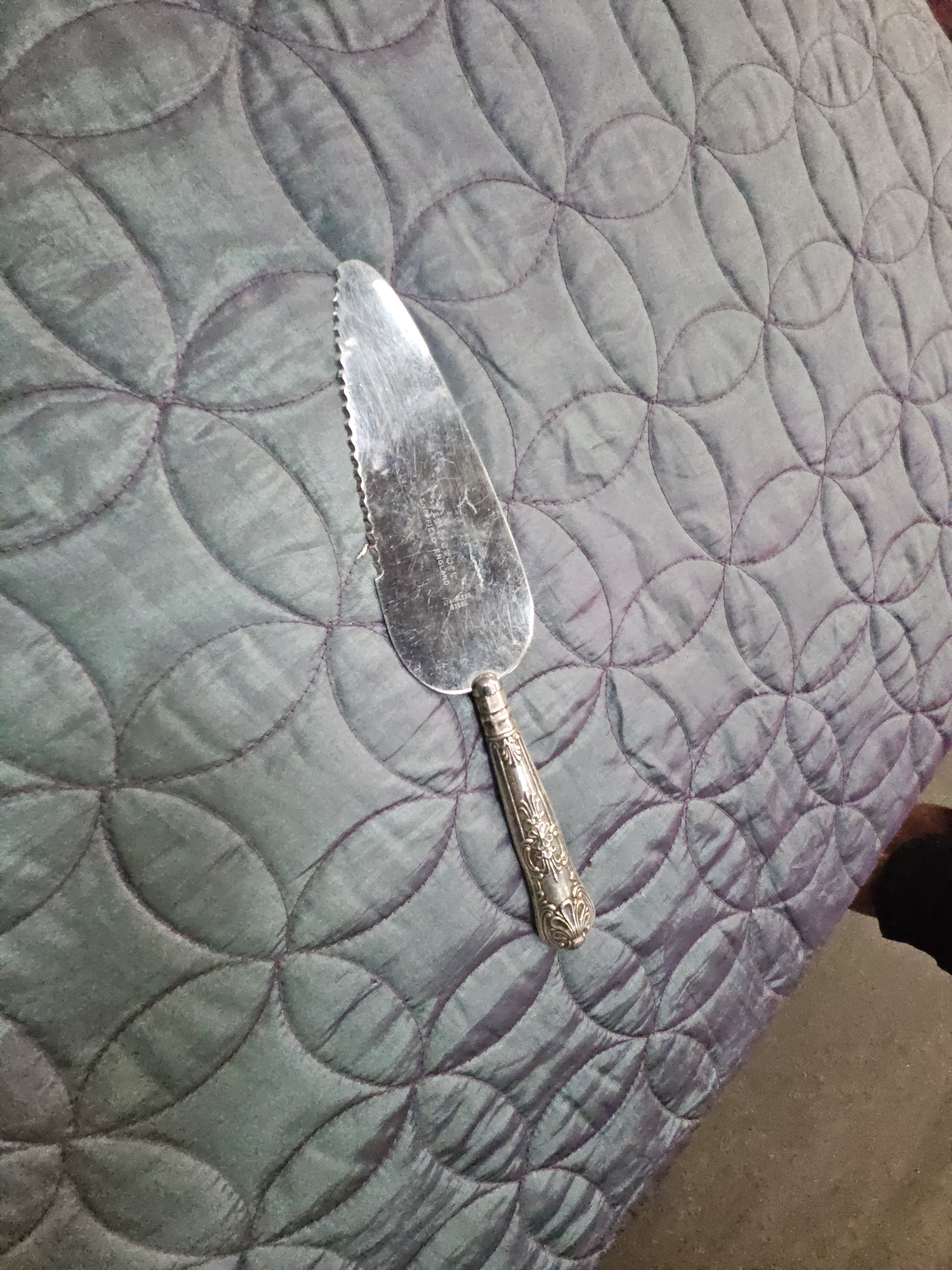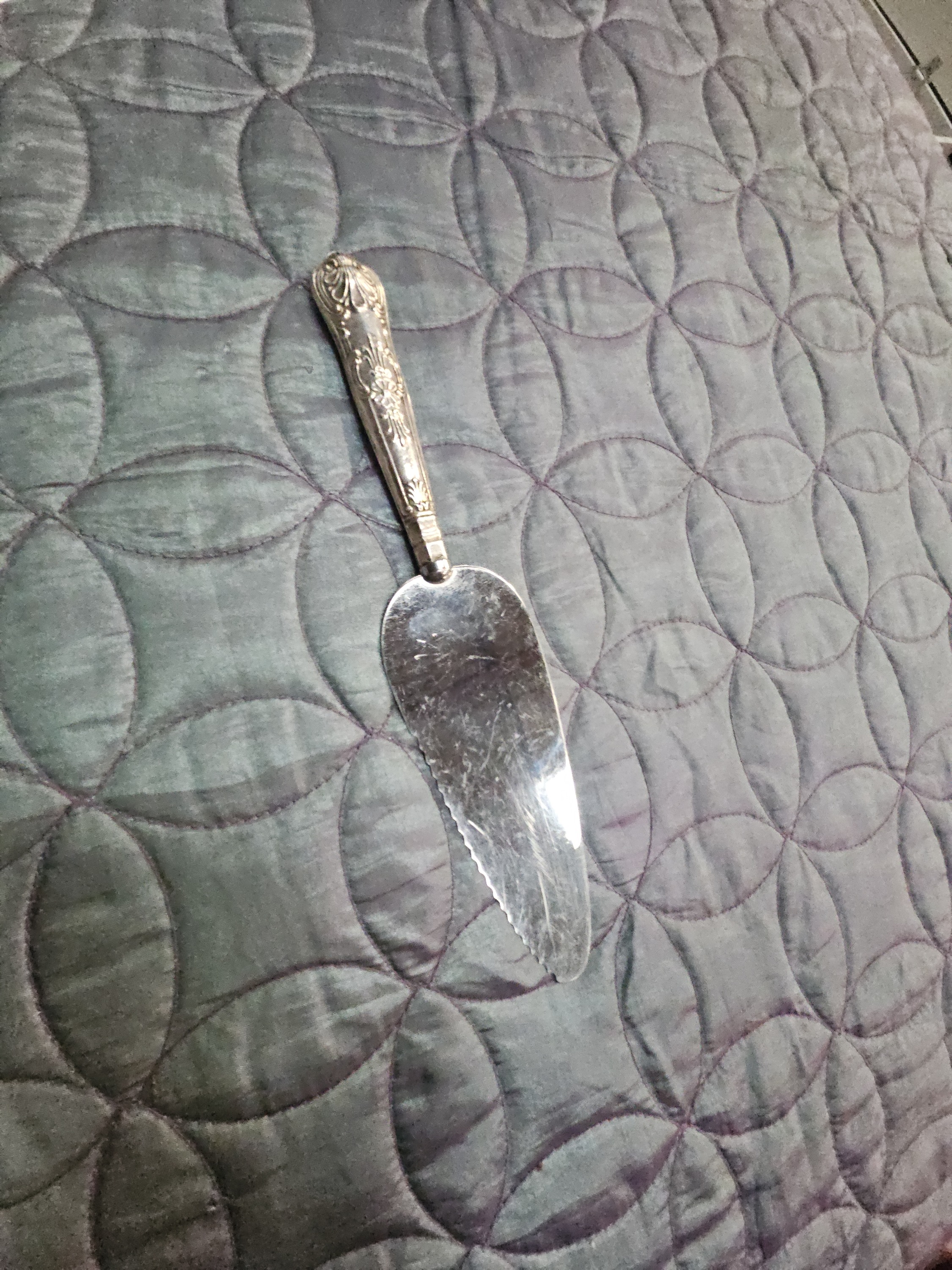 The server is in good vintage condition. The stainless steel blade exhibits surface scratches and light wear consistent with age and use. The silver handle shows natural tarnish, particularly within the recessed areas of the decorative pattern. There are no visible monograms or inscriptions.
