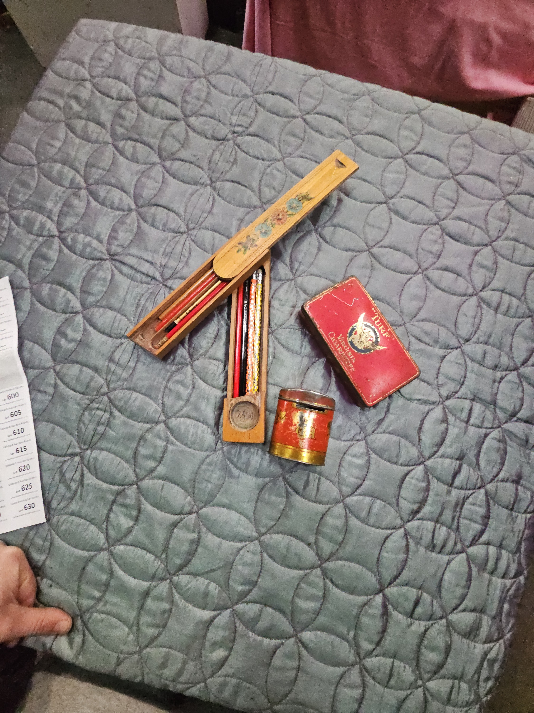 Lot 598: Three Vintage Items Comprising a Wooden Pencil Box and Two Lithographed Tins