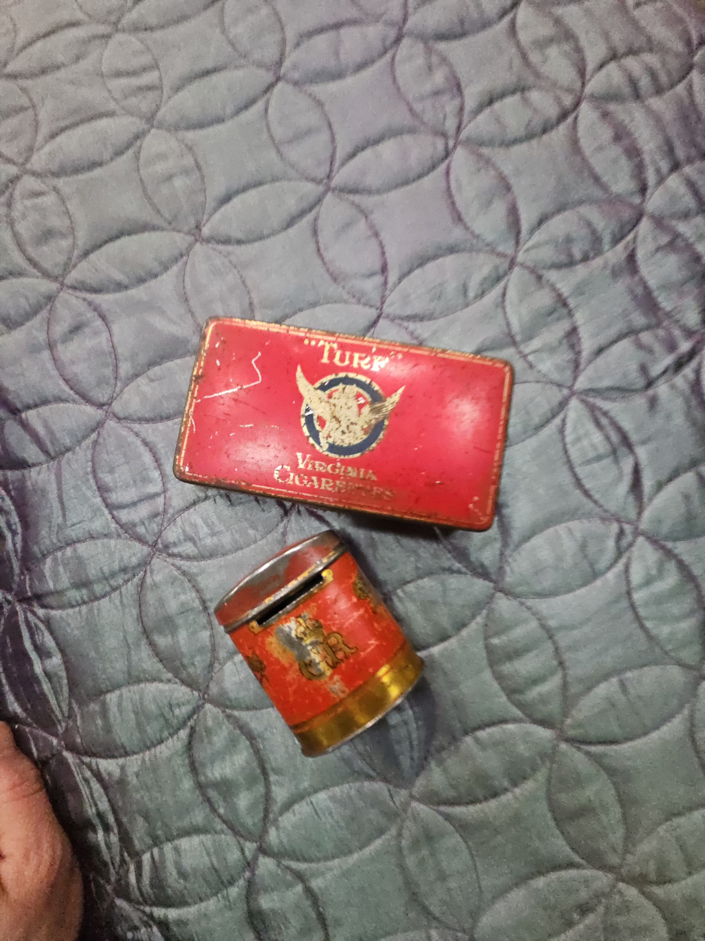 A collection of three vintage items including a wooden pencil box and two advertising tins. The wooden pencil box is constructed with a sliding lid decorated with a painted floral motif in shades of blue, yellow, and red. The interior base of the box features a circular indentation marked 1/2d, and the compartment contains several assorted pencils. The first tin is a rectangular red lithographed metal container for Turf Virginia Cigarettes, featuring a central winged emblem and brand typography. The second tin is a small cylindrical red lithographed money box with a top slot, decorated with a GR royal cypher beneath a crown, indicating the reign of King George V or VI.