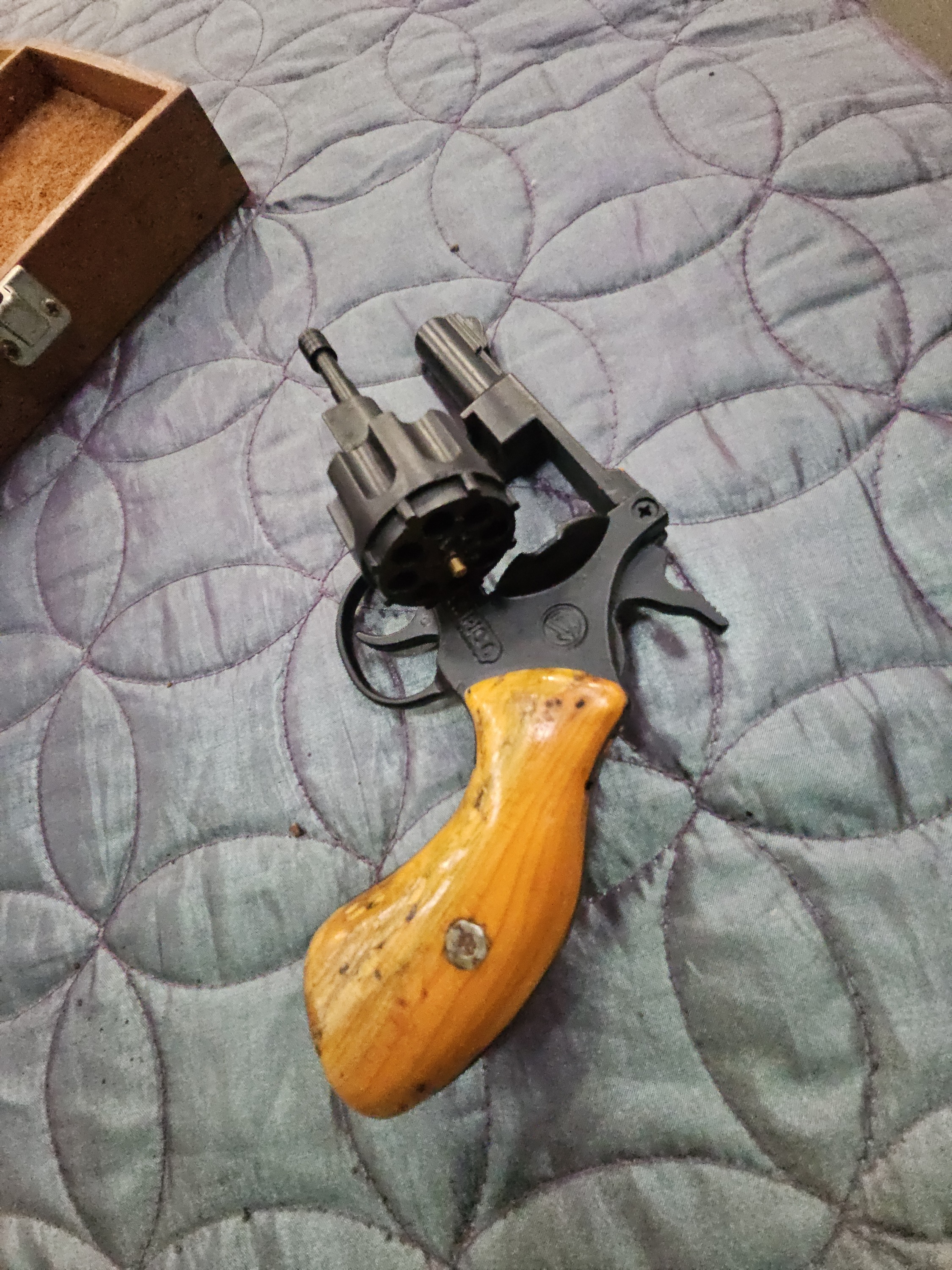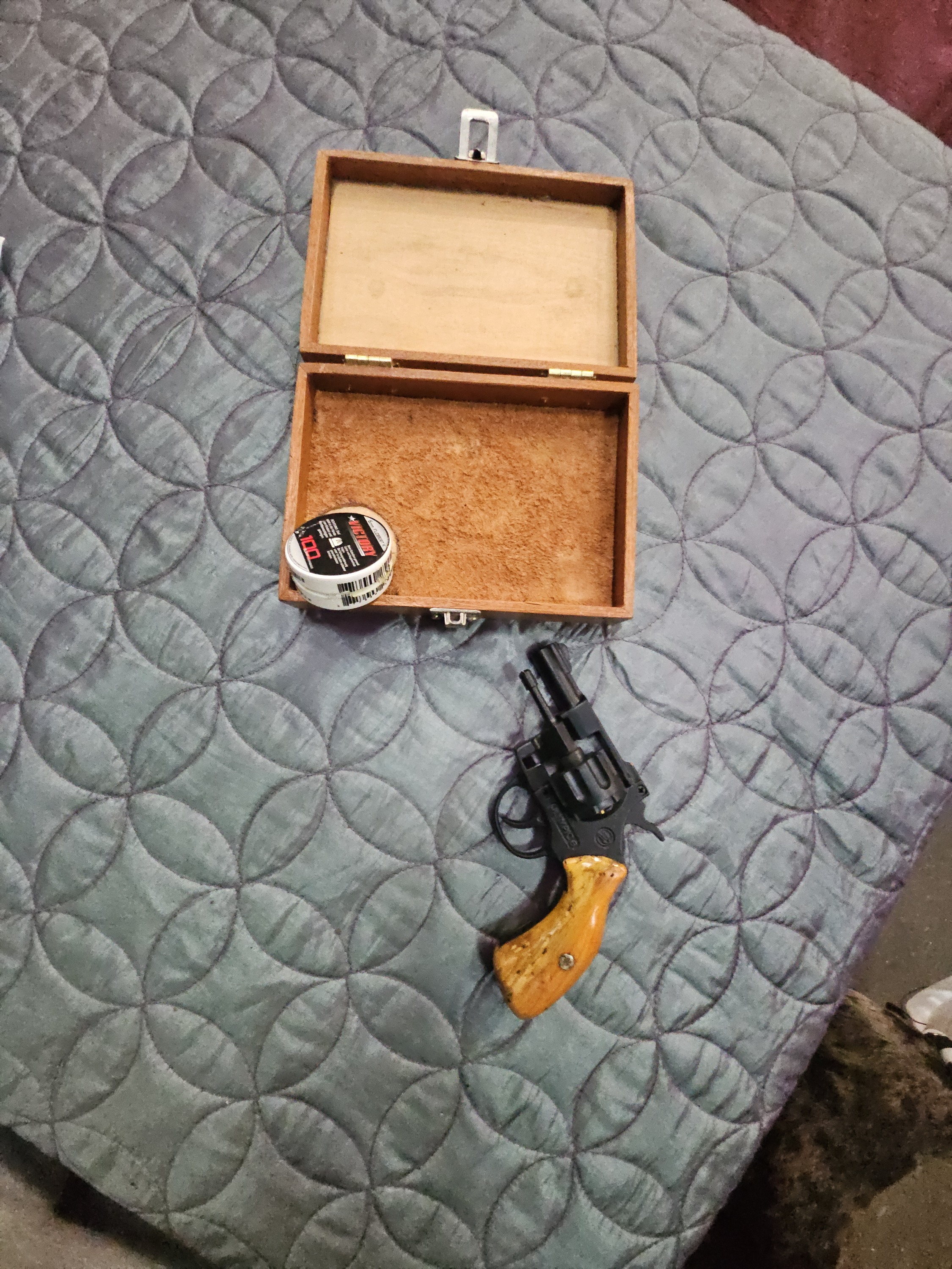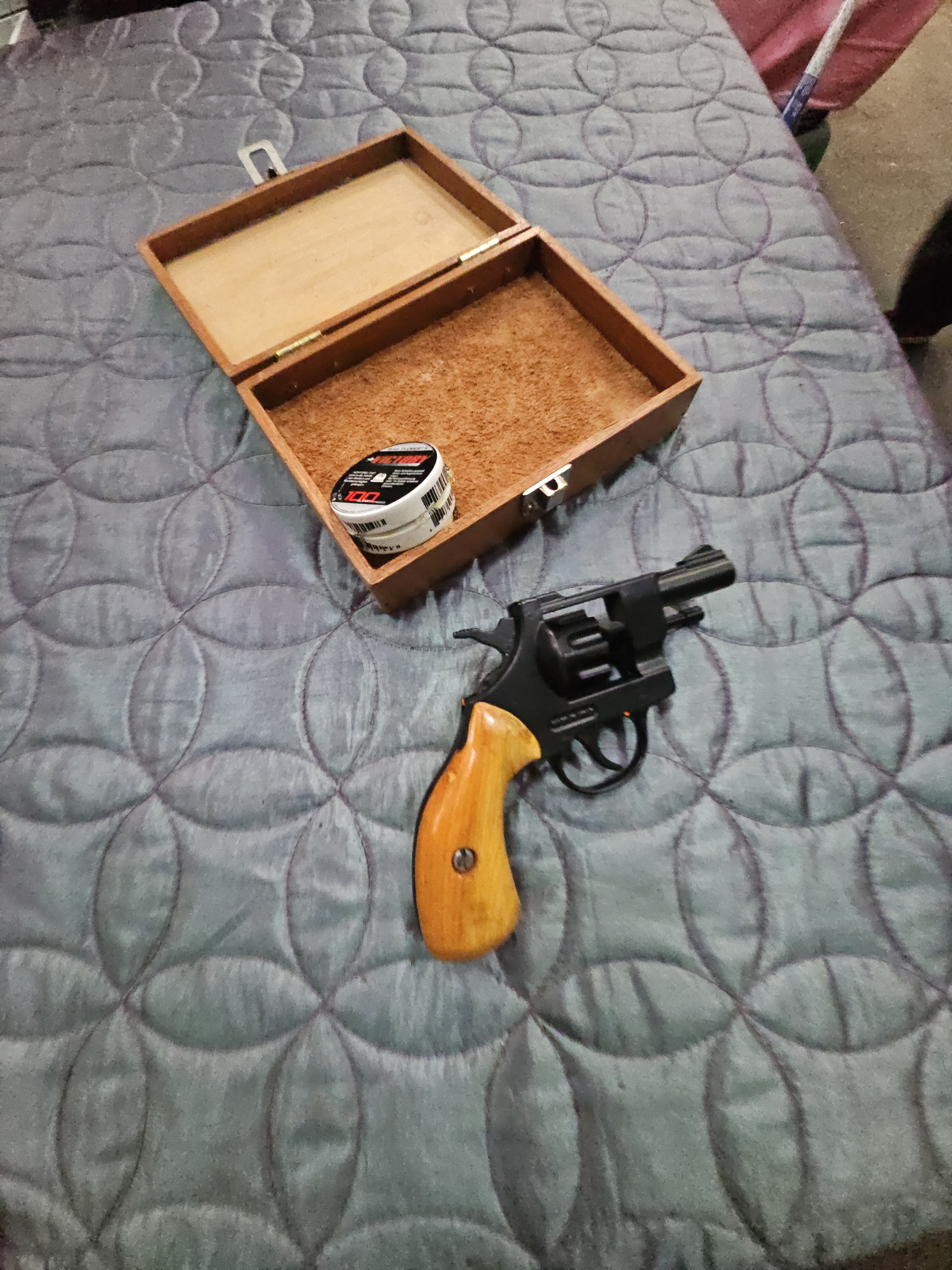 Metal - B Finish - B- Stock - B- Barrel - [not visible] Additional Comments: The revolver shows signs of light use, including minor surface wear to the black finish and small indentations on the wooden grips. Ammunition Condition: Tin label indicates a 100-count capacity; tin shows light shelf wear. Accessory Condition: Wooden box is functional with minor surface marks.