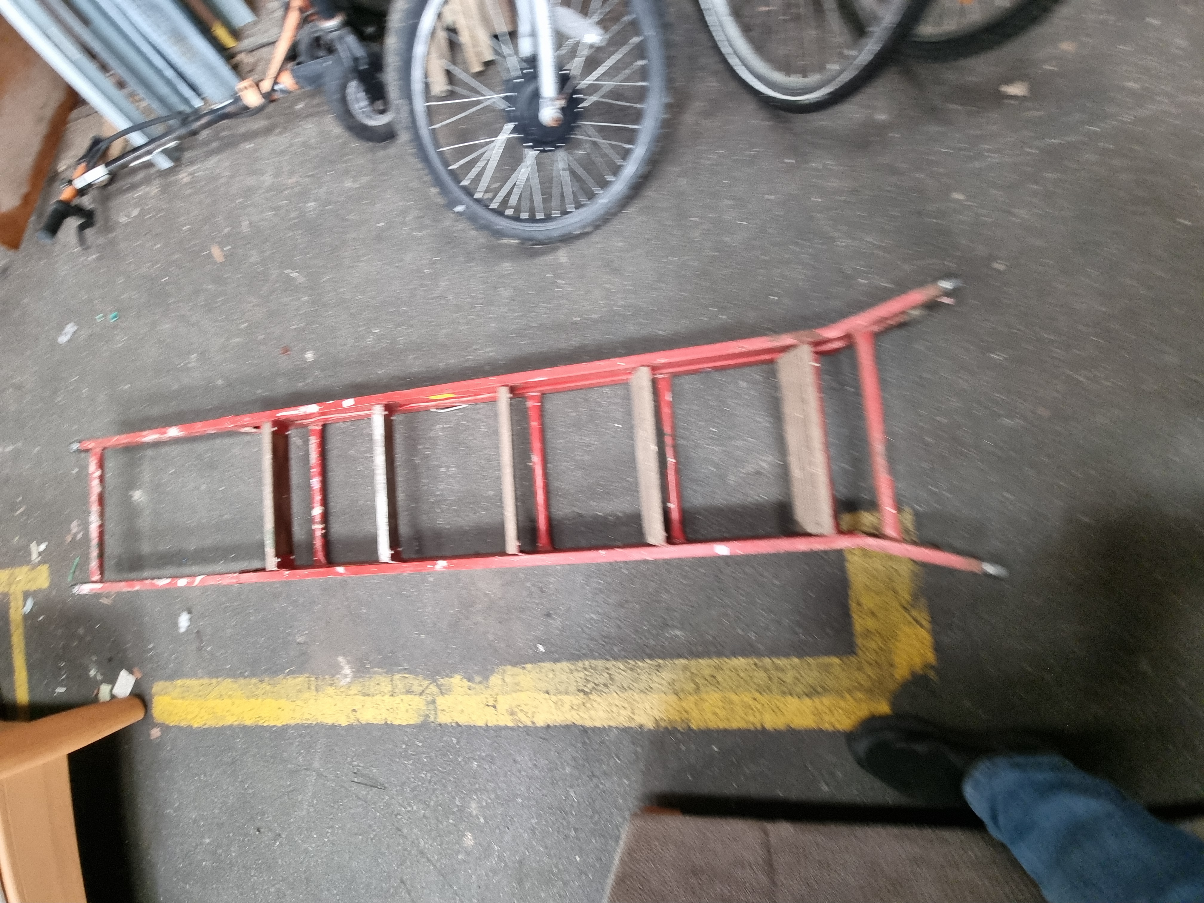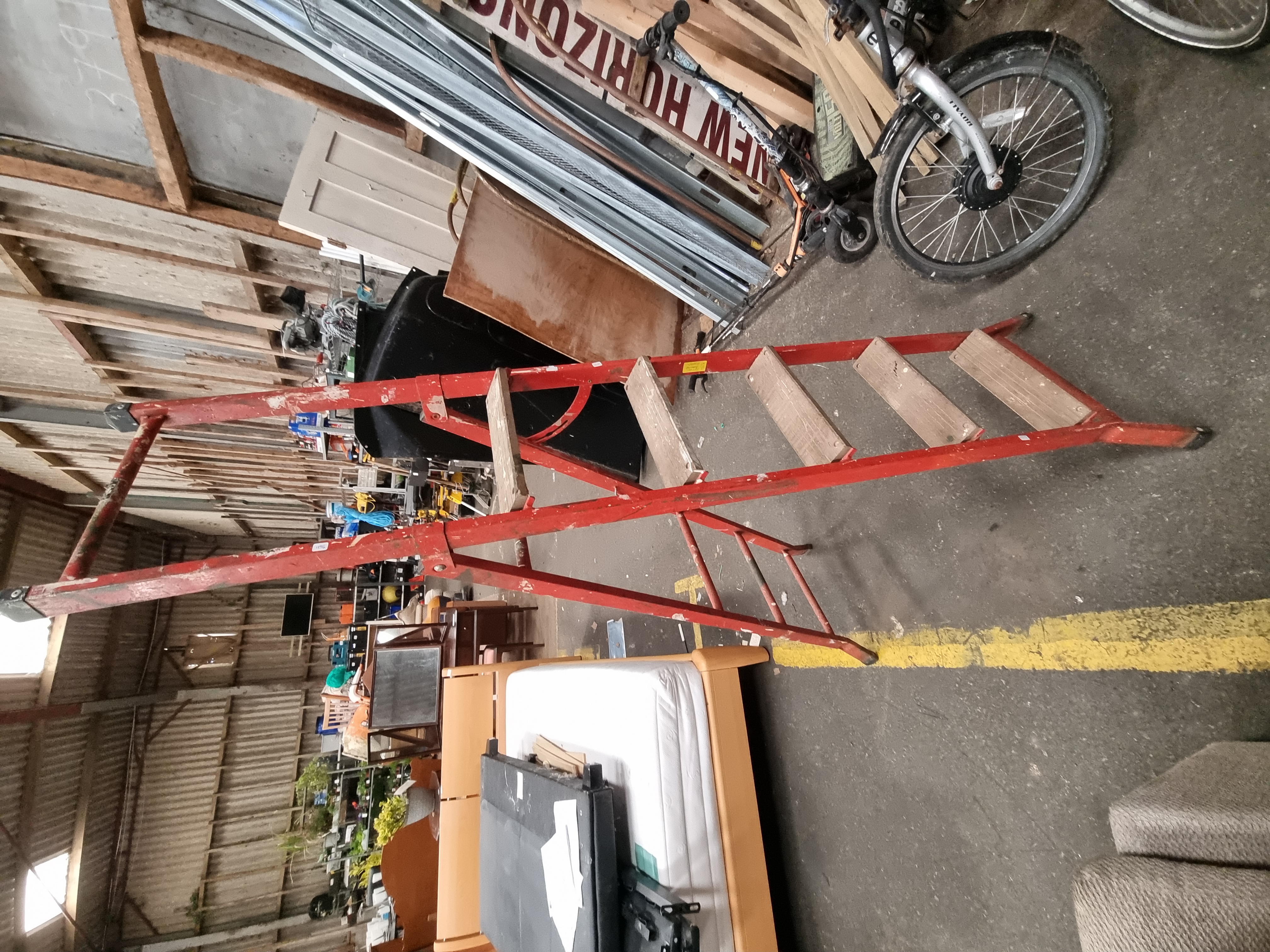 The item is in well-used condition. There is extensive paint loss and chipping to the red metal frame, with surface oxidation present in areas of exposed steel. The wooden treads show significant signs of wear, ingrained dirt, and heavy use. The overall structure remains intact; however, the ladder has not been tested for mechanical stability or load-bearing capacity. This item is sold as a collectable or decorative piece.