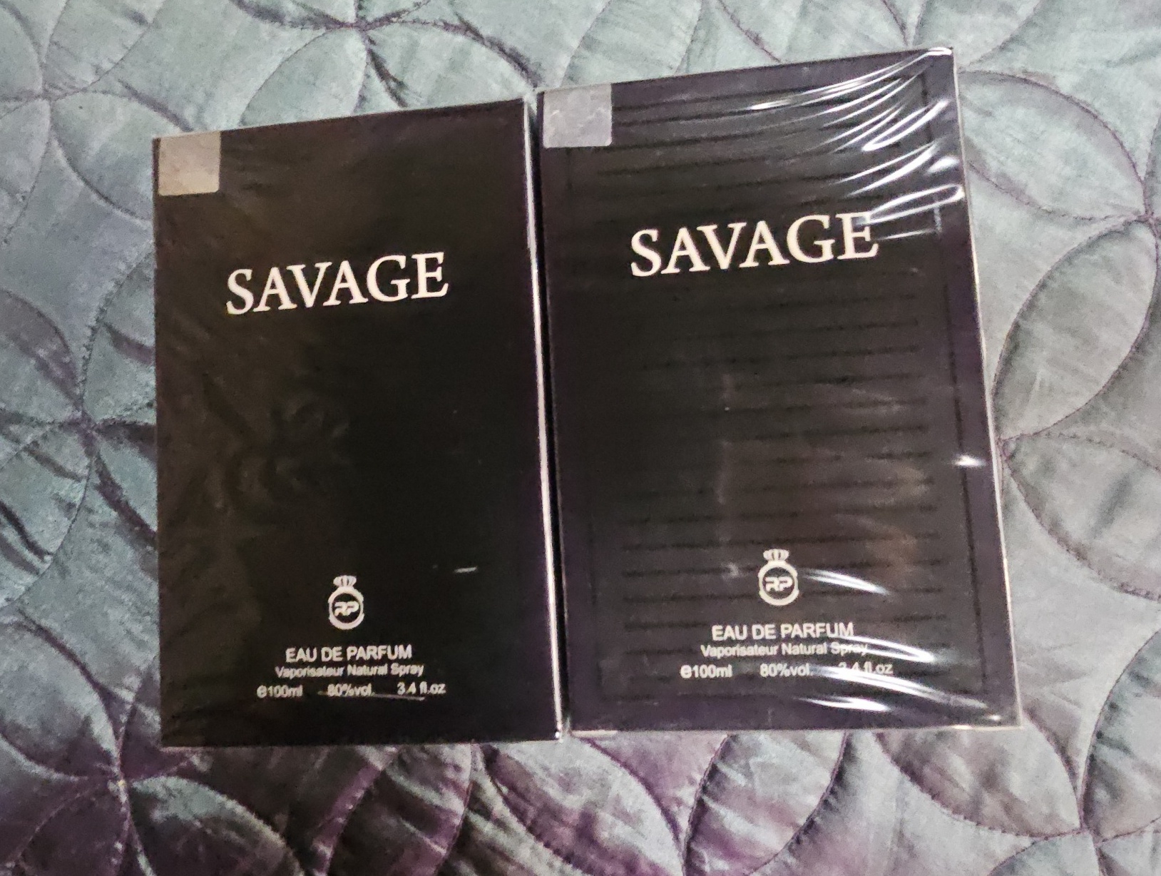 A pair of boxed fragrances marked SAVAGE. Each Eau de Parfum is presented in its original black cardboard packaging, sealed in clear protective plastic wrap. The front of each box features the name SAVAGE in white uppercase letters above a logo depicting a crown over a circle containing the letters RP. The packaging further identifies the contents as Vaporisateur Natural Spray and provides an alcohol content of 80% vol.