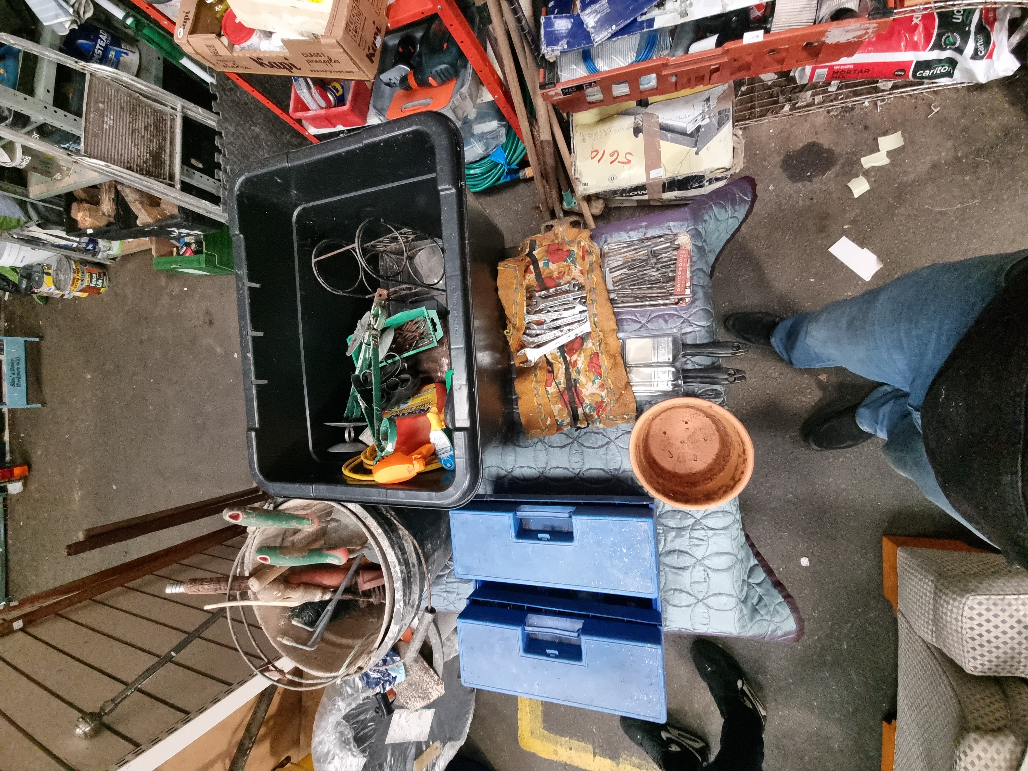 Lot 61: An Assortment of Workshop and Gardening Tools with an IRIS Remington Store-It-All Storage Bin