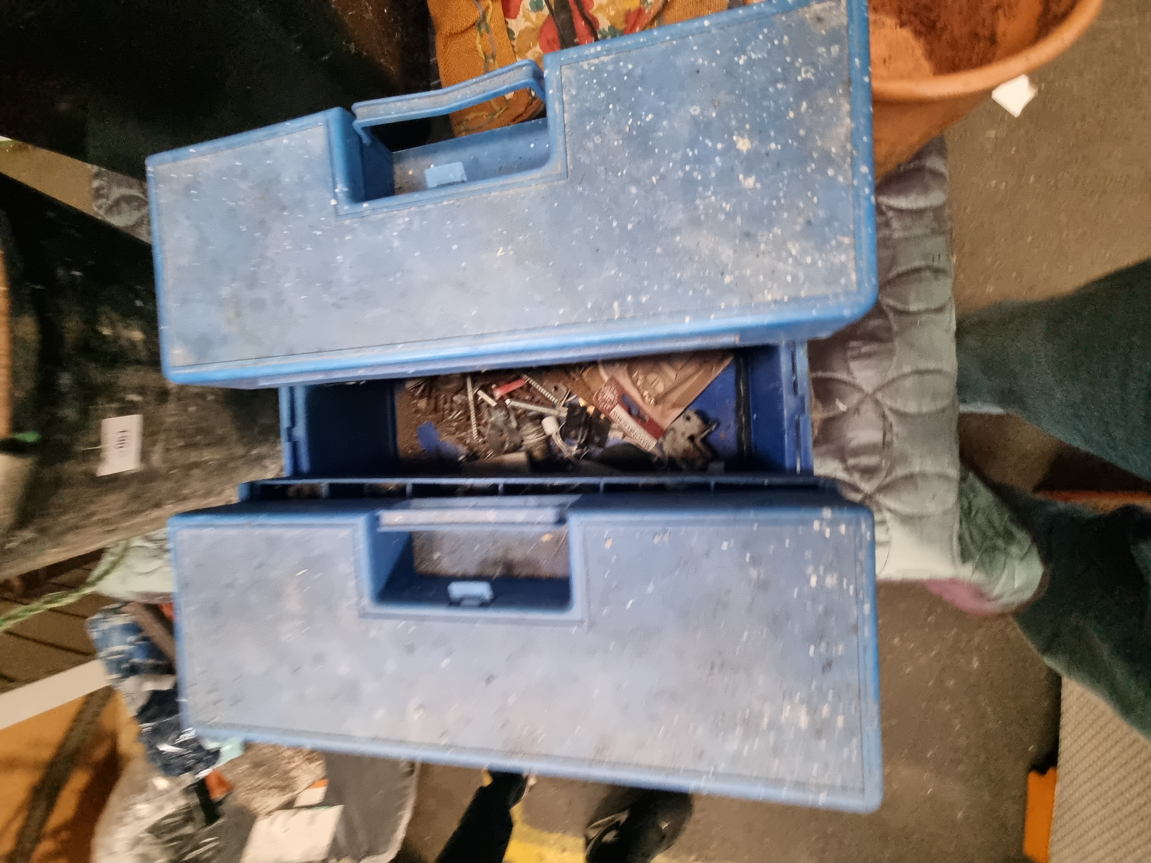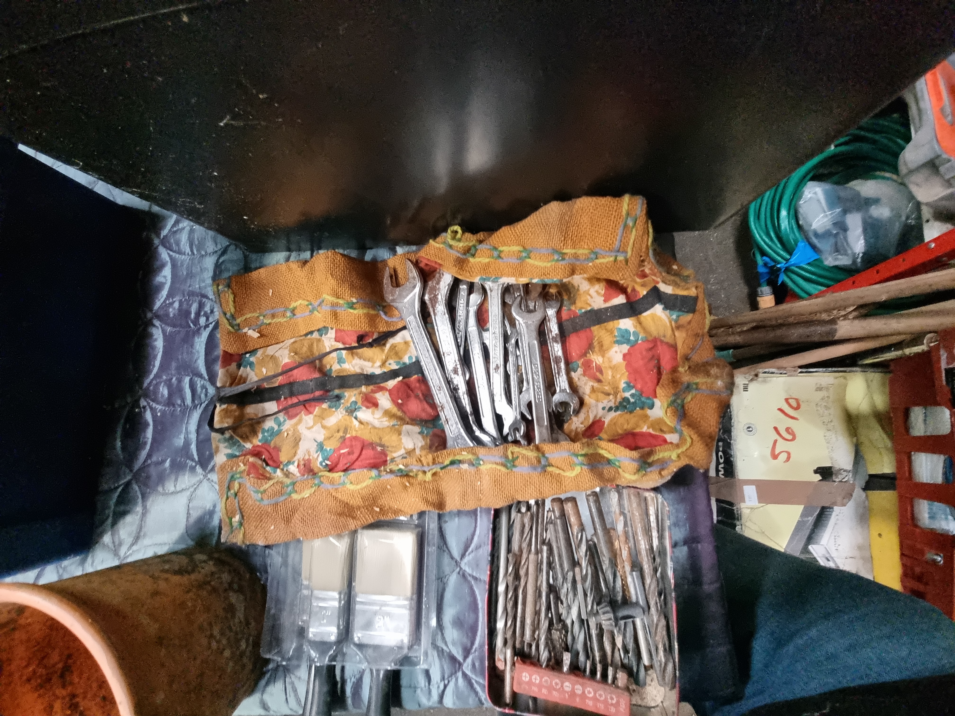 The items are in mixed condition. The paintbrushes remain in new, unused condition within their original packaging. The hand tools, spanners, and drill bits show clear signs of previous use, including surface dust and areas of minor oxidation or corrosion to metal components. The plastic storage containers and toolboxes exhibit typical wear, including scuffing, surface scratches, and dust. The completeness of tool sets and the functional status of all mechanical items are unverified.