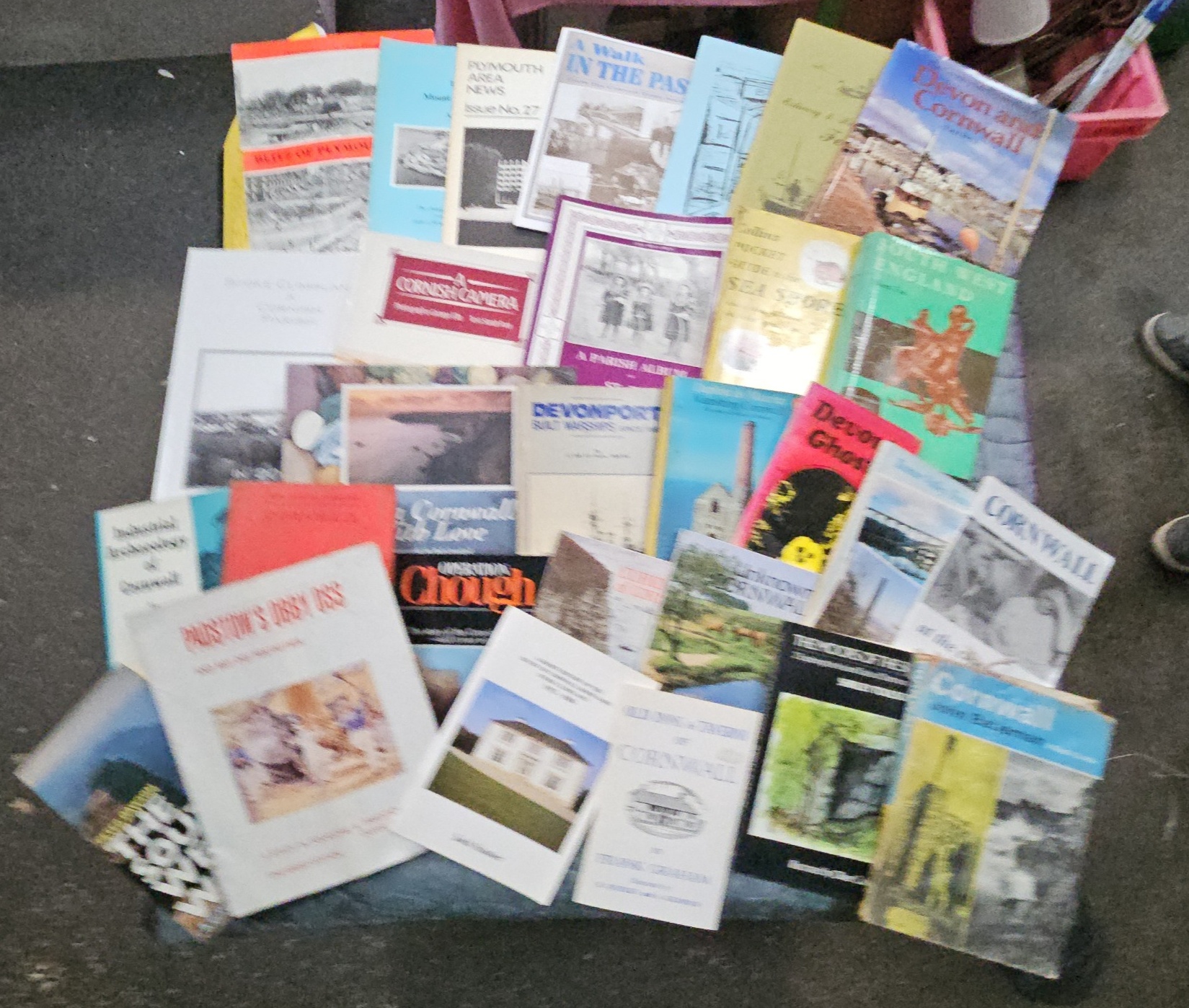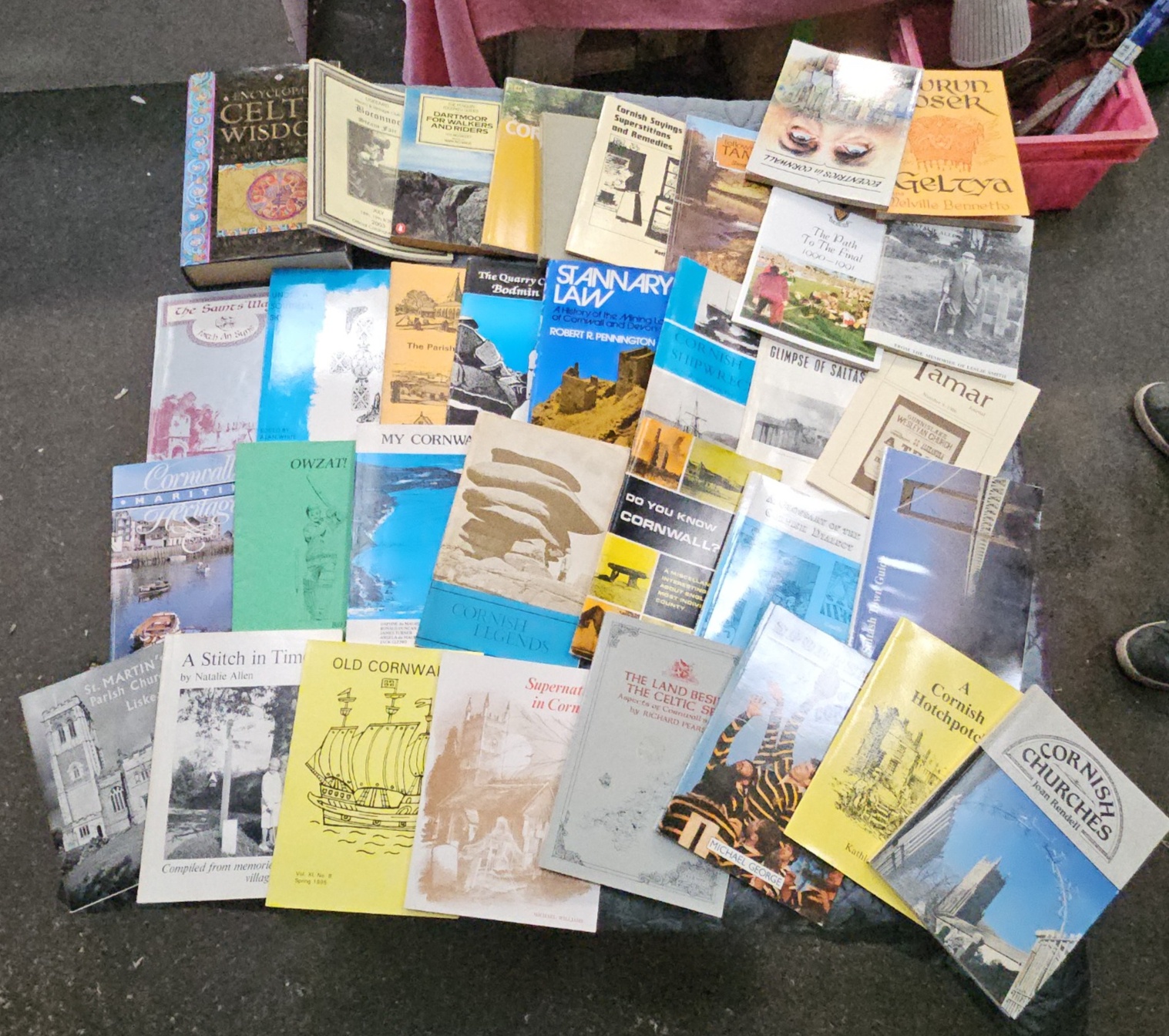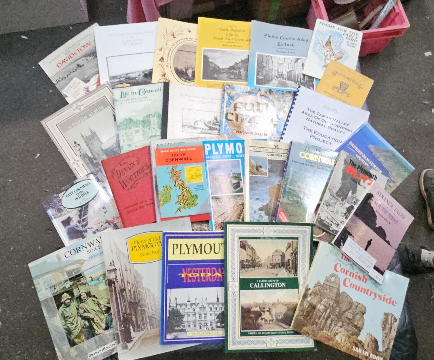 A collection of approximately 50-60 printed materials primarily focused on the history, topography, maritime heritage, and folklore of Cornwall, Devon, and Plymouth. The assortment comprises a variety of formats including hardcover volumes, softcover booklets, staple-bound pamphlets, and trade paperbacks, many issued by small local presses.