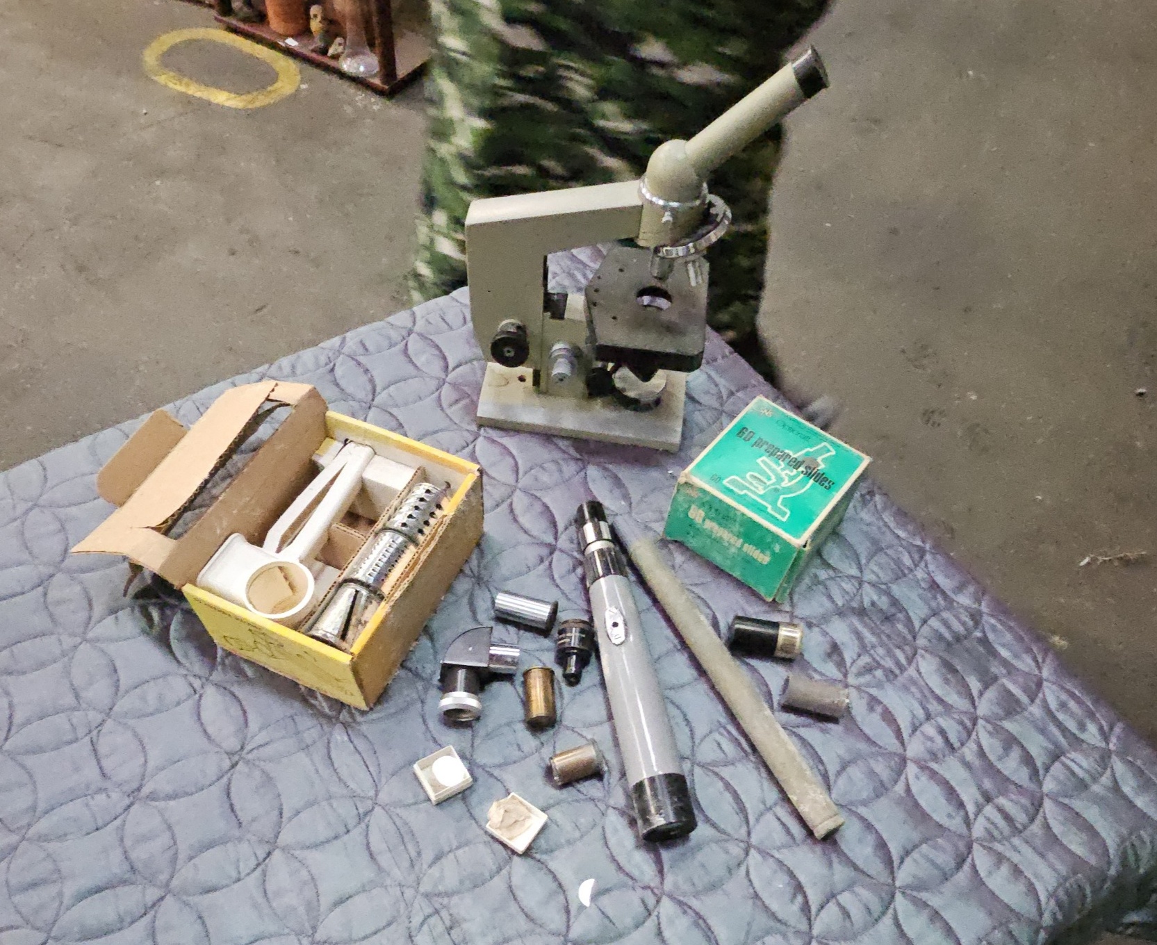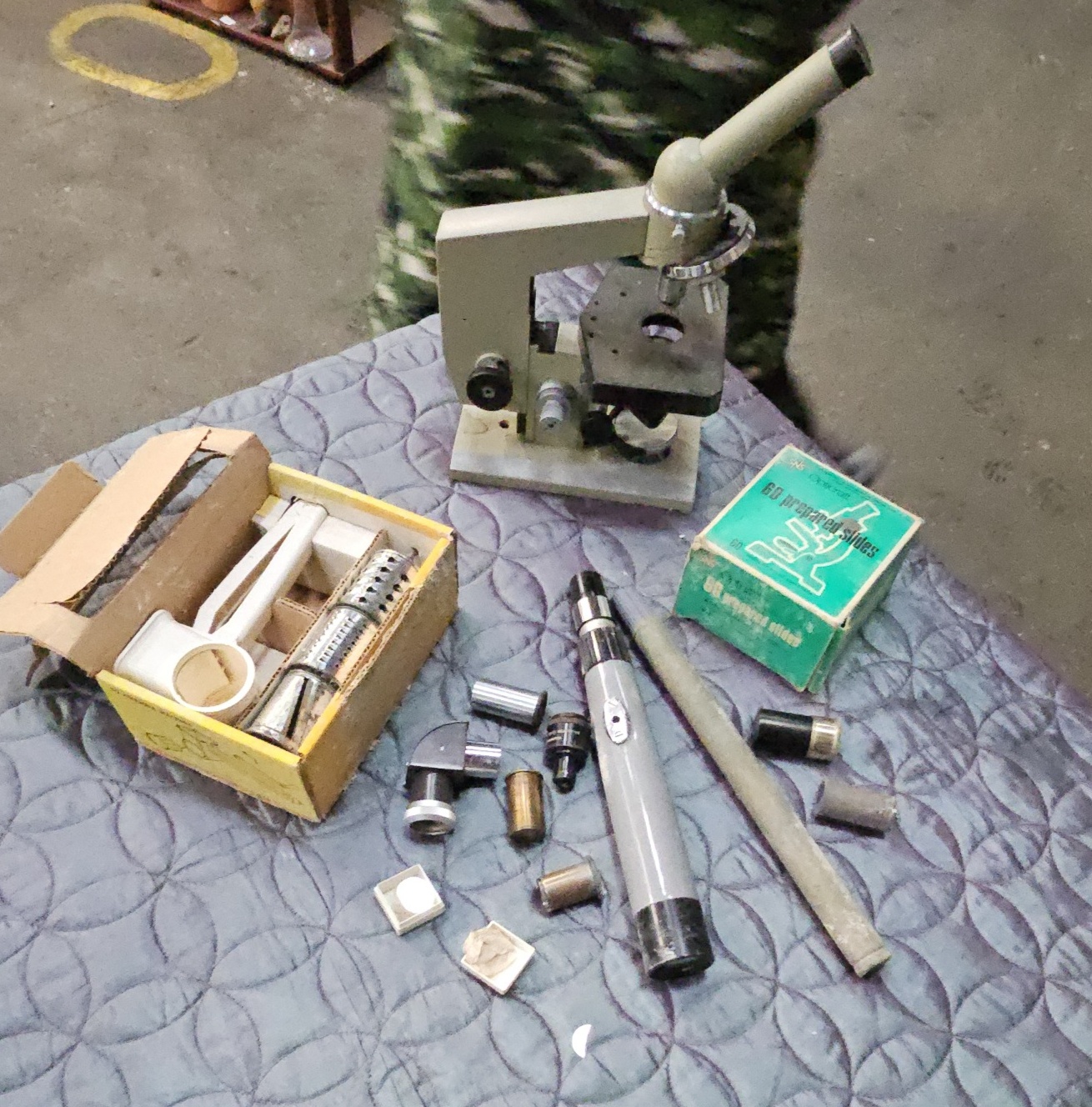 The items are in used condition with surface wear, scuffs, and signs of oxidation consistent with age and handling. The mechanical operation of the microscope focusing rack and the optical integrity of the lenses have not been tested. The completeness of the lens sets and accessories is unverified. The cardboard packaging for the slides and the kitchen accessory shows significant shelf wear, staining, and structural damage.