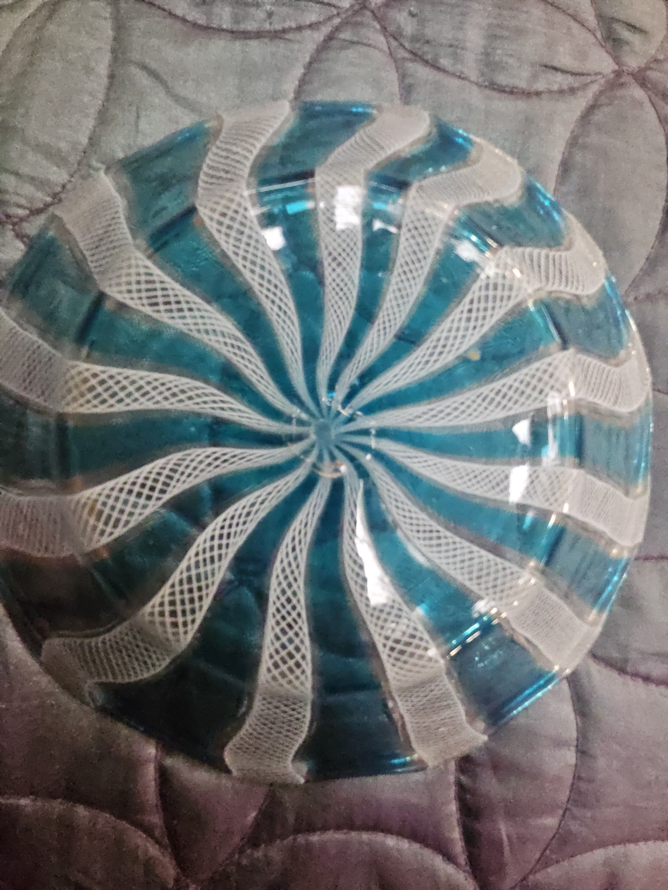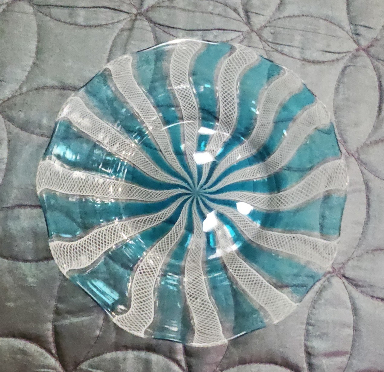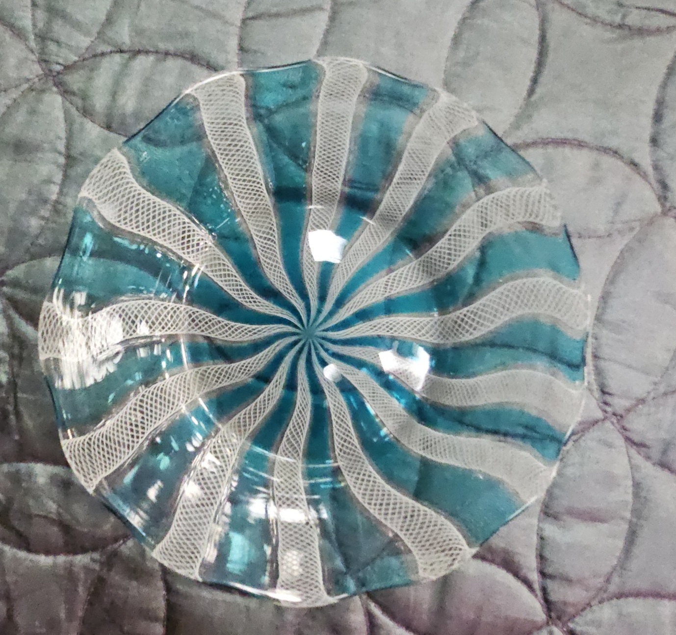 An art glass bowl attributed to Salviati, Murano, dating to the mid-20th century. The piece is constructed using the zanfirico technique, a form of filigrana glassworking. It features alternating canes of opaque white latticino lace-work and transparent aquamarine glass arranged in a radiating spiral pattern from the centre. The bowl has a shallow circular form with a slightly undulated rim and a polished finish. No signatures, marks, or labels are visible.
