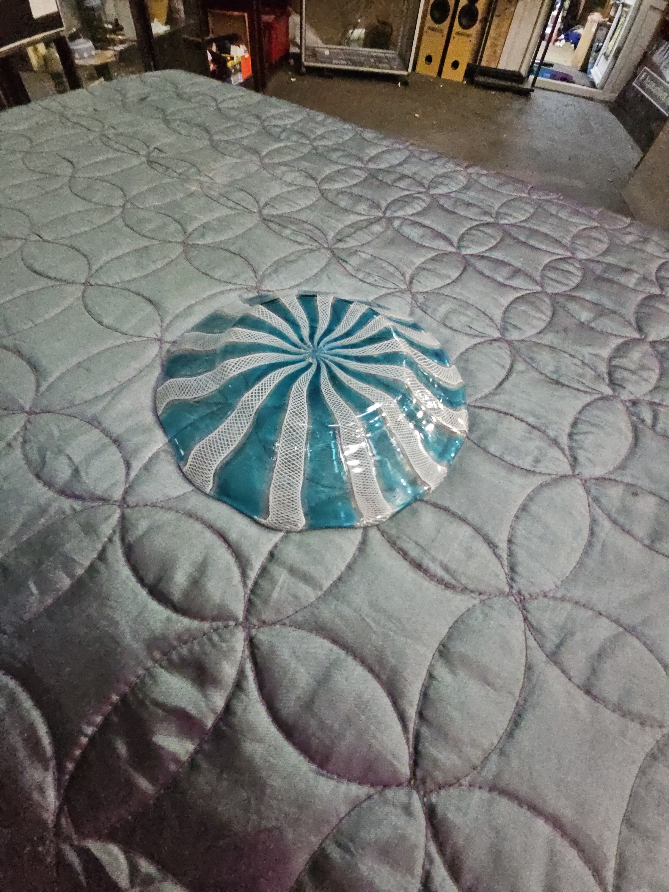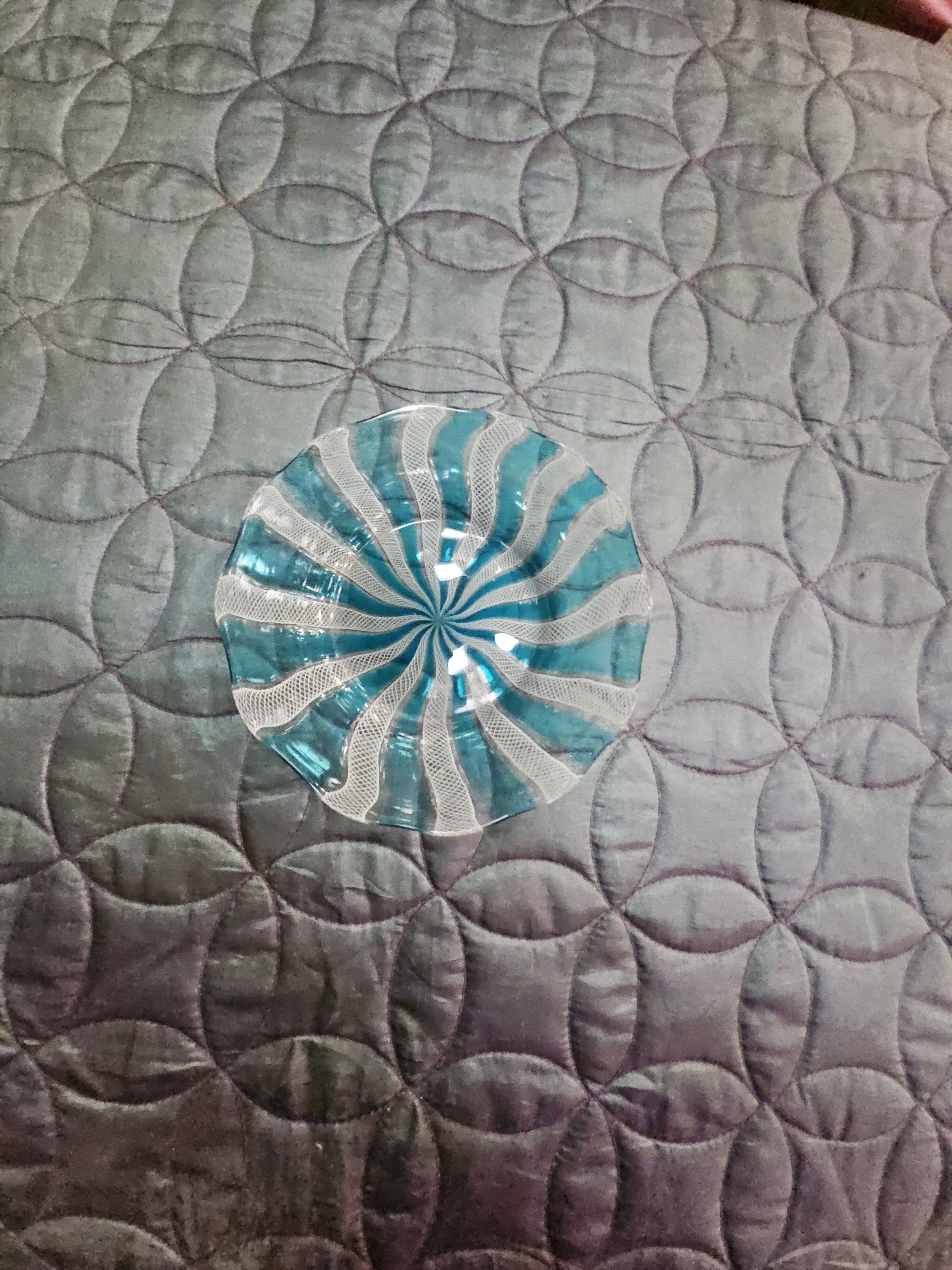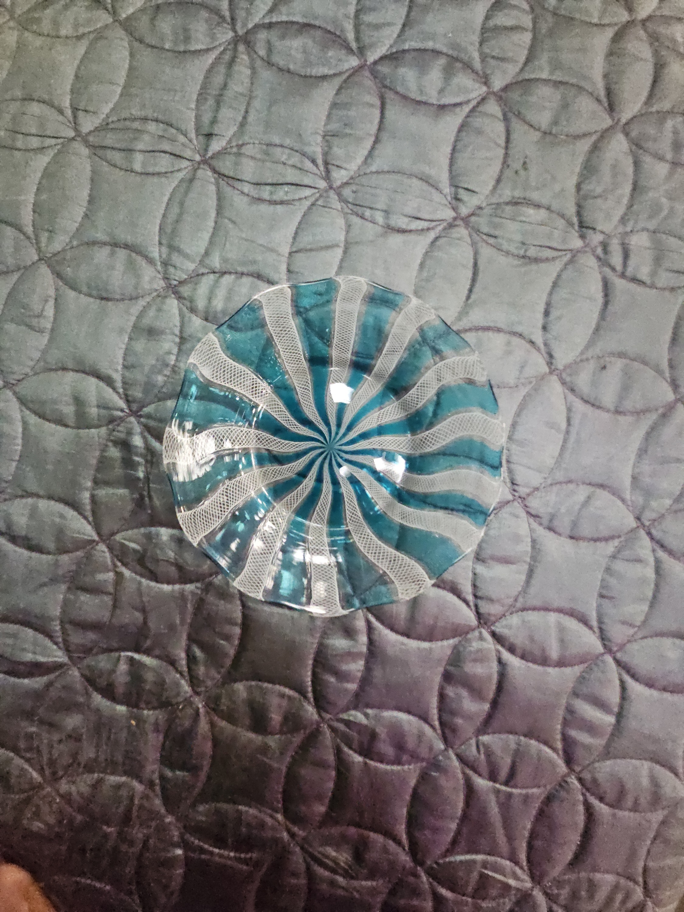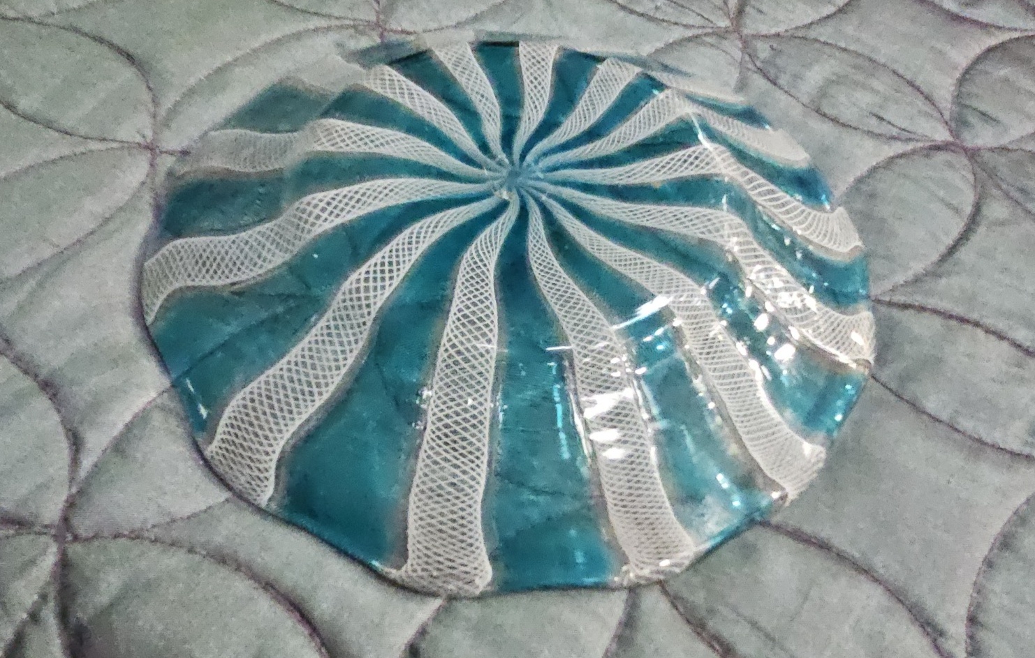 An art glass bowl attributed to Salviati, Murano, dating to the mid-20th century. The piece is constructed using the zanfirico technique, a form of filigrana glassworking. It features alternating canes of opaque white latticino lace-work and transparent aquamarine glass arranged in a radiating spiral pattern from the centre. The bowl has a shallow circular form with a slightly undulated rim and a polished finish. No signatures, marks, or labels are visible.