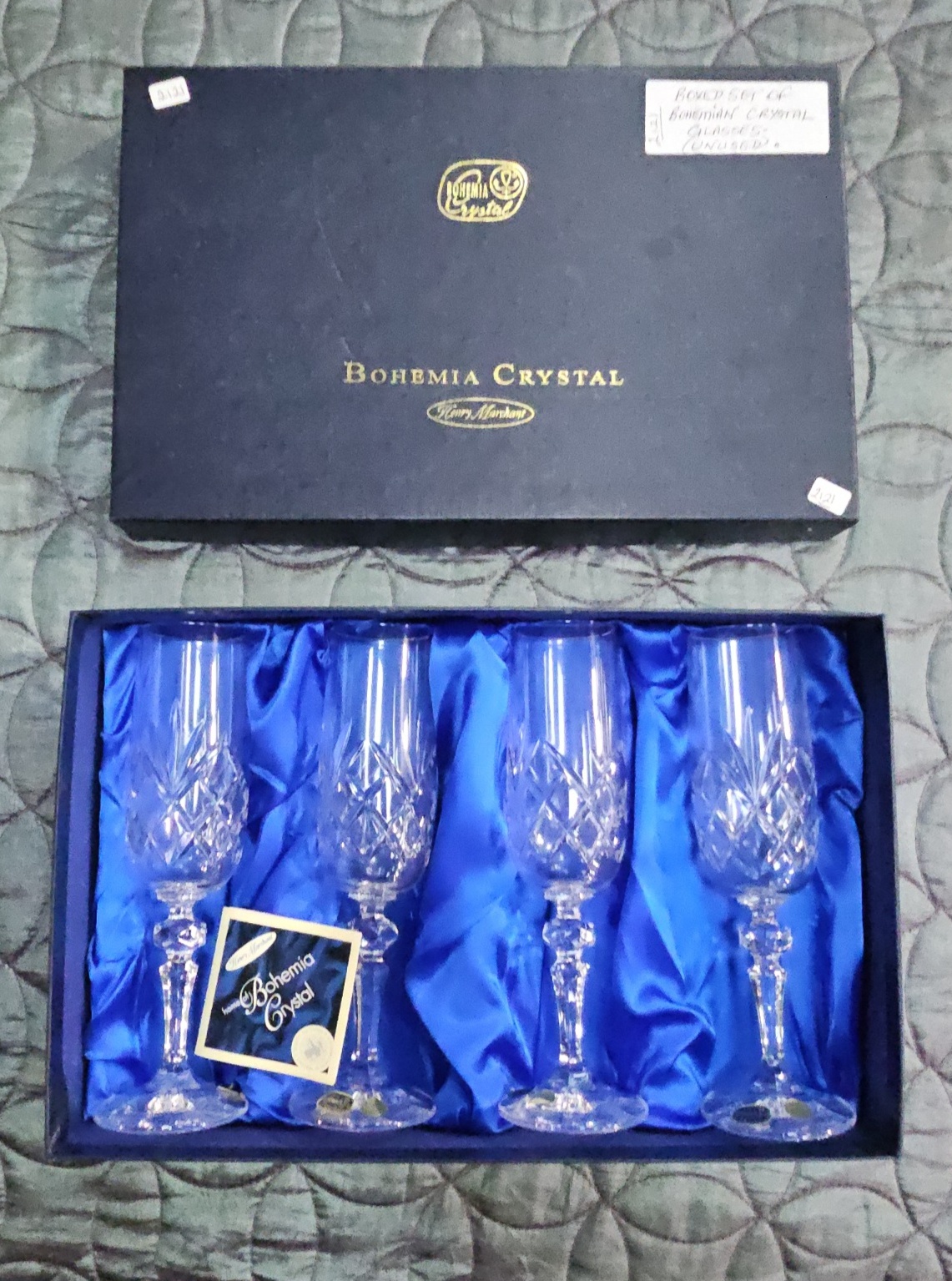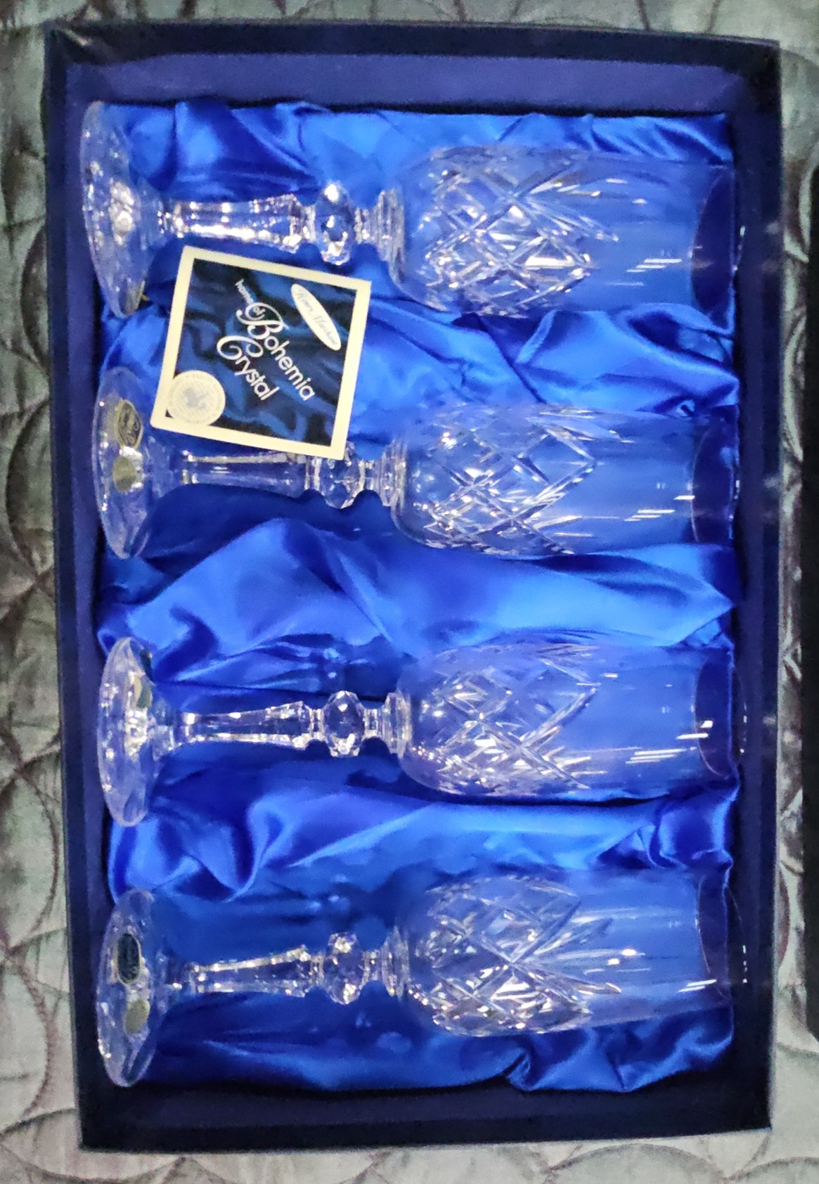 Lot 628: A Set of Four Bohemia Crystal Champagne Flutes Distributed by Henry Marchant
