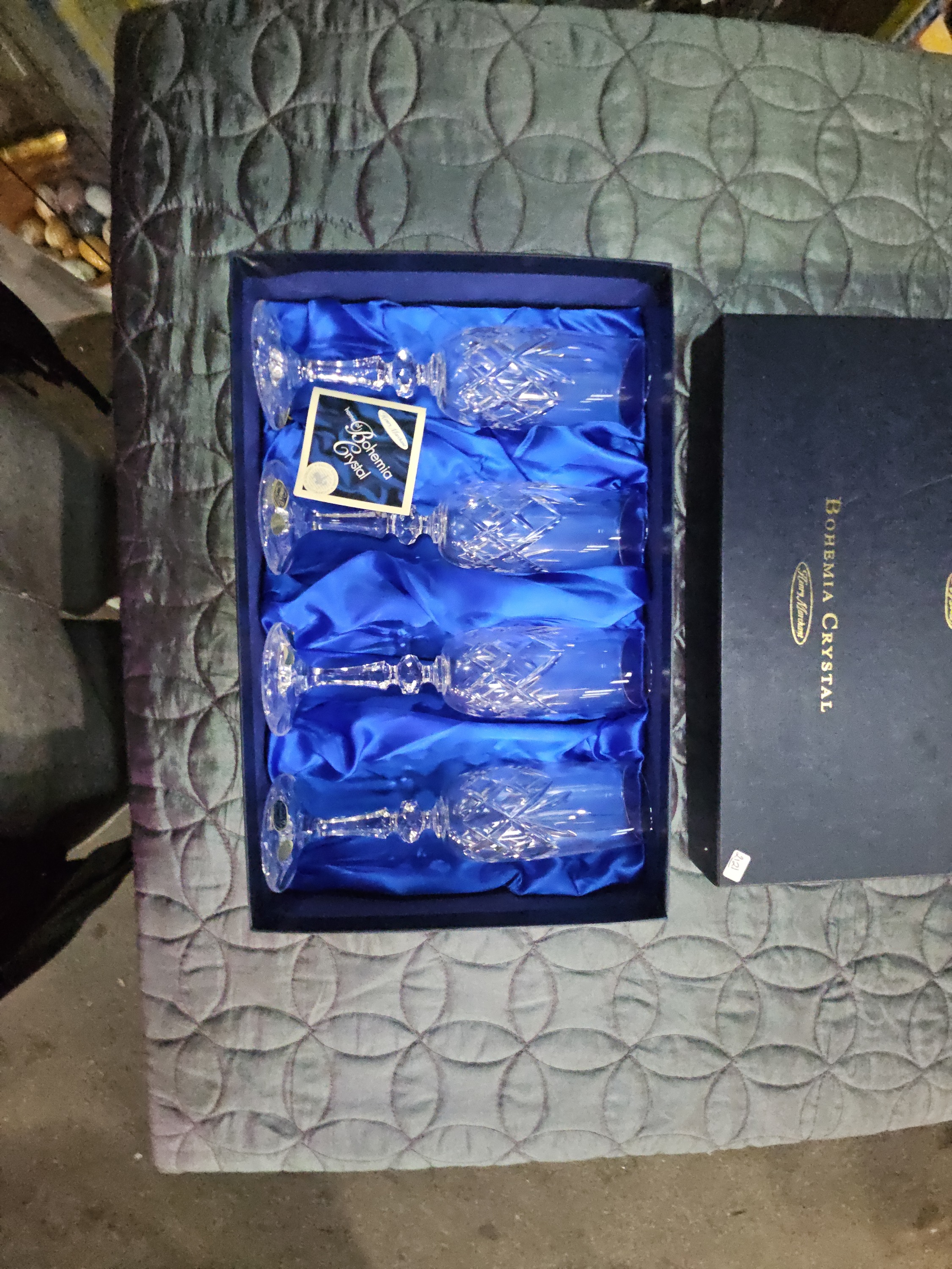 The glasses are in excellent, unused condition with no visible chips, cracks, or internal cloudiness. The presentation box is in good condition with only minor shelf wear consistent with storage.